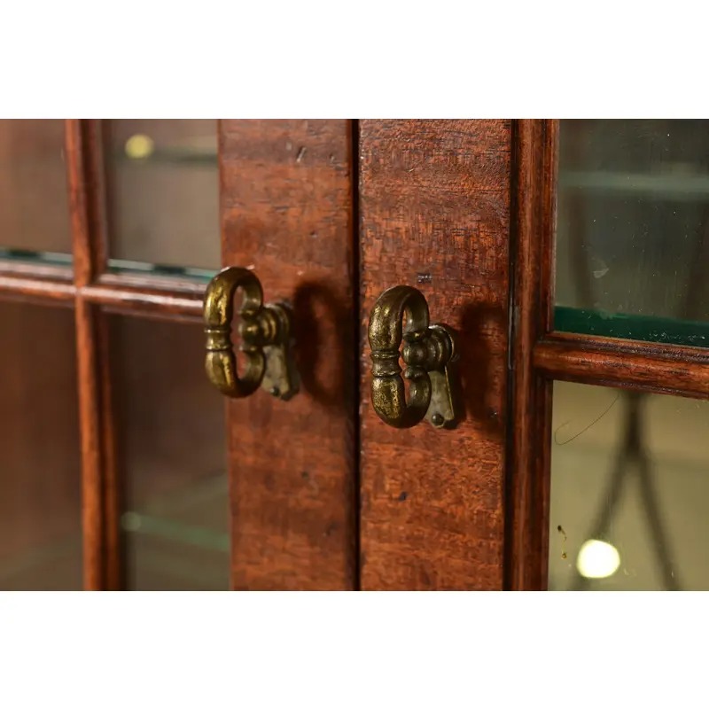 Carved mahogany, with mullioned glass front doors, mirrored interior, and original brass hardware. Interior shelves are adjustable and removable.