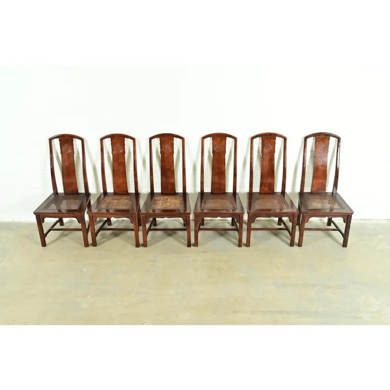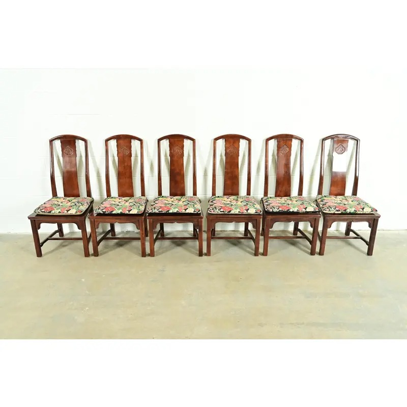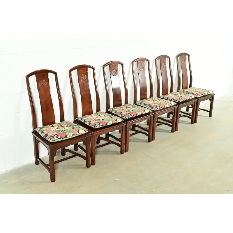 Henredon Hollywood Regency Chinoiserie Sculpted Mahogany Dining Chairs, Set of Six