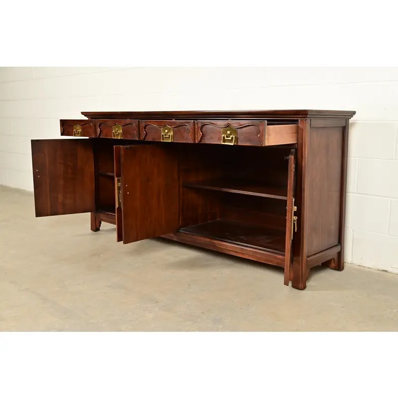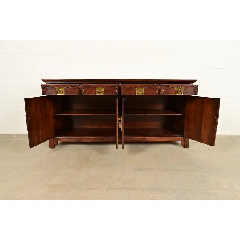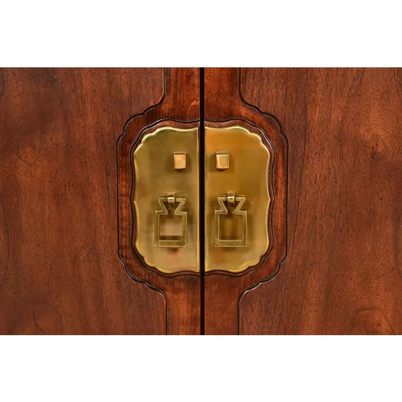 Beautiful sculpted walnut, with Asian-inspired brass hardware. Interior shelves are removable and adjustable.