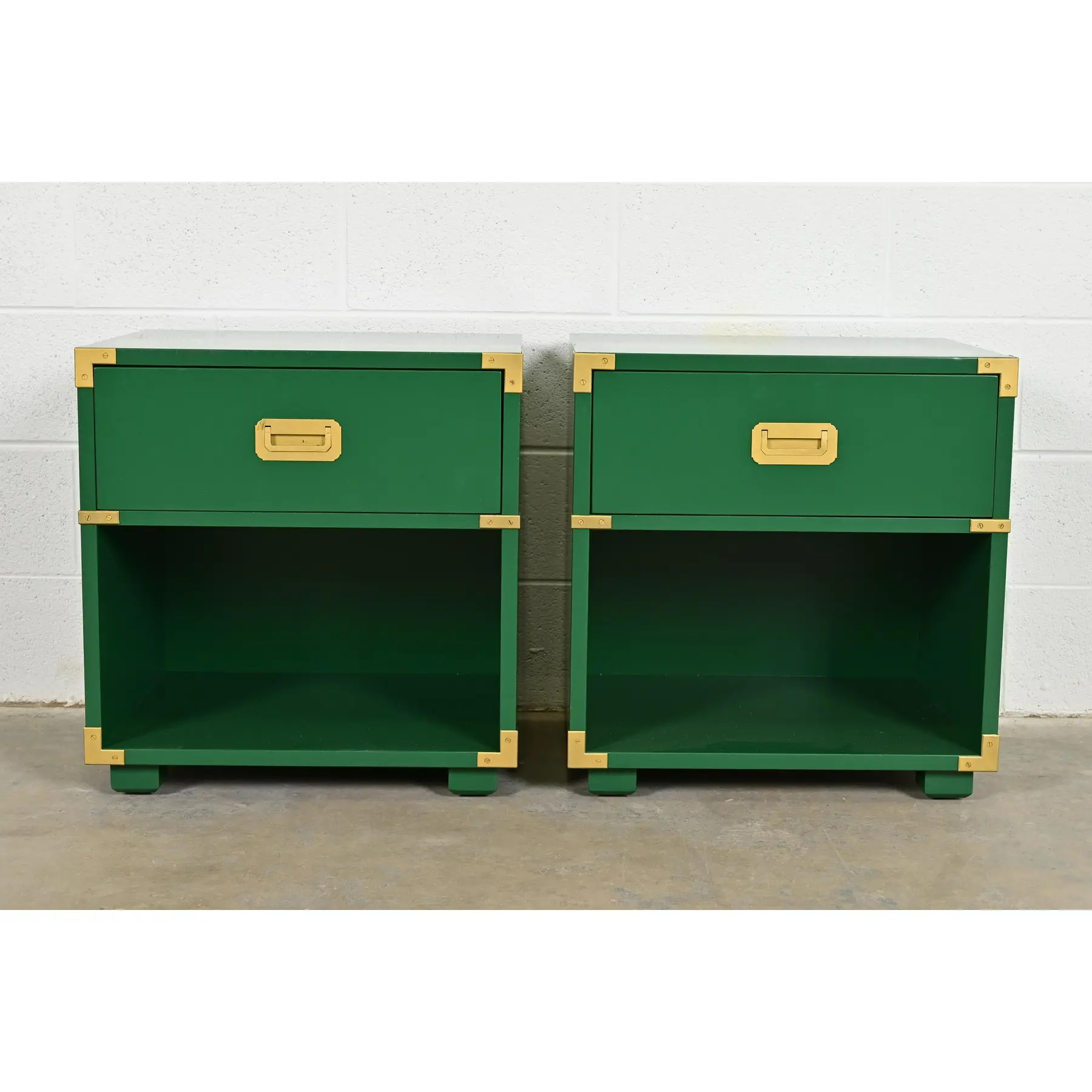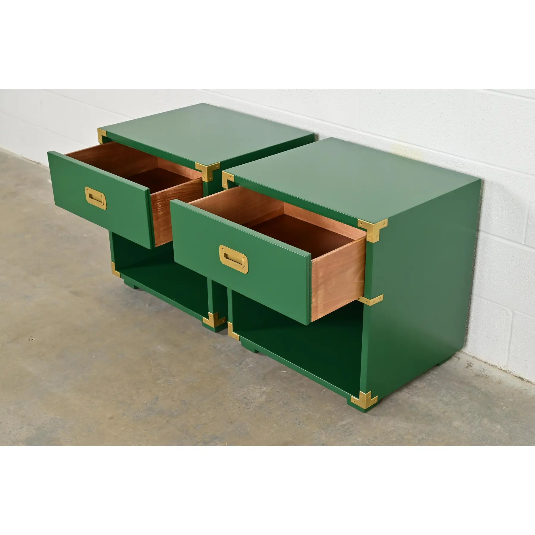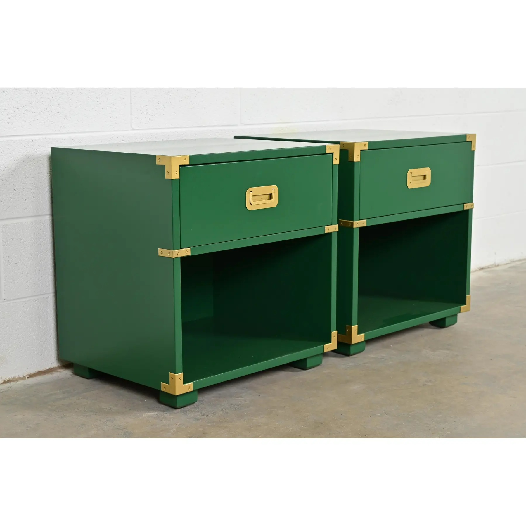 A gorgeous pair of mid-century modern Hollywood Regency Campaign style nightstands