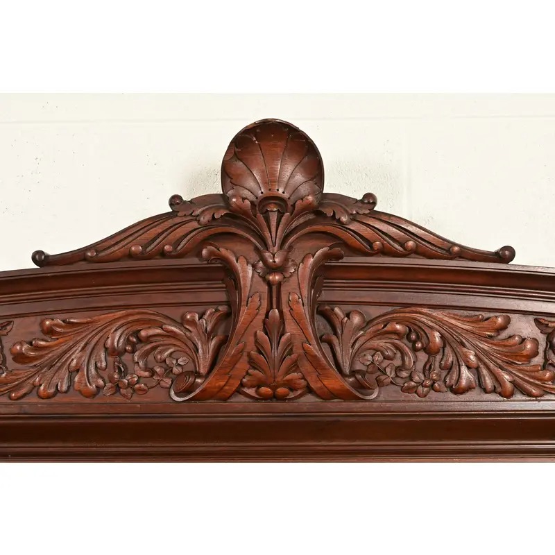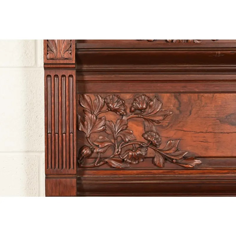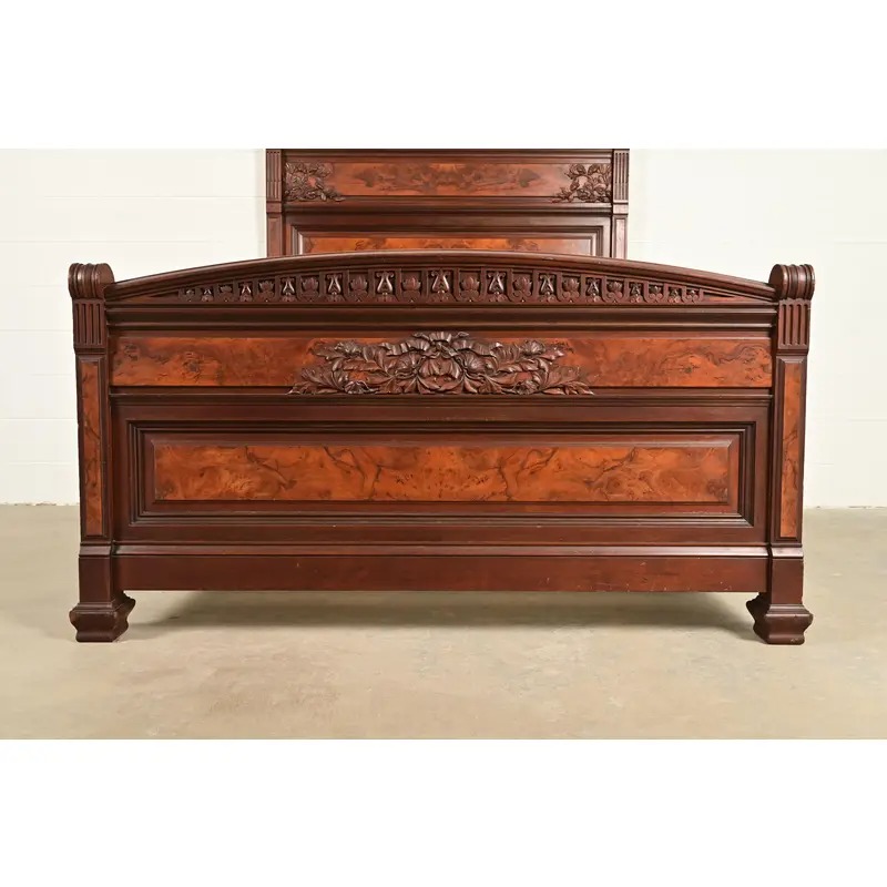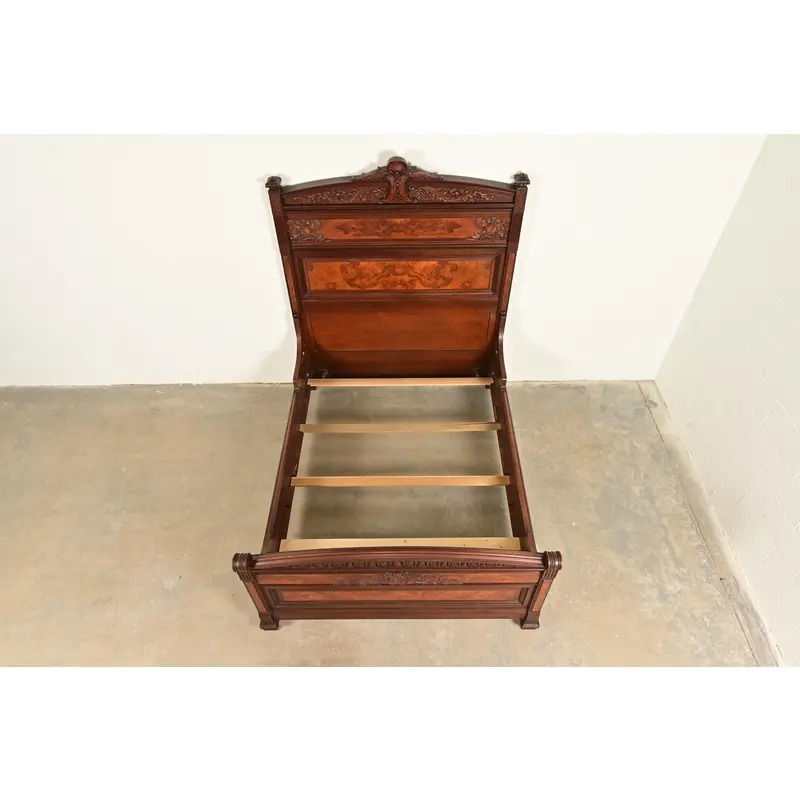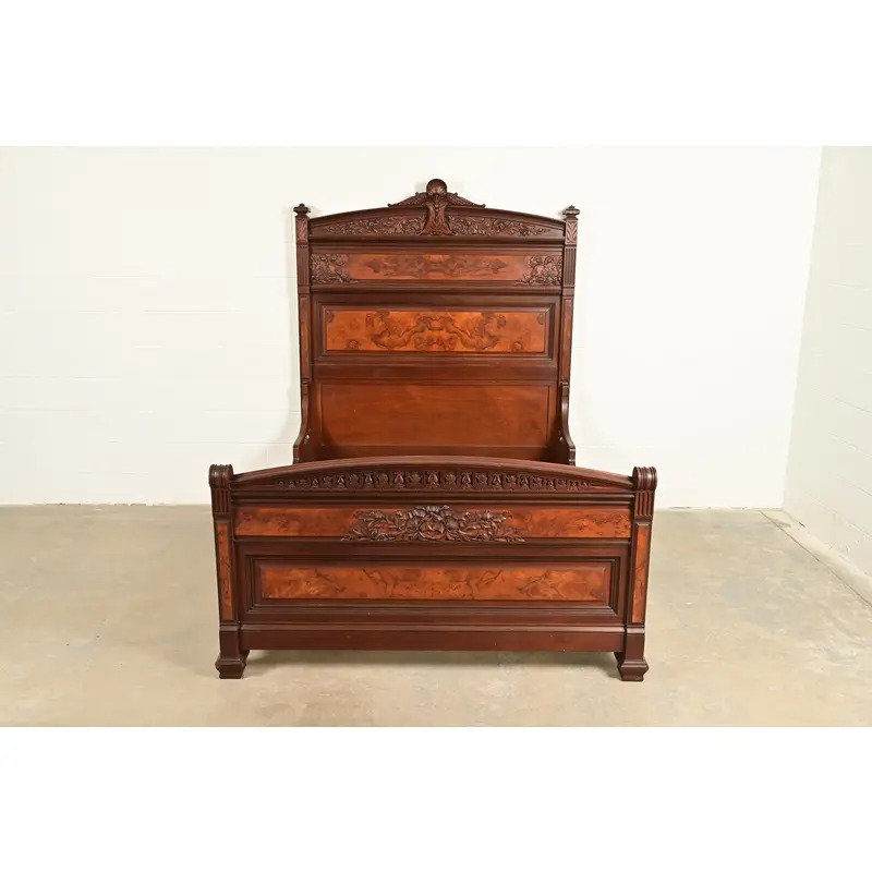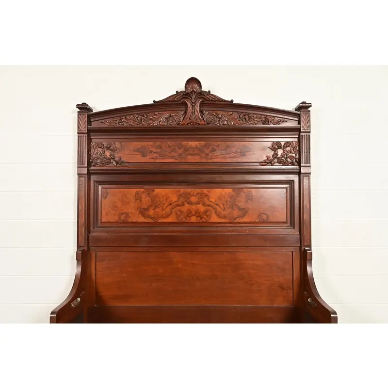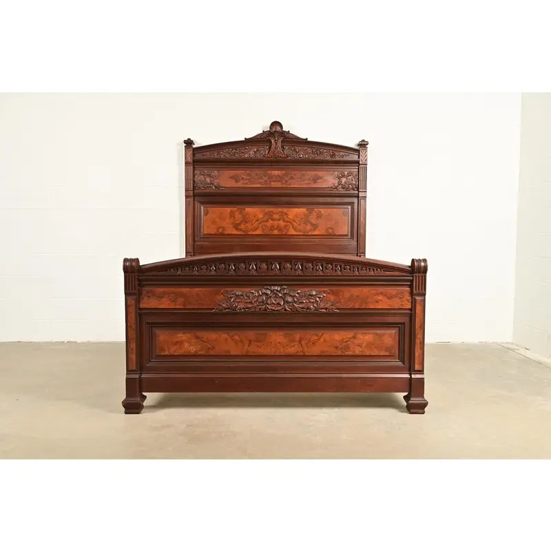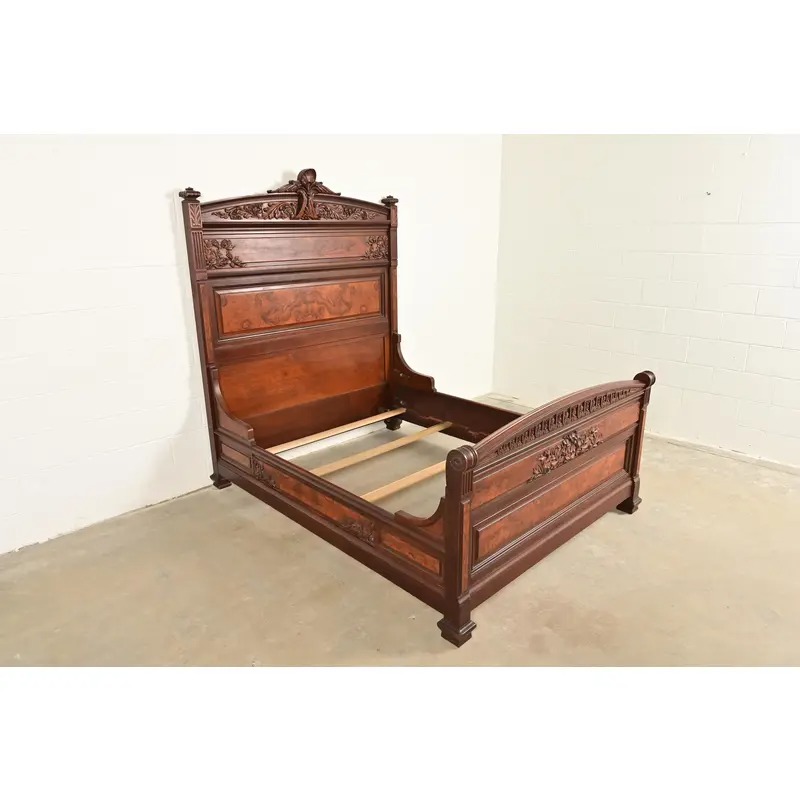 An outstanding antique Eastlake Victorian carved walnut and burl wood queen size bed frame