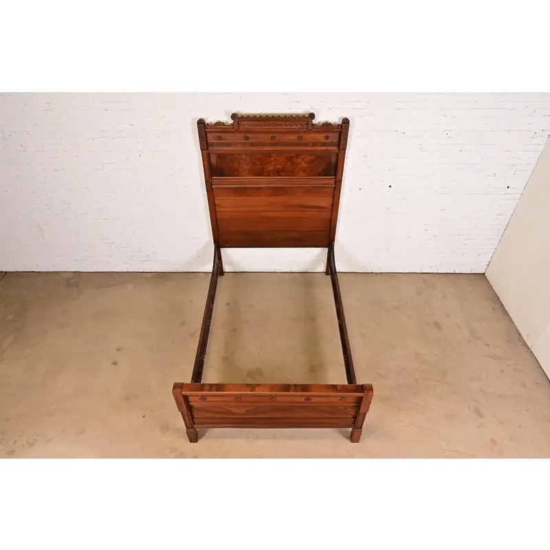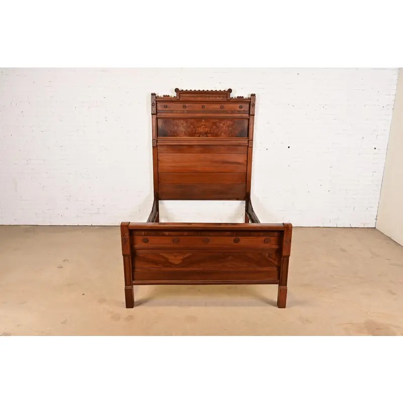 Herter Brothers Style Antique Monumental Eastlake Victorian Carved Burled Walnut Full Size Bed, Circa 1880s