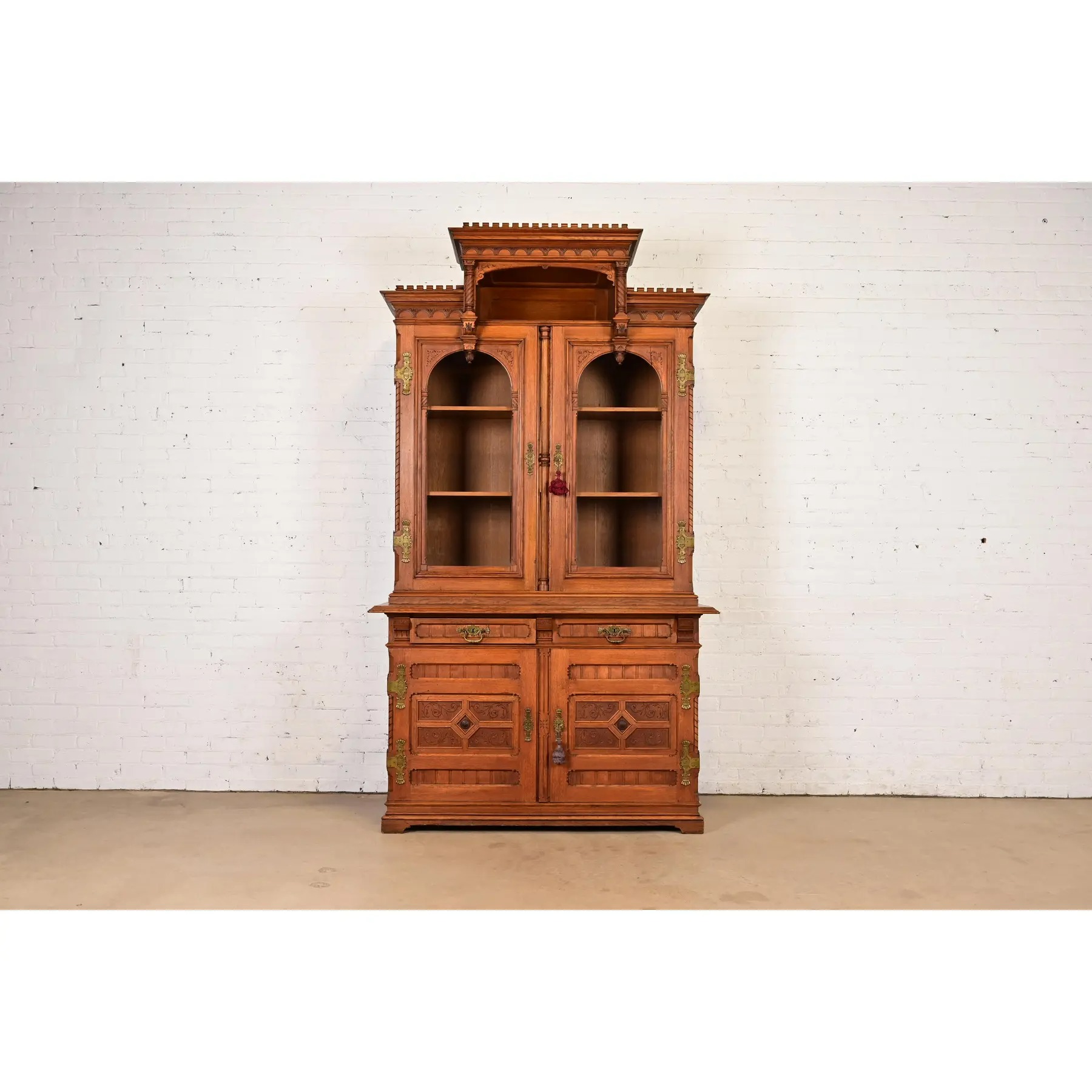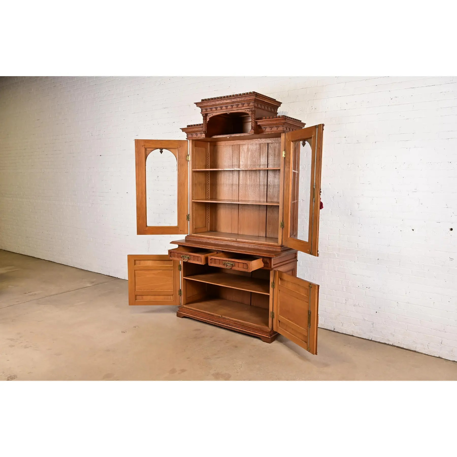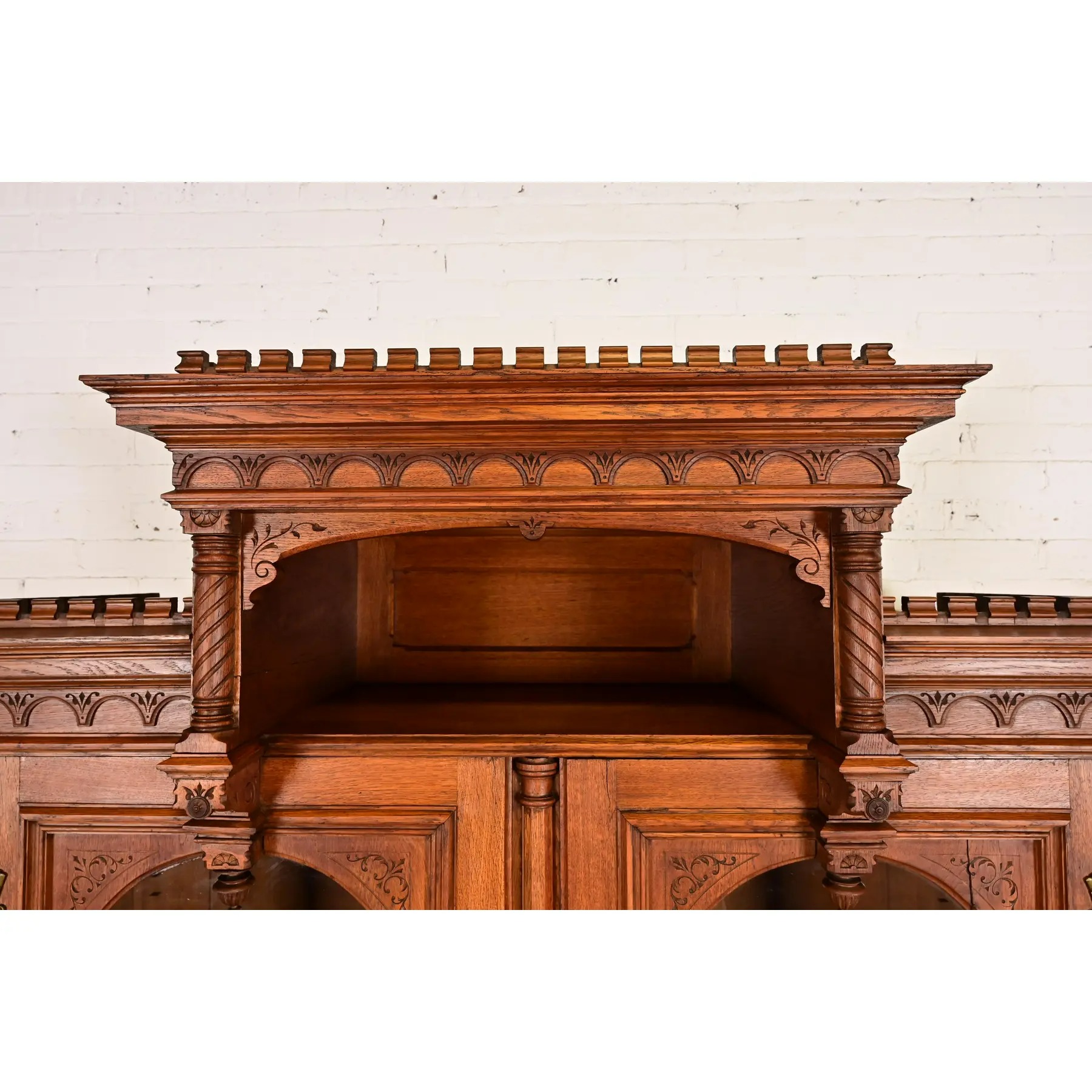 Herter Brothers Style Antique Victorian Carved Oak Breakfront Bookcase Cabinet, Circa 1880s