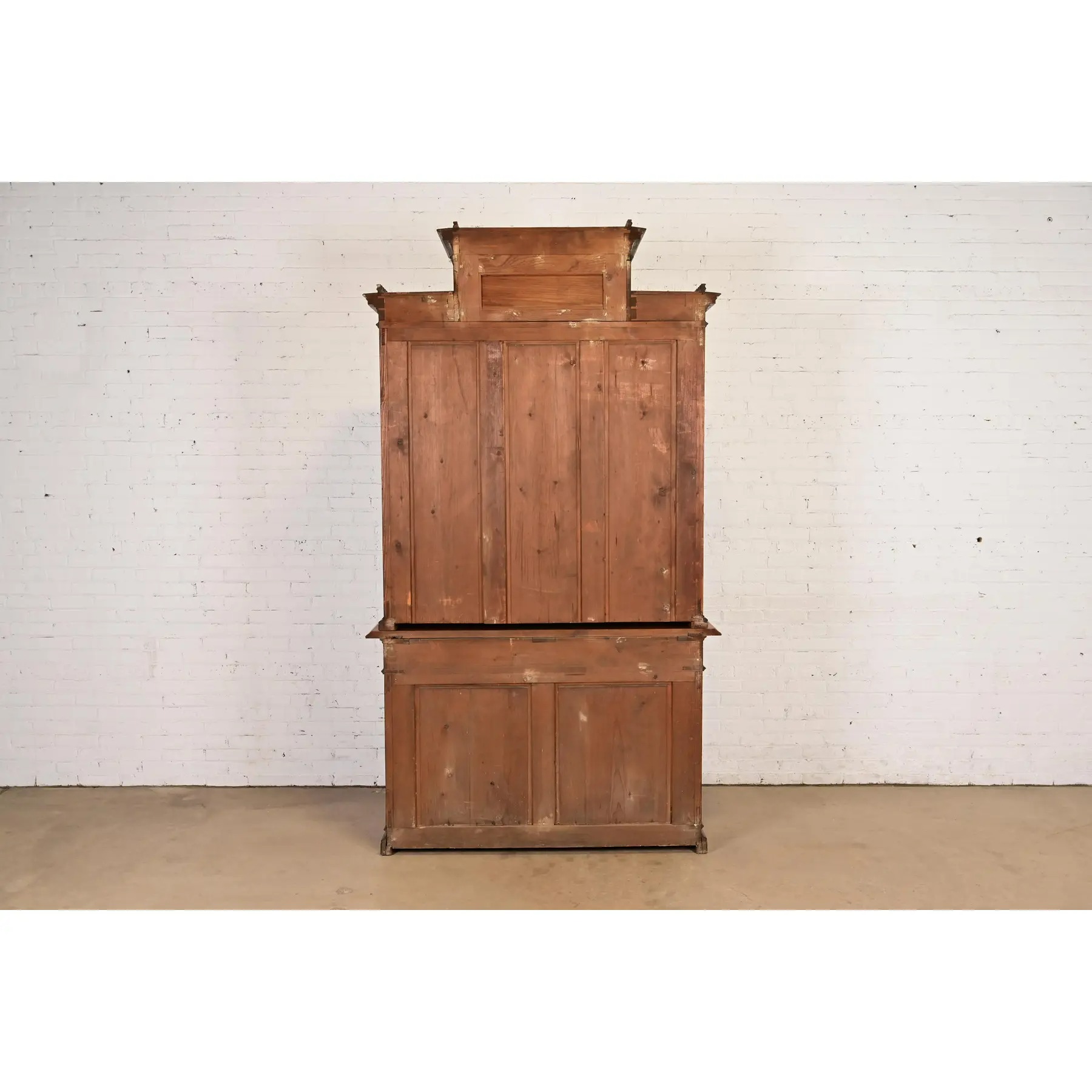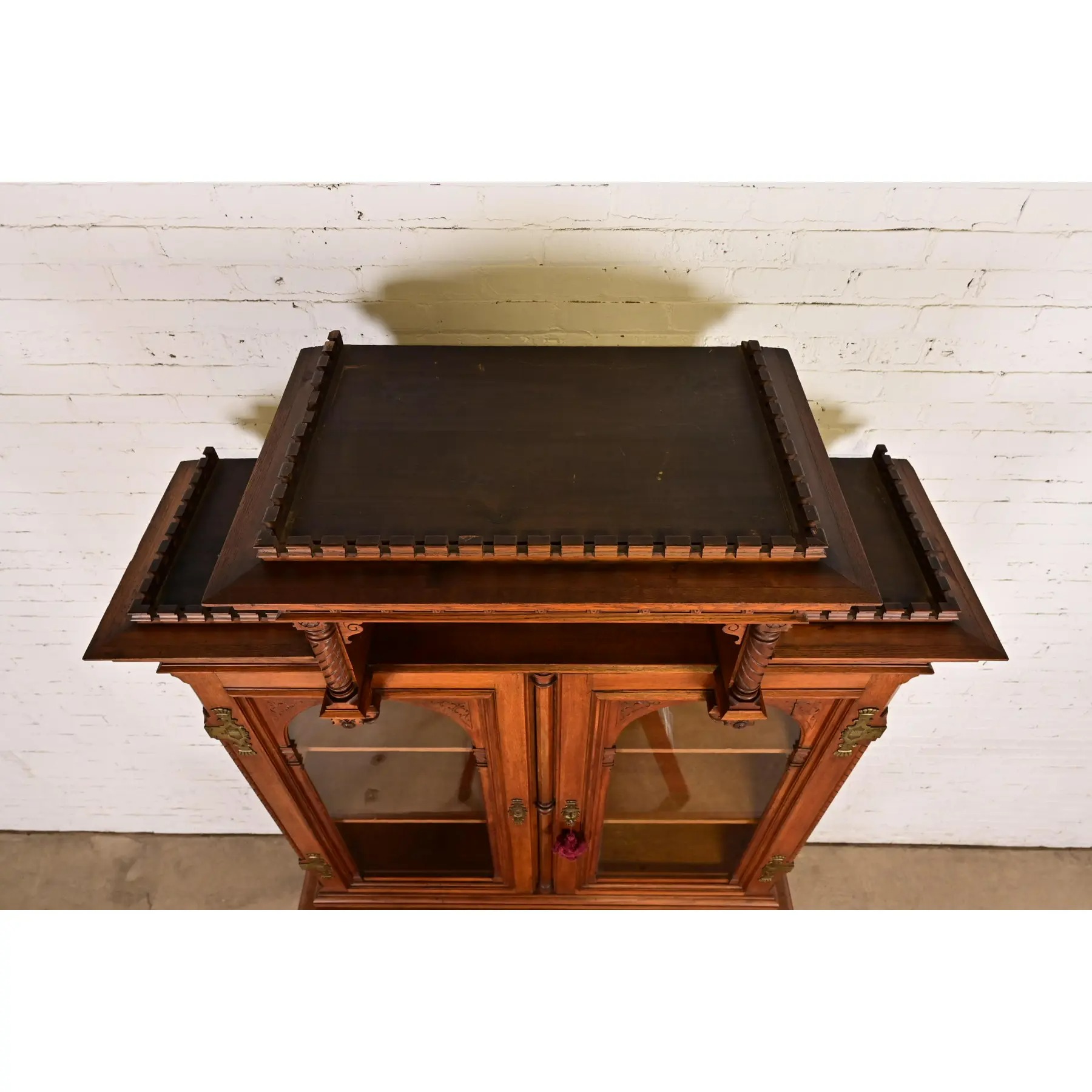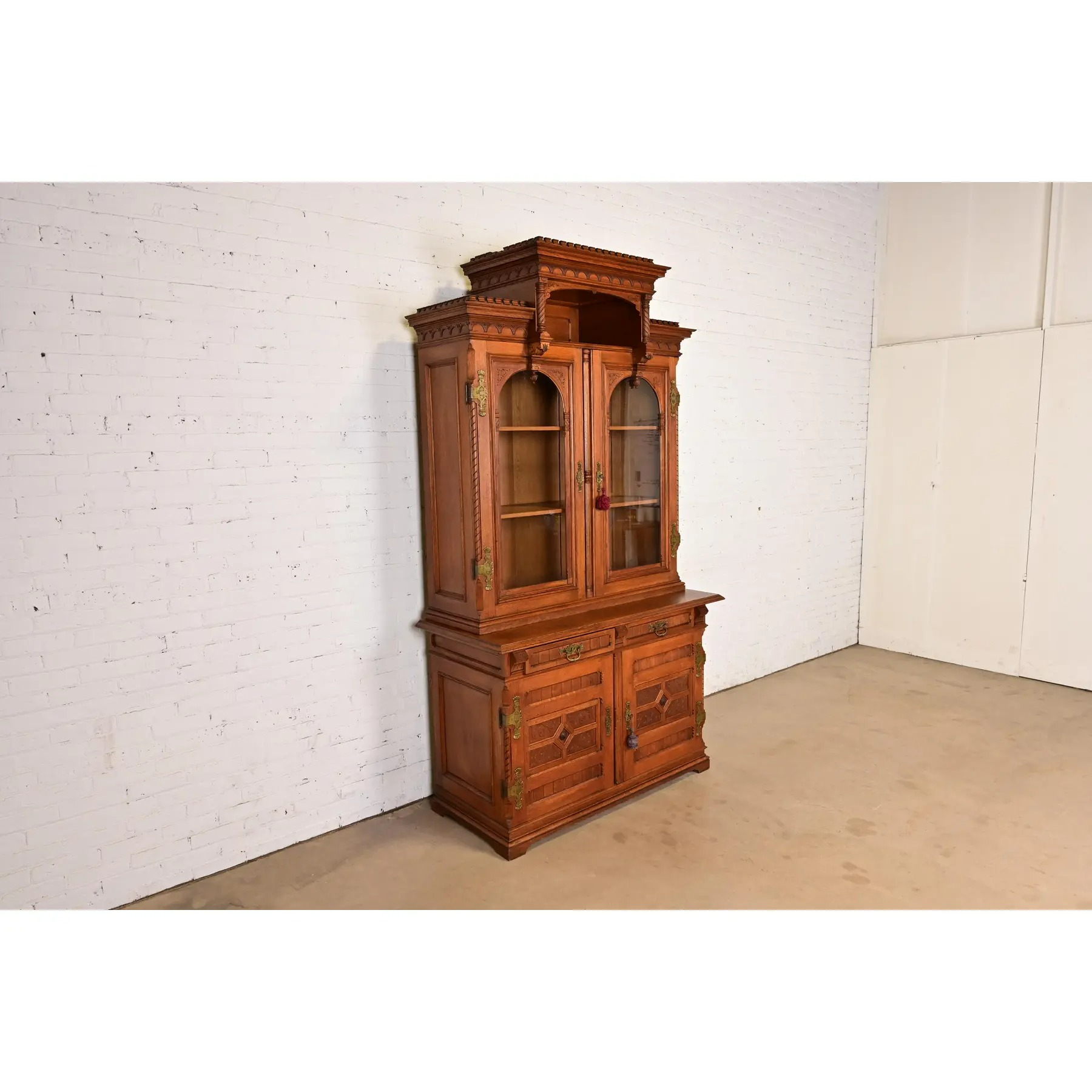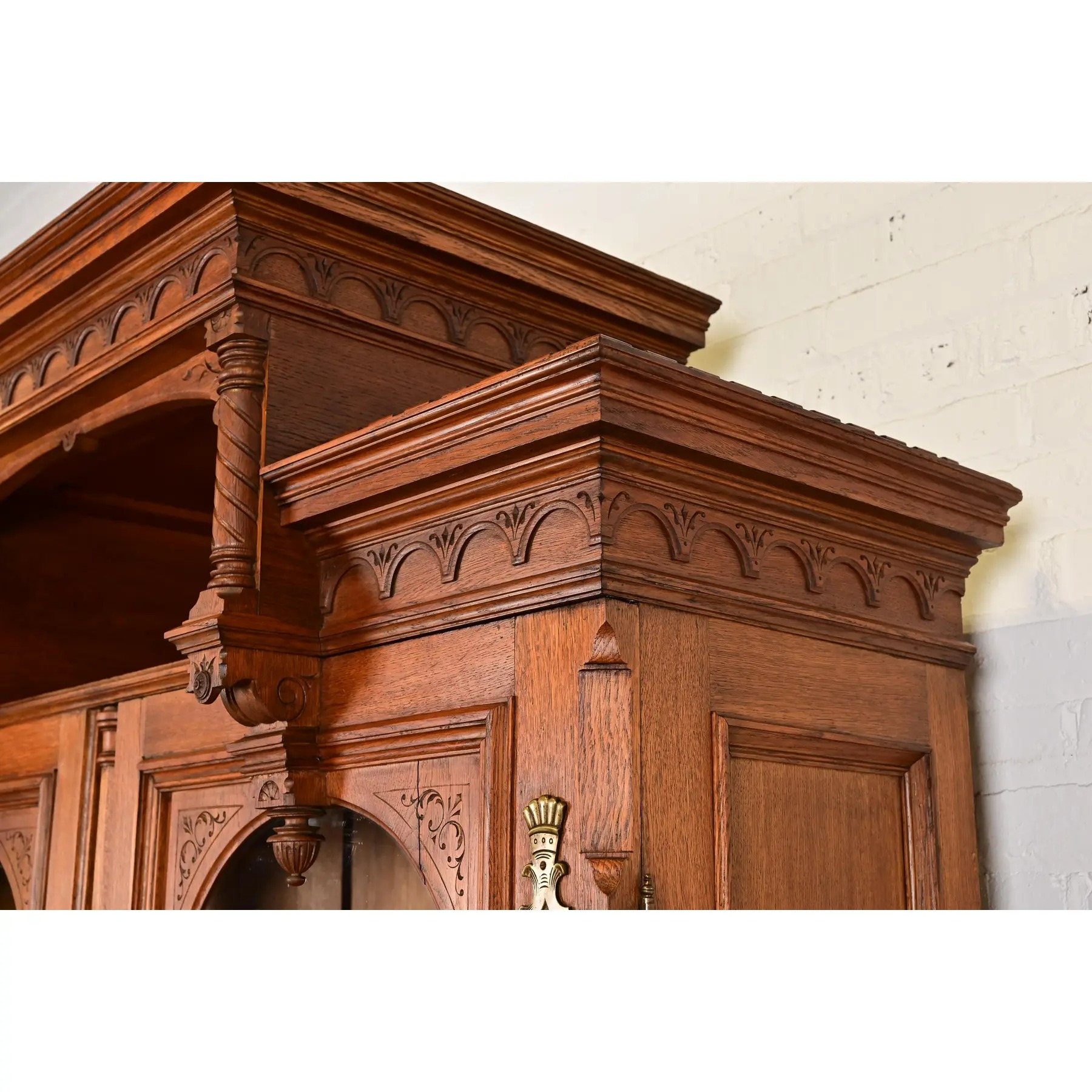 Herter Brothers Style Antique Victorian Carved Oak Breakfront Bookcase Cabinet, Circa 1880s