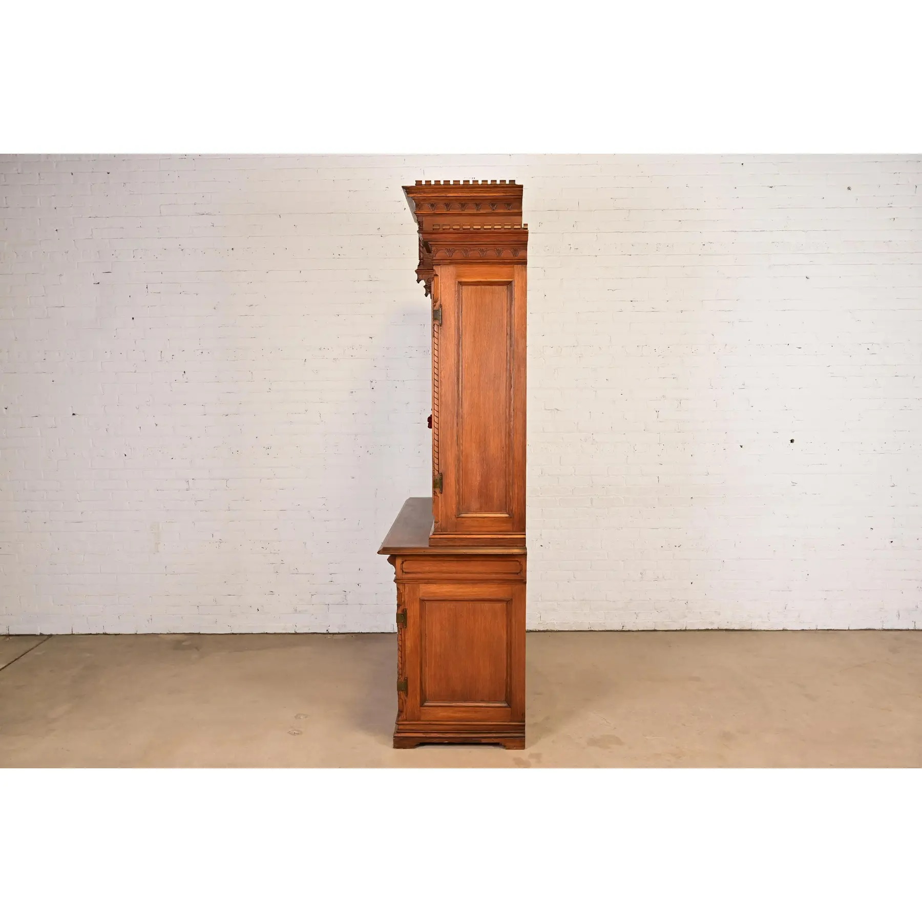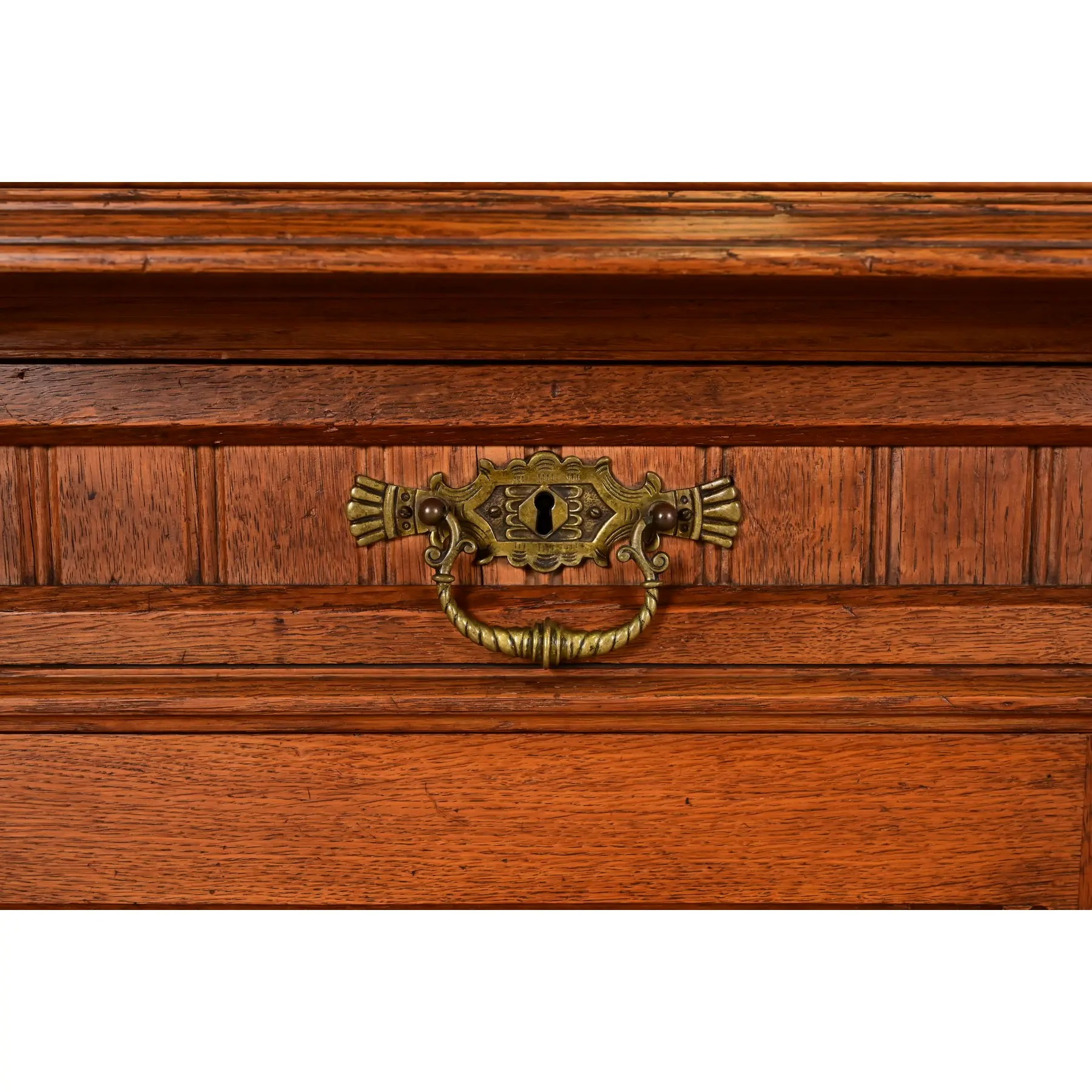 Ornate carved oak, with original brass hardware. Cabinet locks, and key is included.
