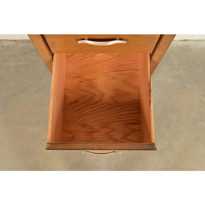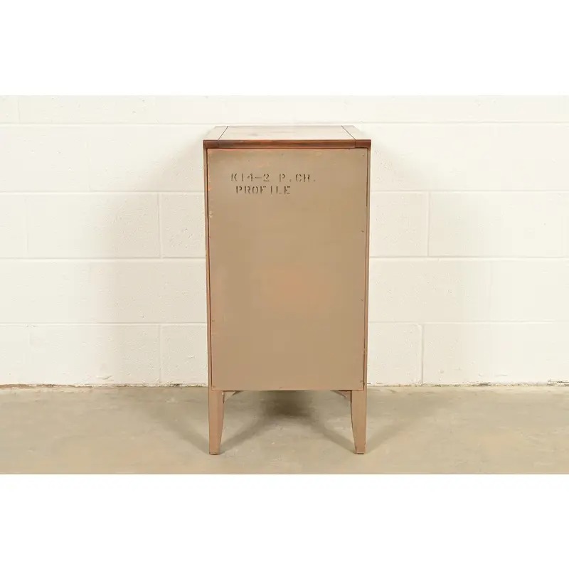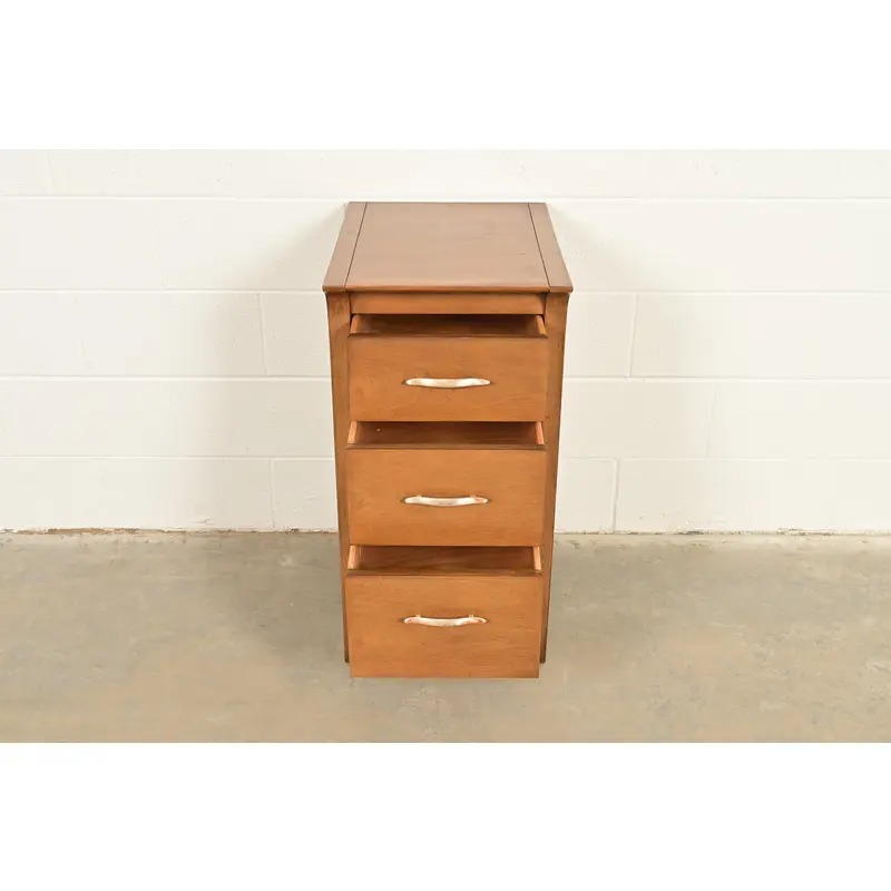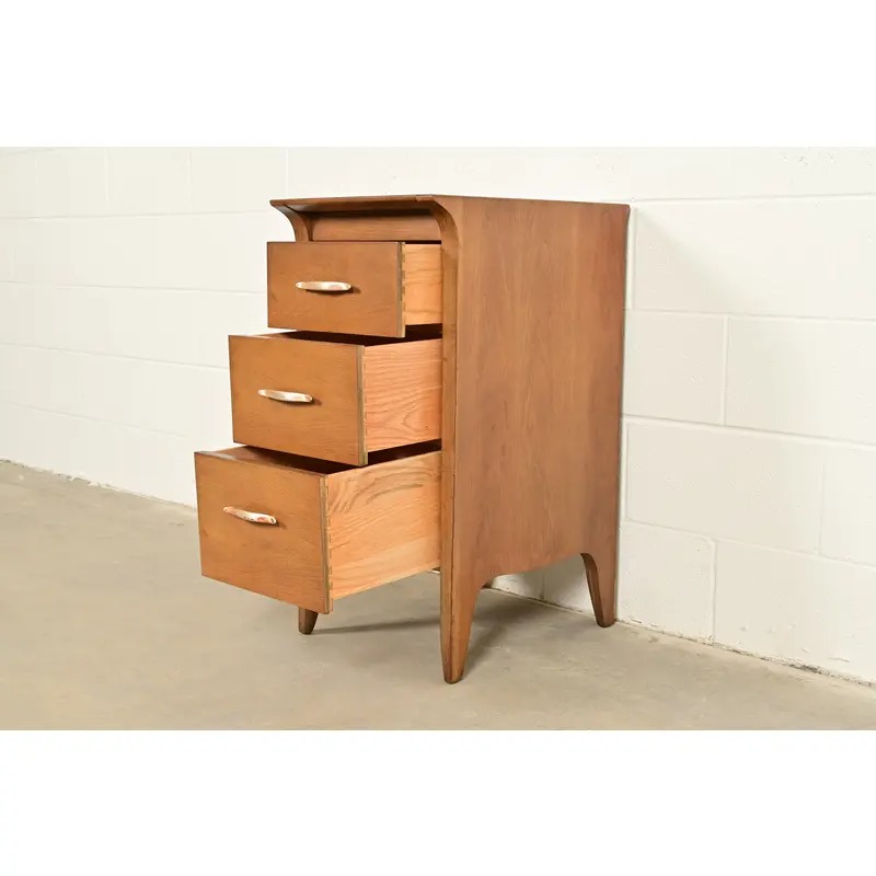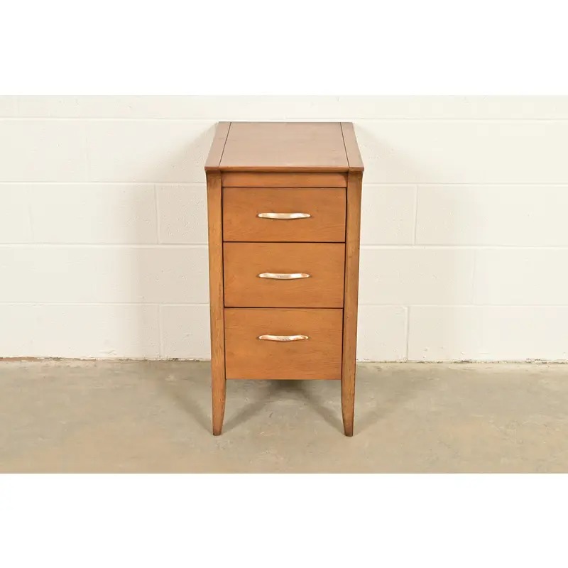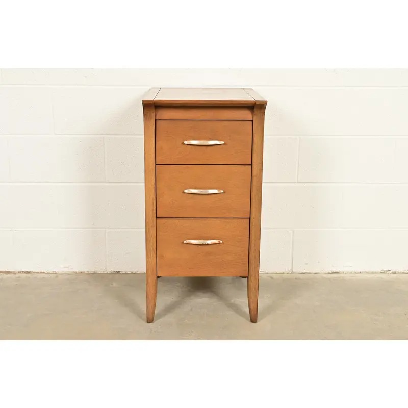 A sleek and stylish Mid-Century Modern three-drawer nightstand or bachelor chest