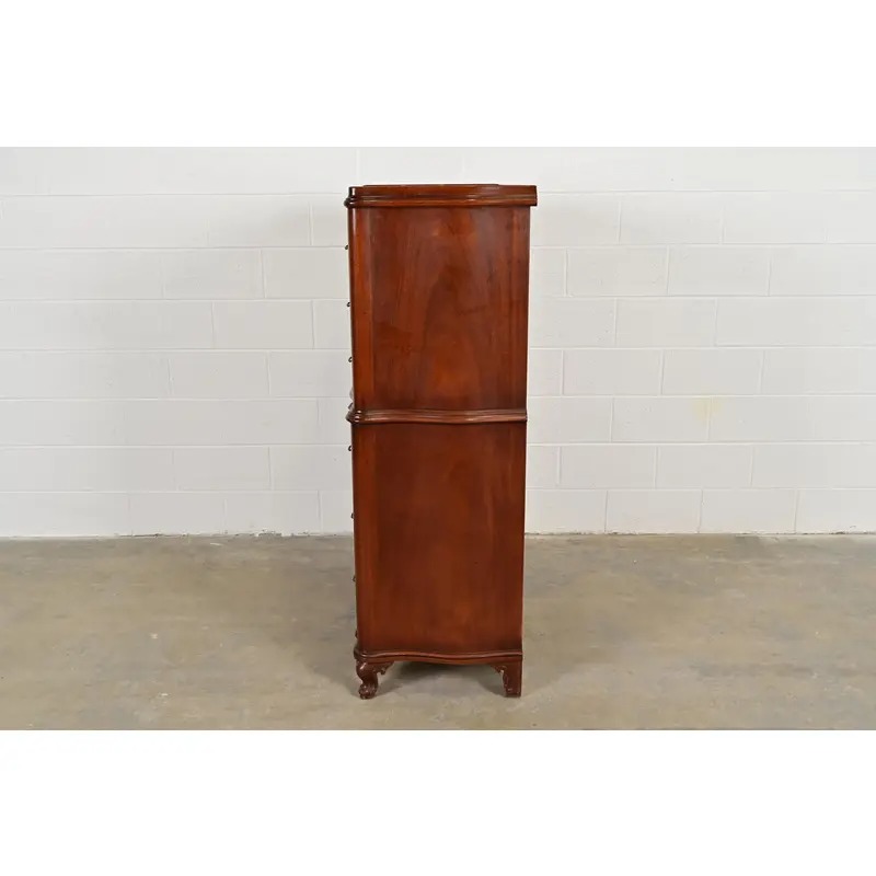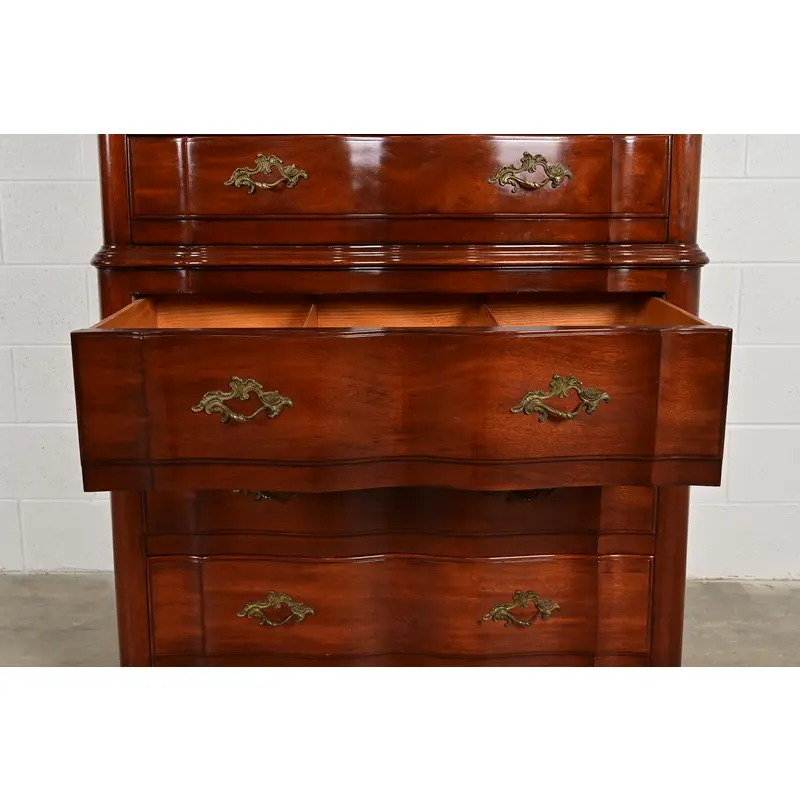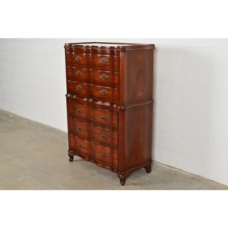 A gorgeous French Provincial Louis XV style serpentine front six-drawer highboy dresser or chest of drawers