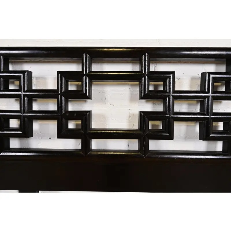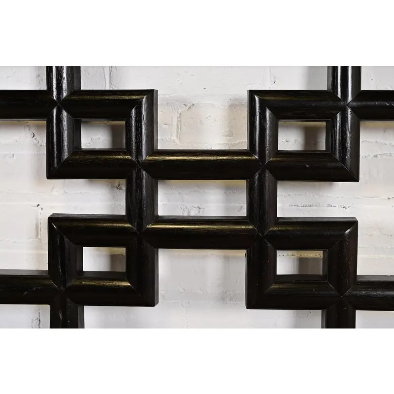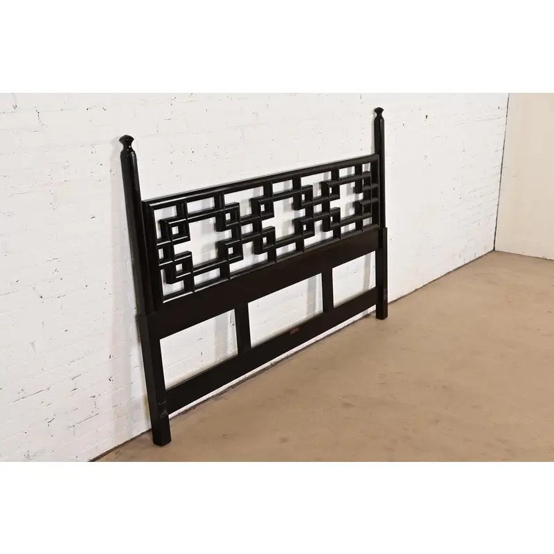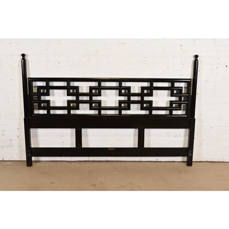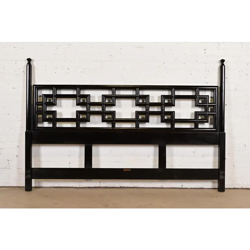 A gorgeous mid-century modern Hollywood Regency Chinoiserie black lacquered king size headboard