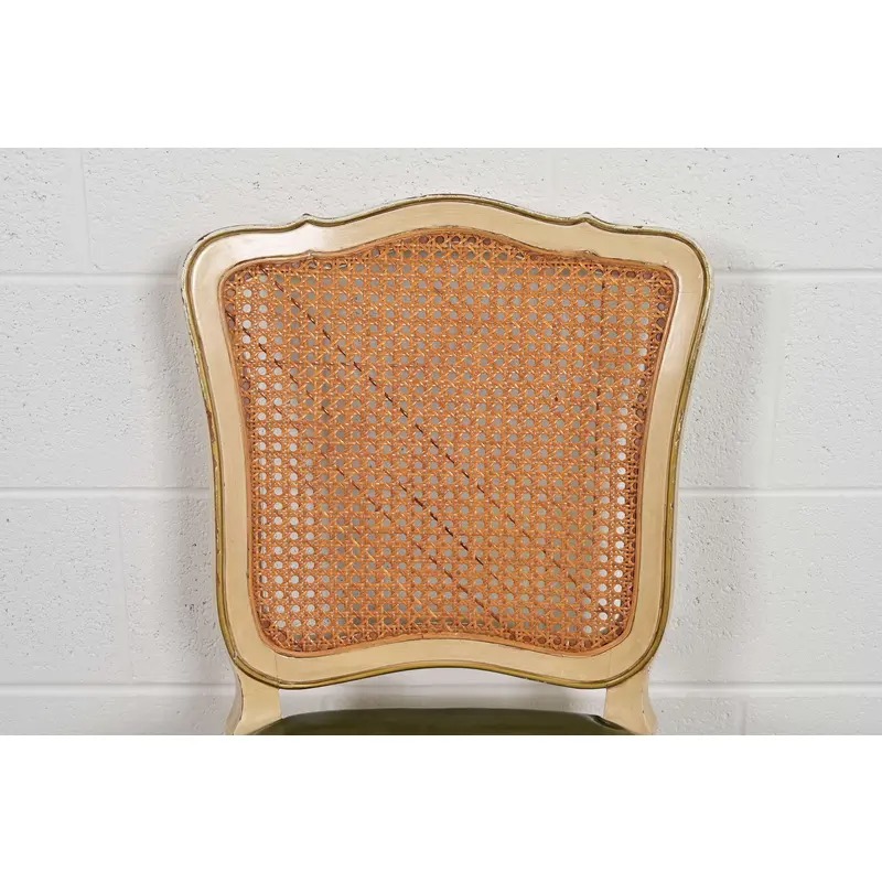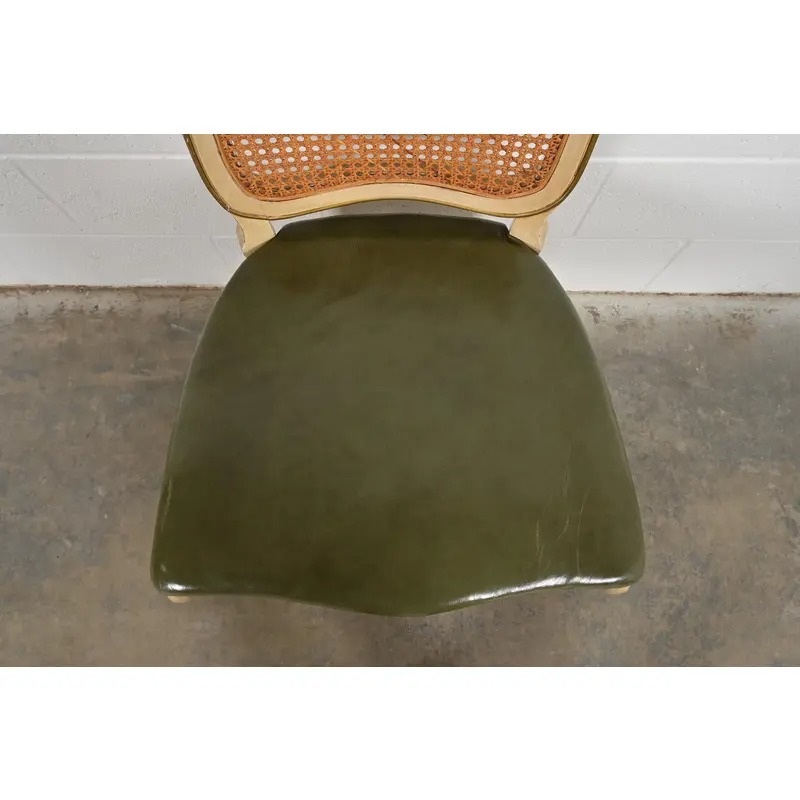 Cream lacquered solid wood, with gold gilt trim, embossed leather top, and original brass hardware. Chair with caned back and upholstered seat.