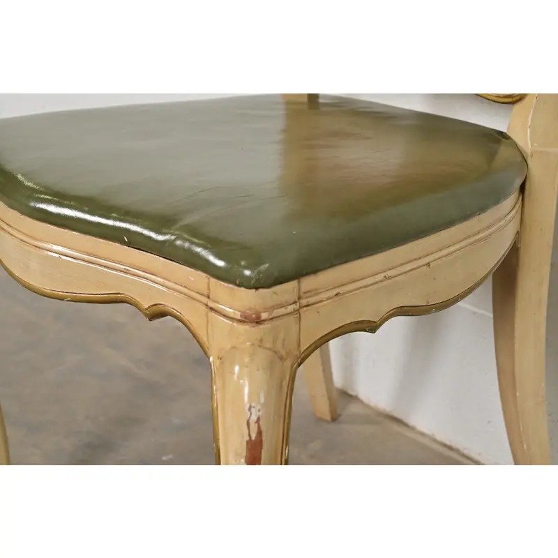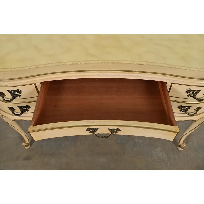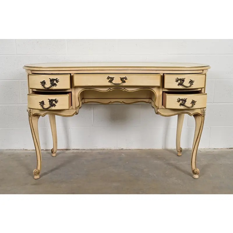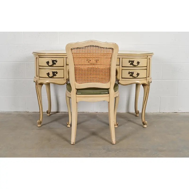 John Widdicomb Style French Provincial Louis XV Cream Lacquered and Gold Gilt Leather Top Ladies Writing Desk and Chair, Circa 1950s