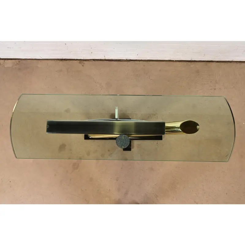 Steel, brass, and chrome, with thick glass top.