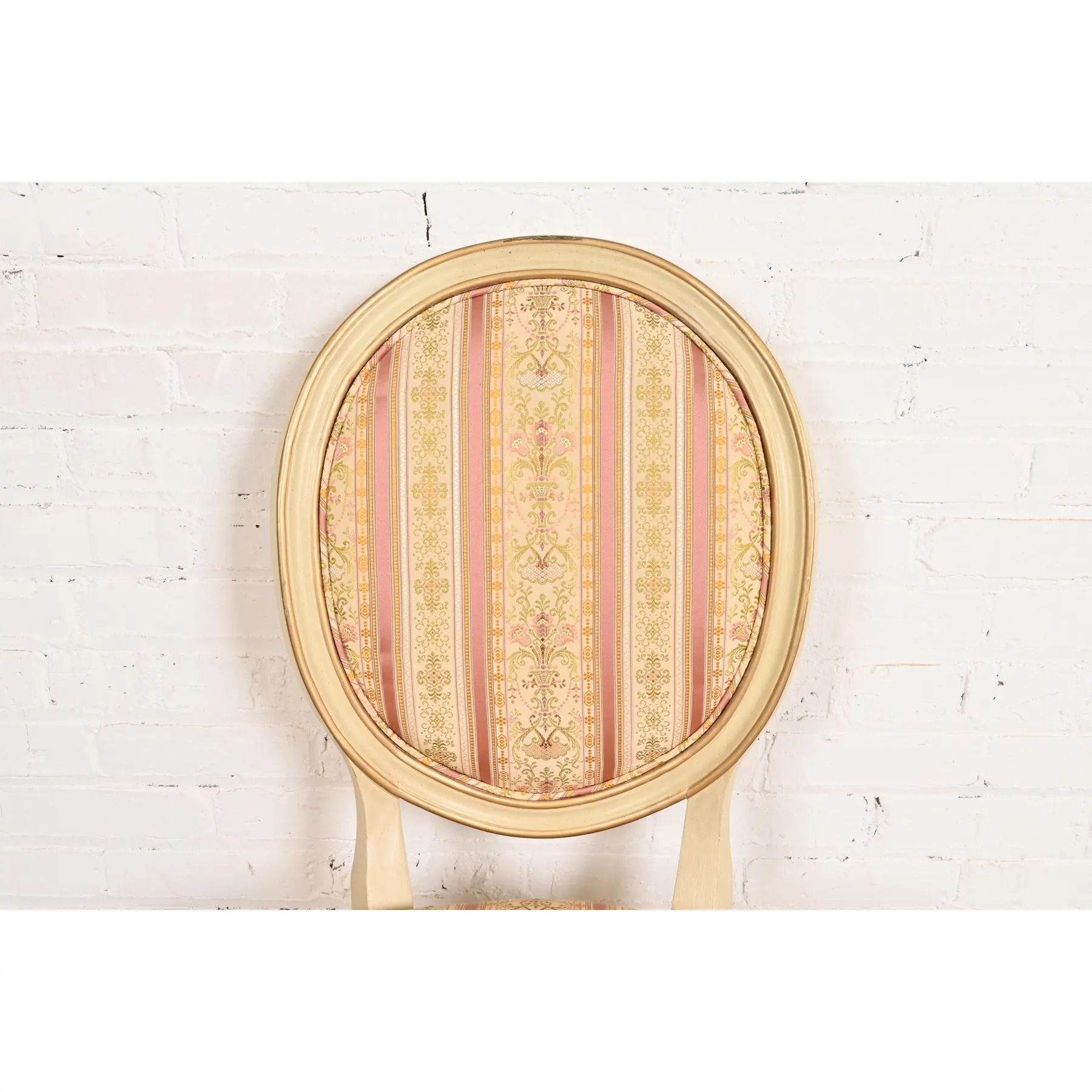 Beautiful carved cream lacquered walnut frames, with gold gilt details, and upholstered seats and backs.