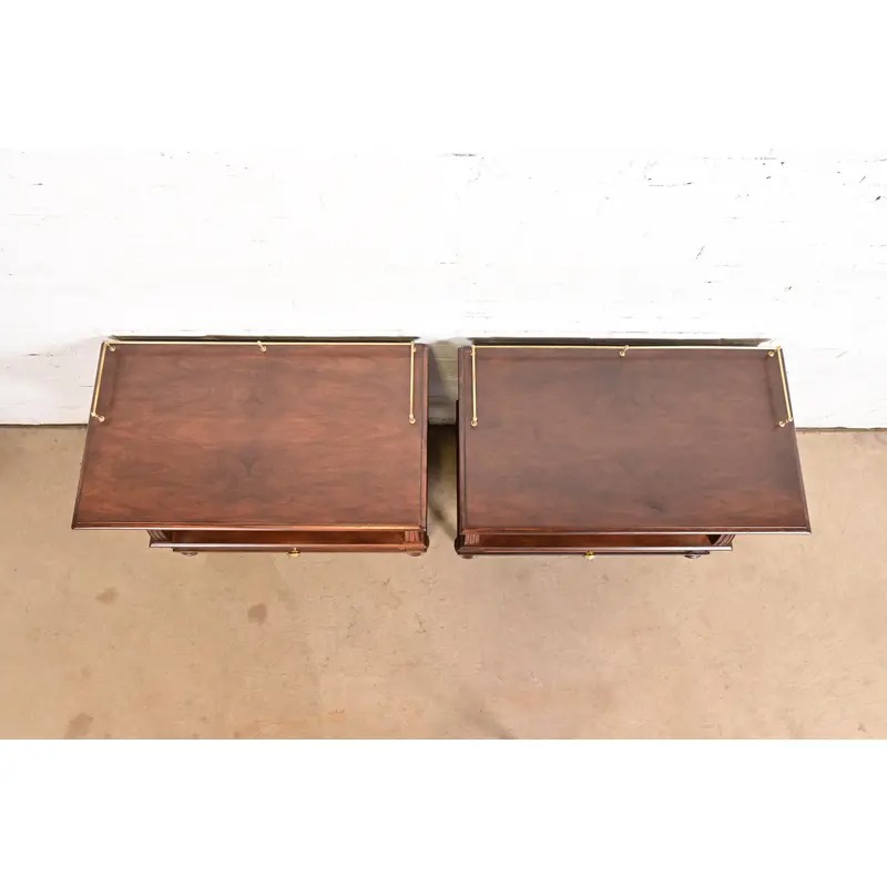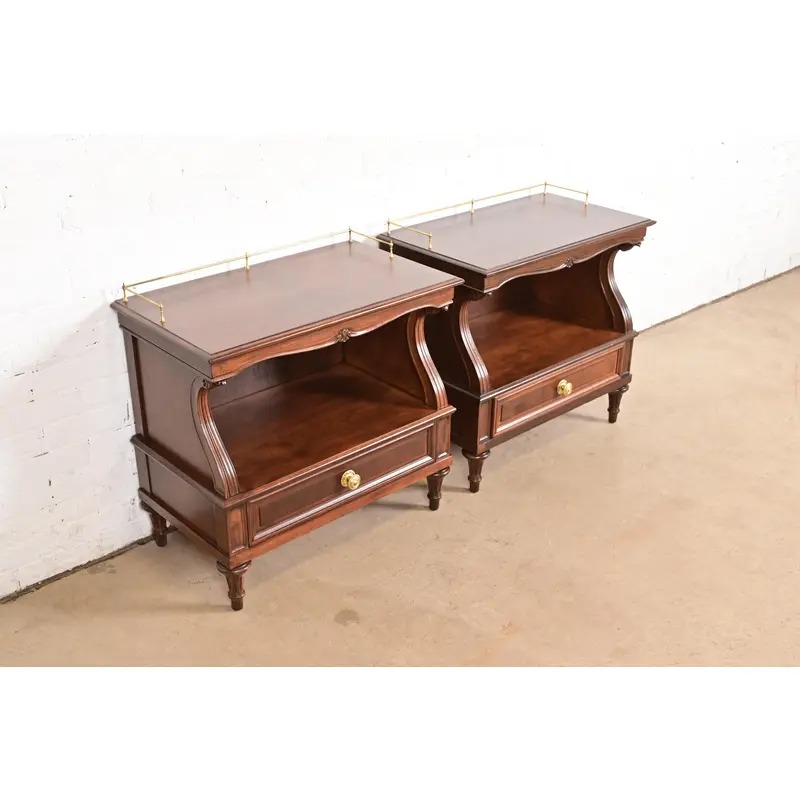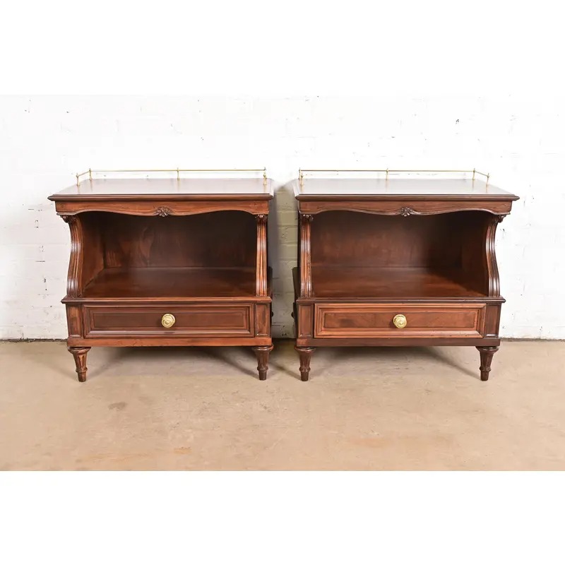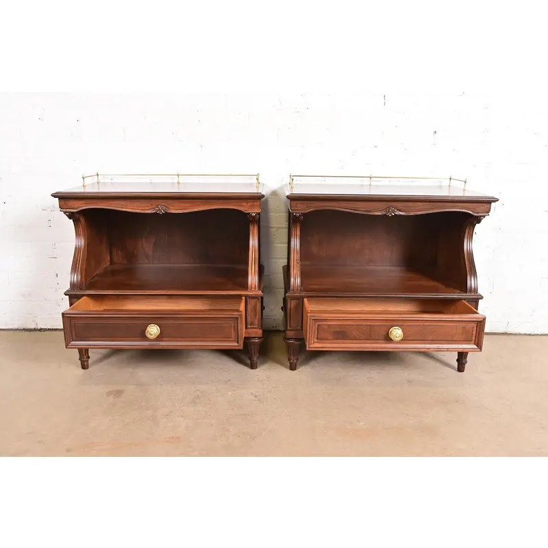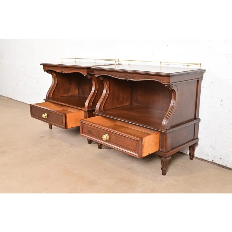 Beautiful carved walnut, with book-matched burled walnut tops, and original brass hardware and gallery.