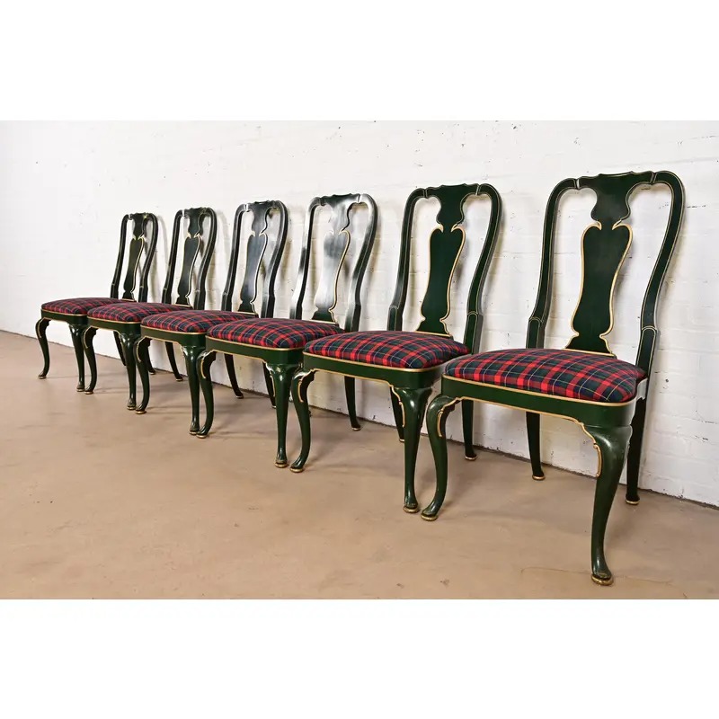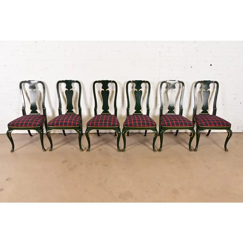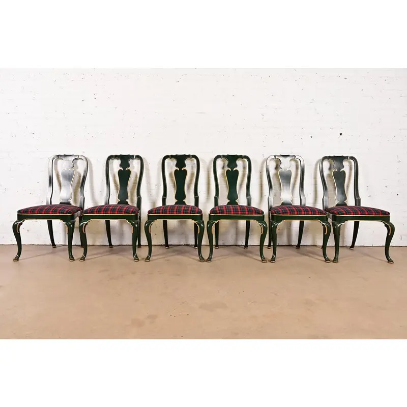 A gorgeous set of six Hollywood Regency Chinoiserie style side chairs or dining chairs in Queen Anne form