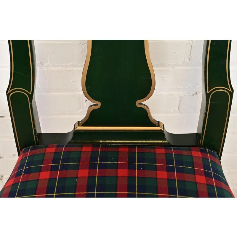 Green lacquered solid mahogany frames, with gold gilt trim, and upholstered seats.