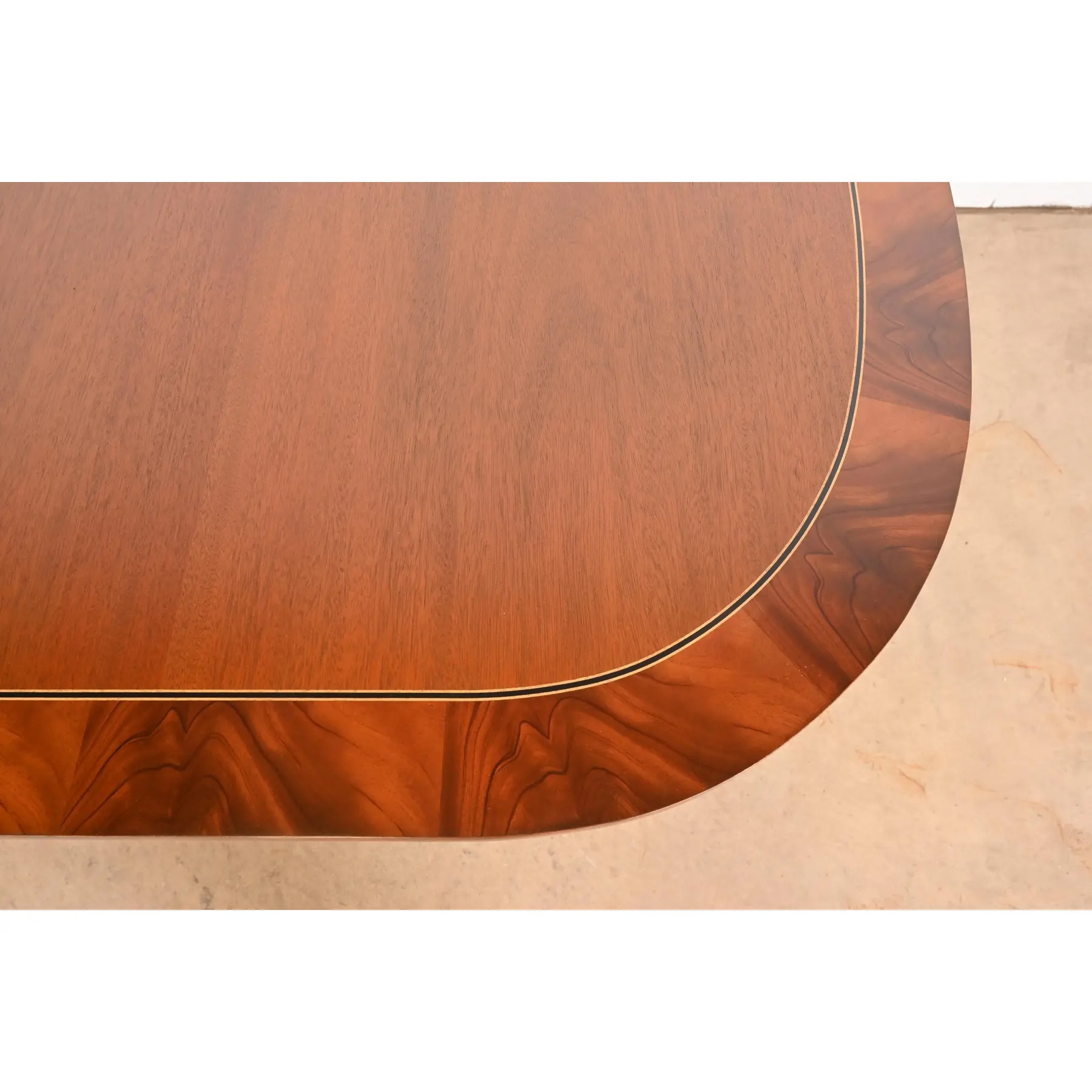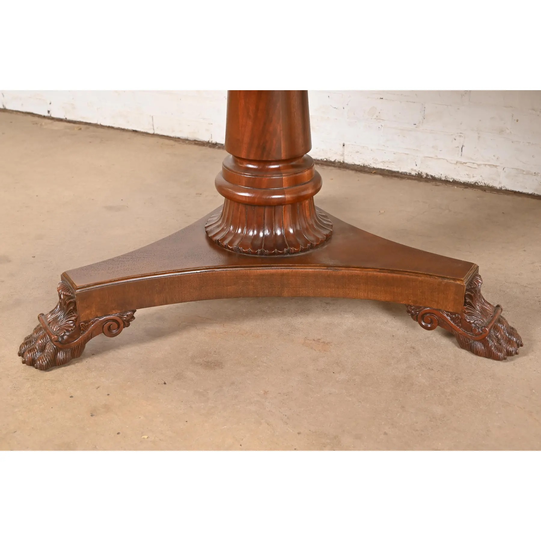 Book-matched mahogany, with flame mahogany banding, and carved solid mahogany column pedestals with paw feet.