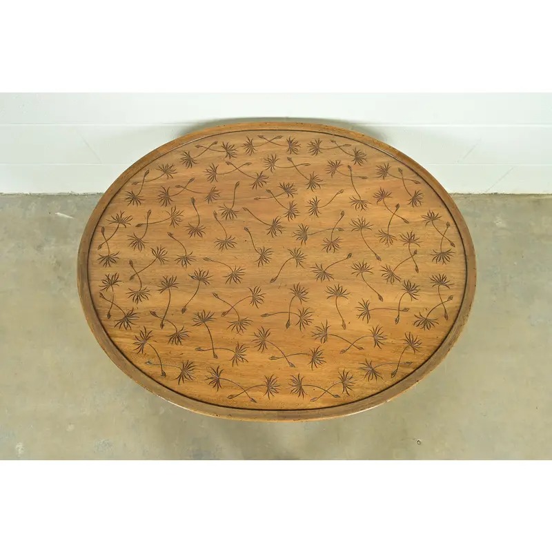 Walnut top with unique incised thistle design, and black lacquered faux bamboo legs and stretchers.