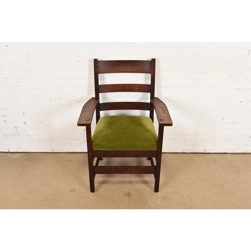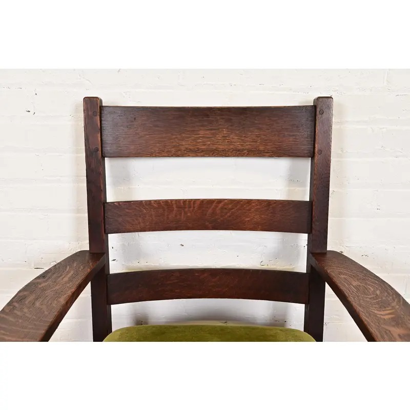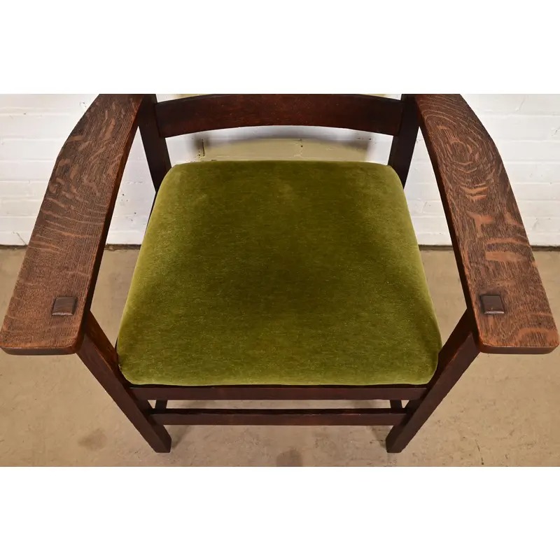 Solid quarter sawn oak frame, with green velvet upholstered seat.