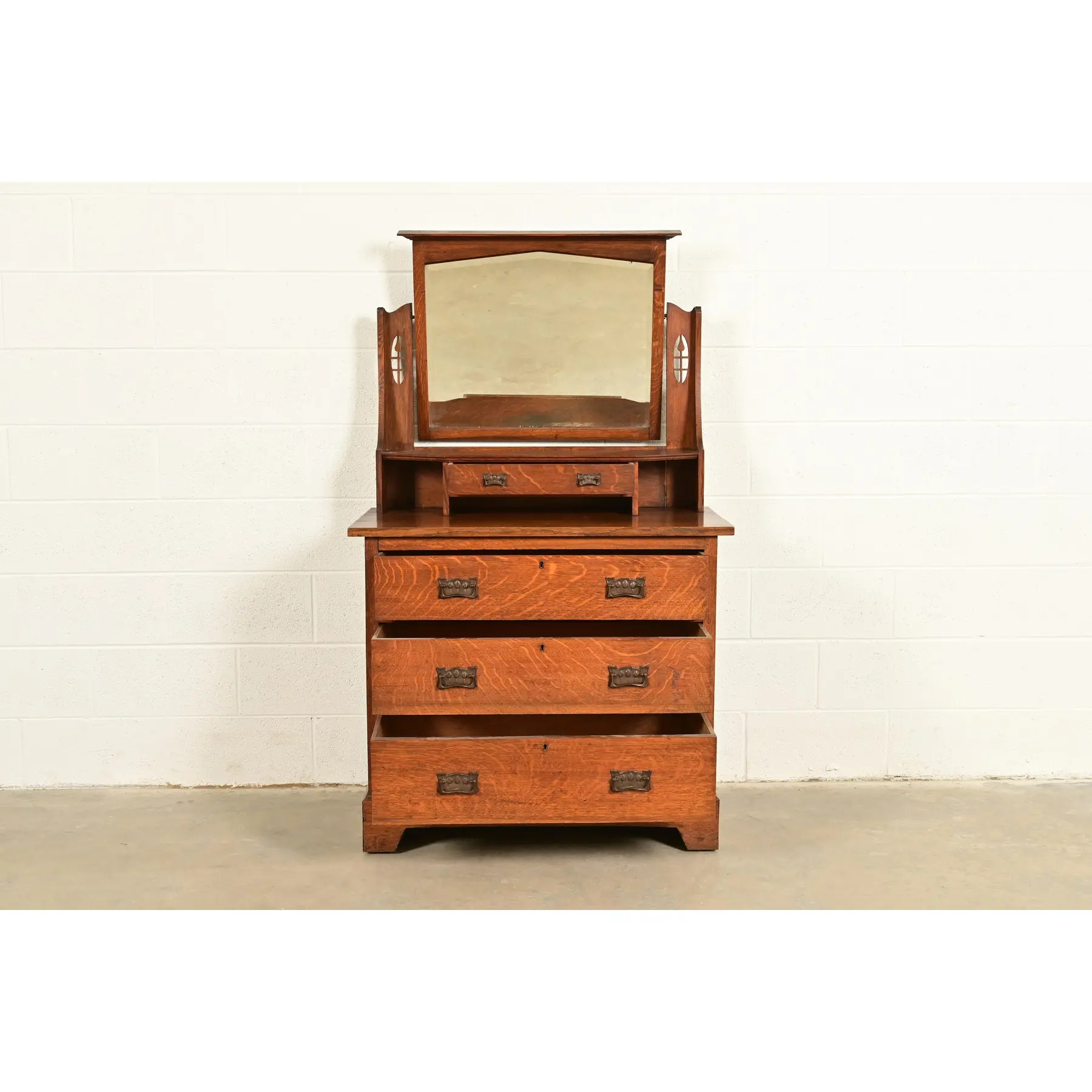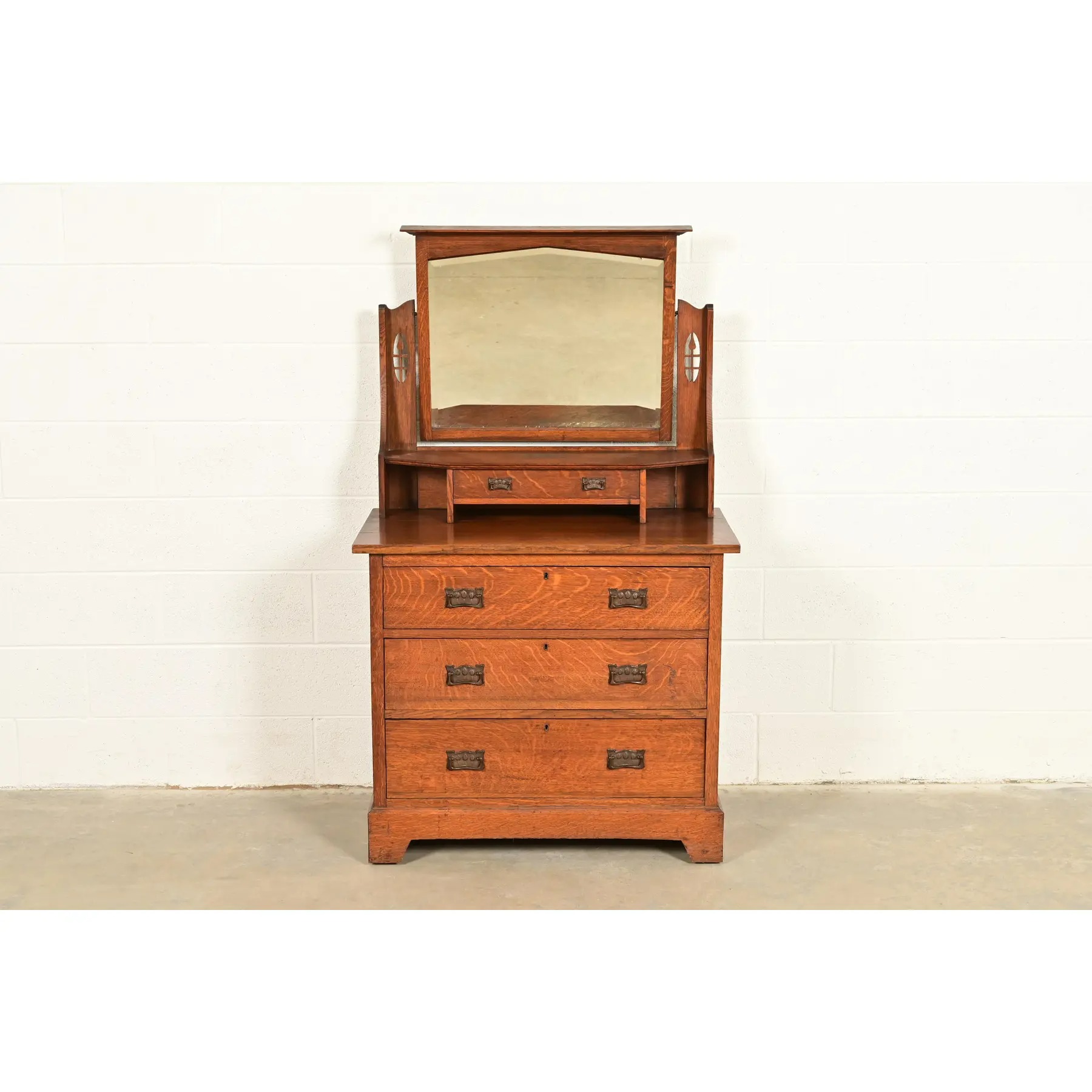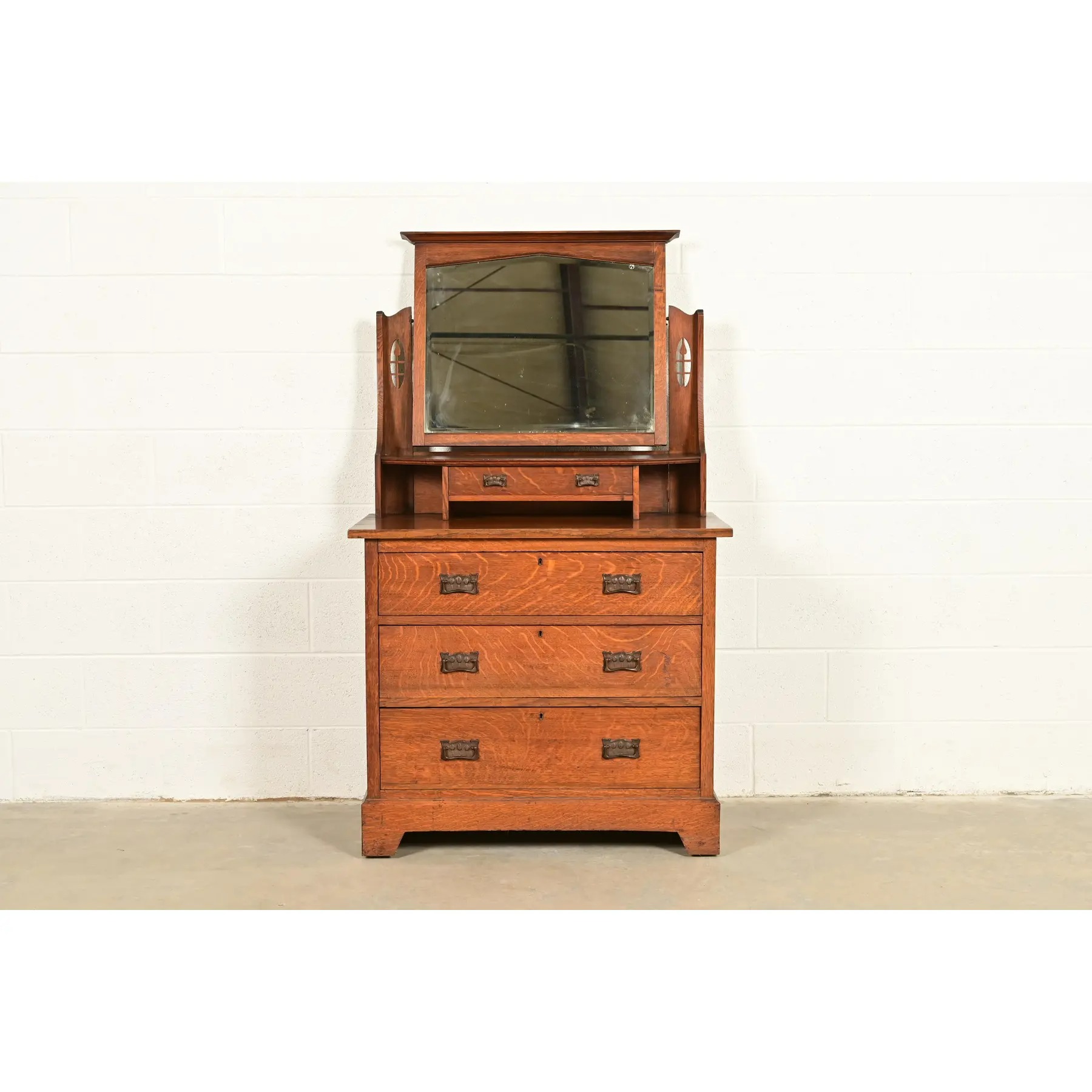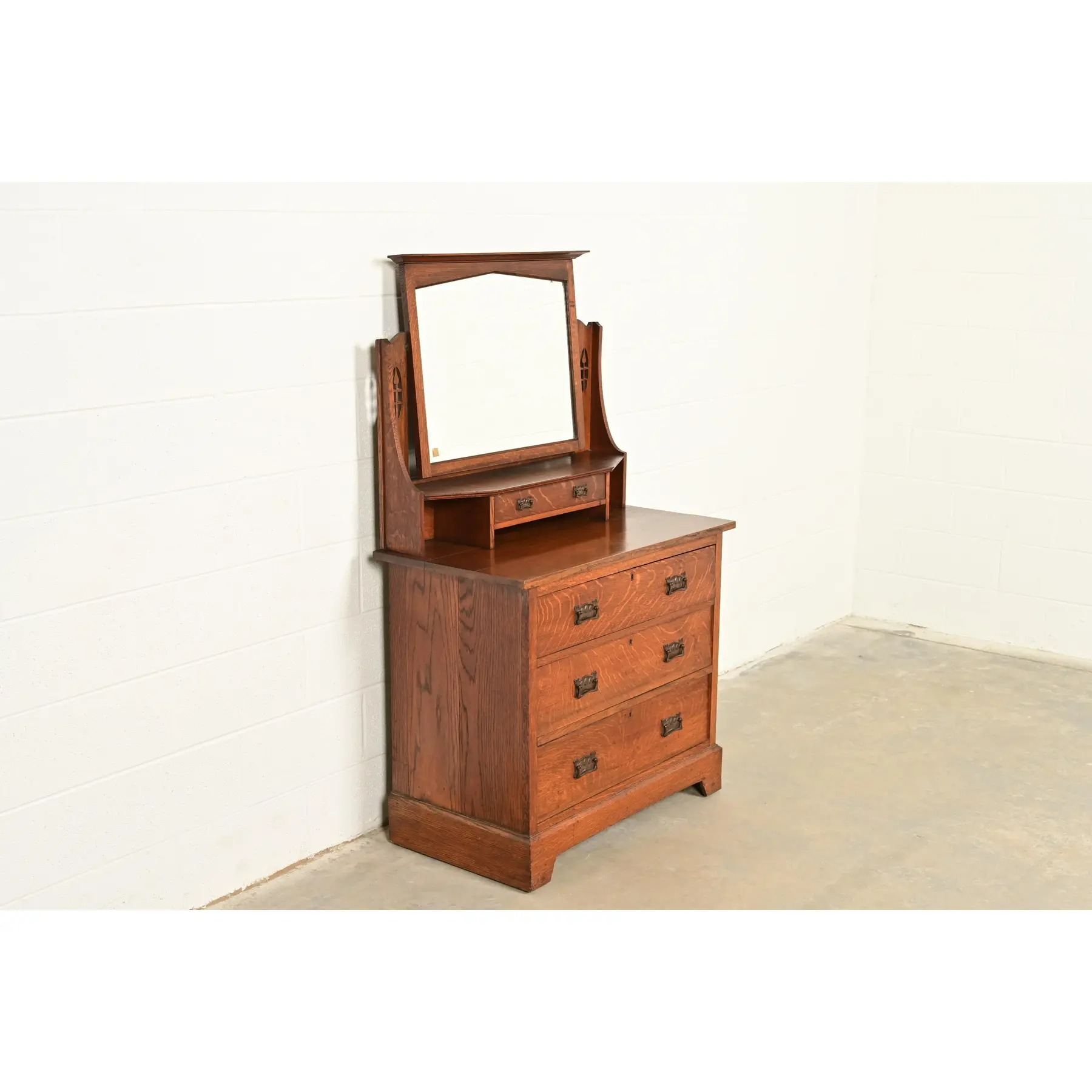 Liberty & Co. Antique English Mission Oak Arts & Crafts Vanity Dresser With Mirror, Circa 1900