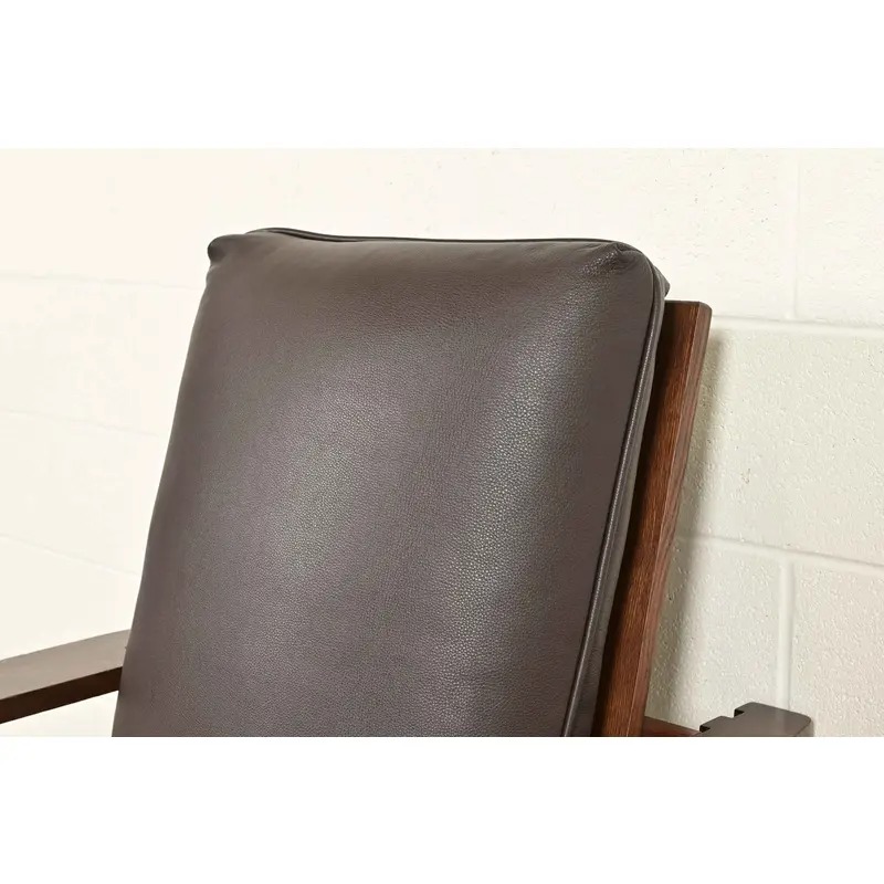 Solid quarter sawn oak frame, with leather upholstered seat and back cushions.