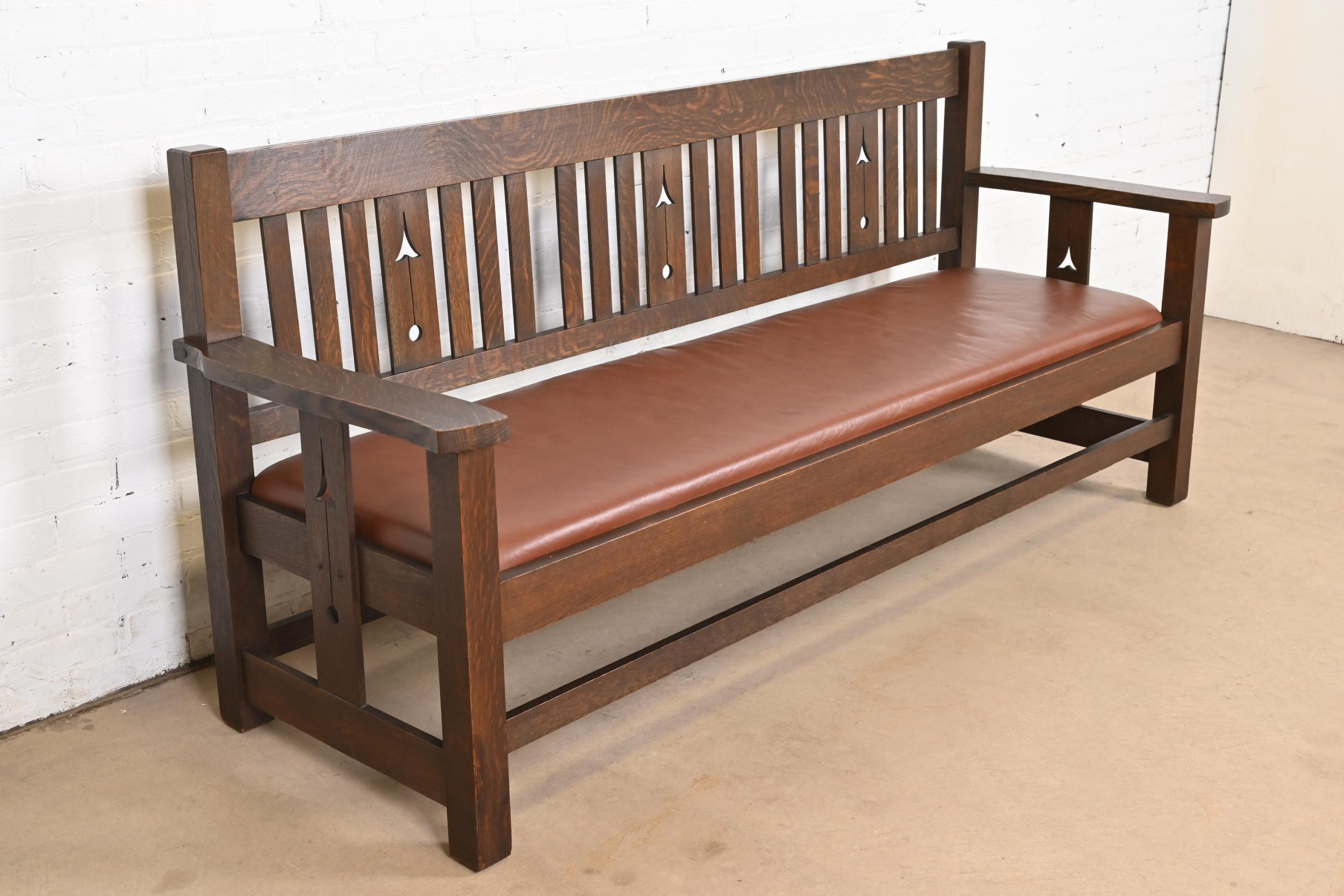 A gorgeous antique Mission or Arts & Crafts period cut-out settle, sofa, or bench