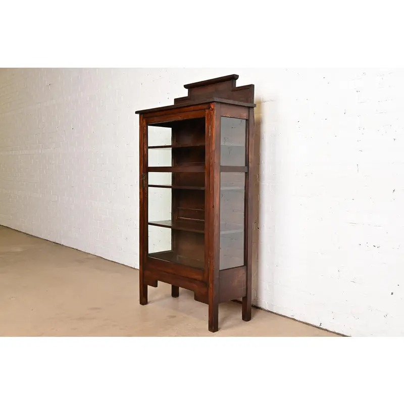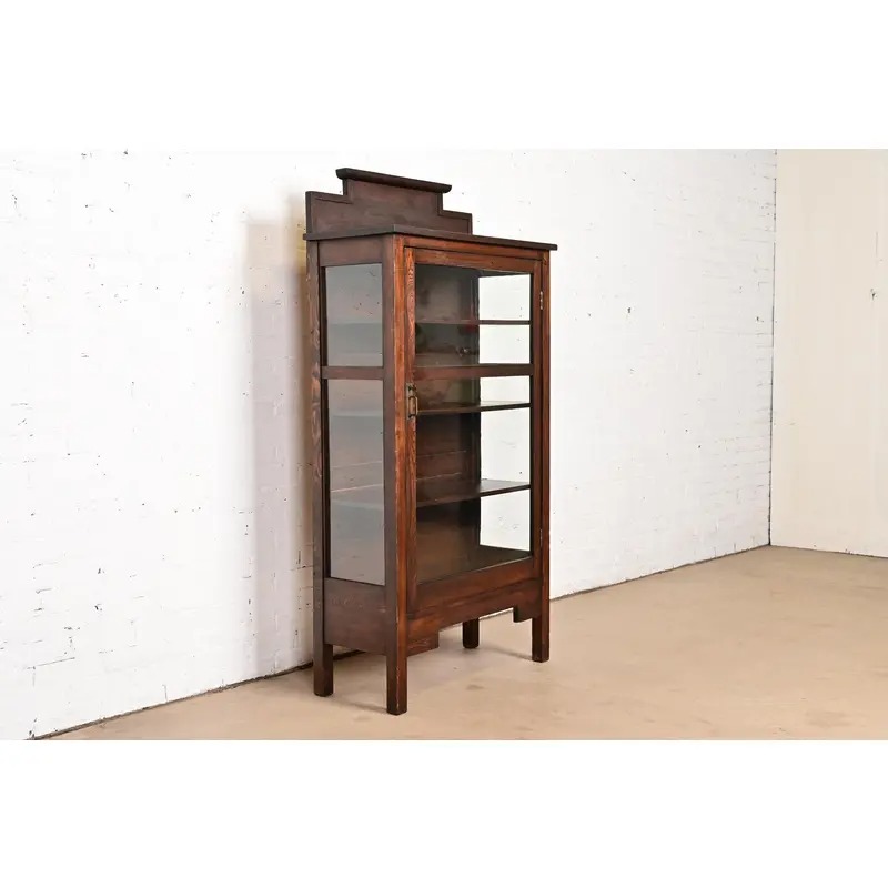 Oak, with glass front and sides, and original brass hardware. Cabinet locks, and key is included. Shelves are adjustable.