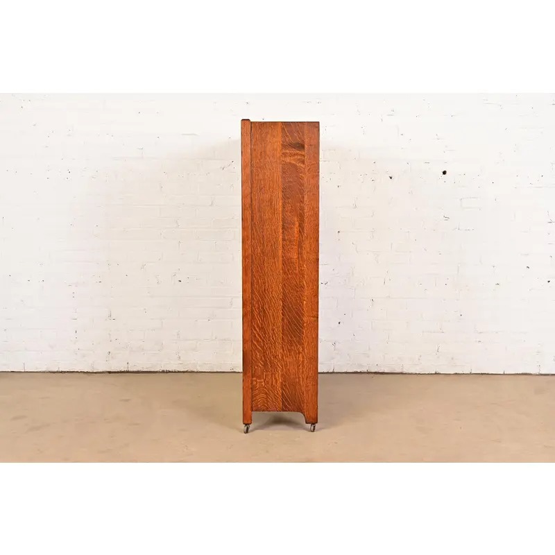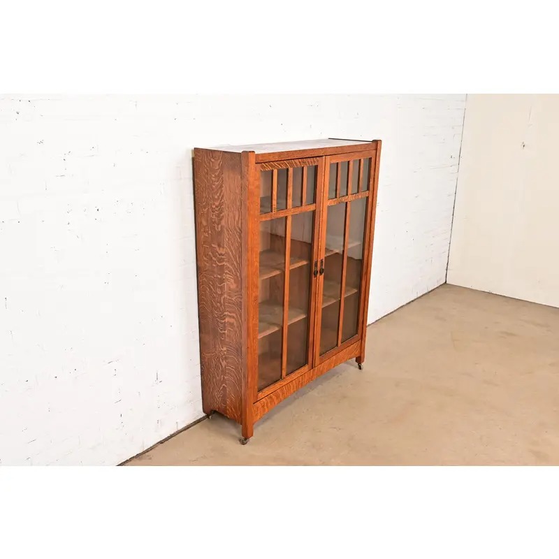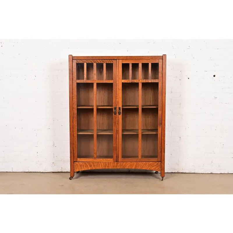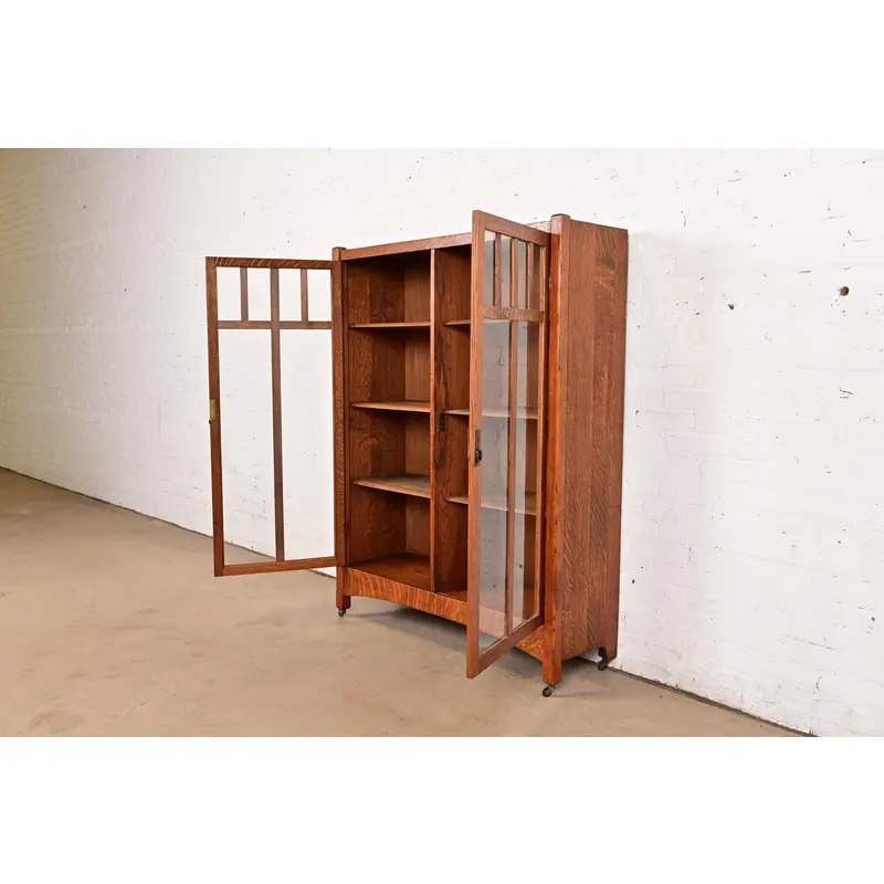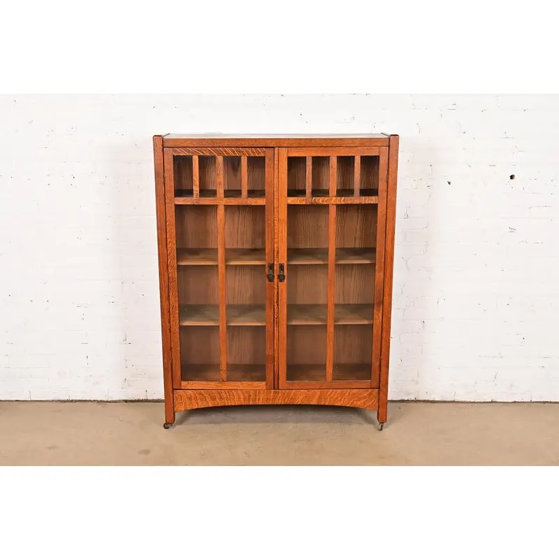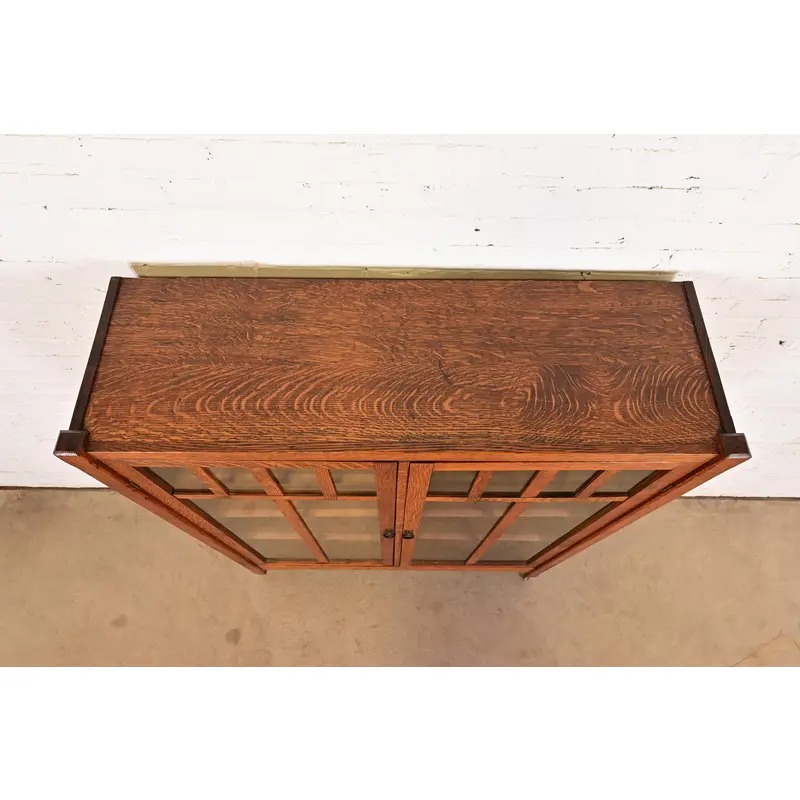 Limbert Style Mission Oak Arts & Crafts Glass Front Double Bookcase Cabinet, Circa 1900