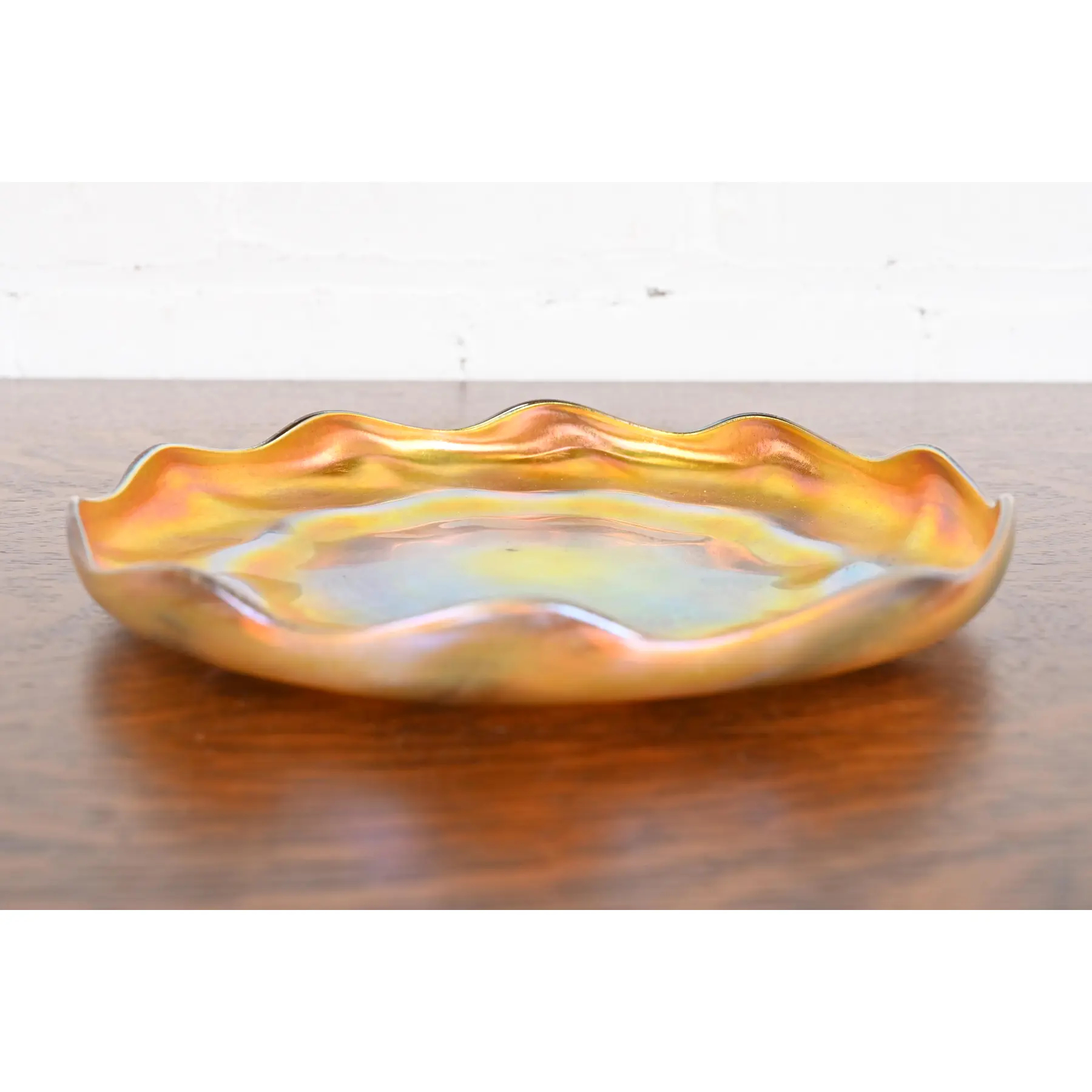 A gorgeous Arts & Crafts or Art Nouveau period Favrile iridescent art glass plate or tray with scalloped edge
