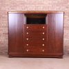 Exotic burled mahogany, with gold gilt floral details, beveled mirror, and unique original brass hardware.