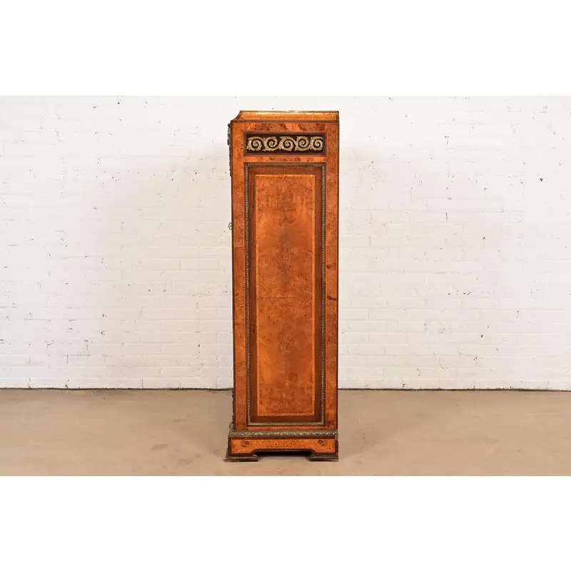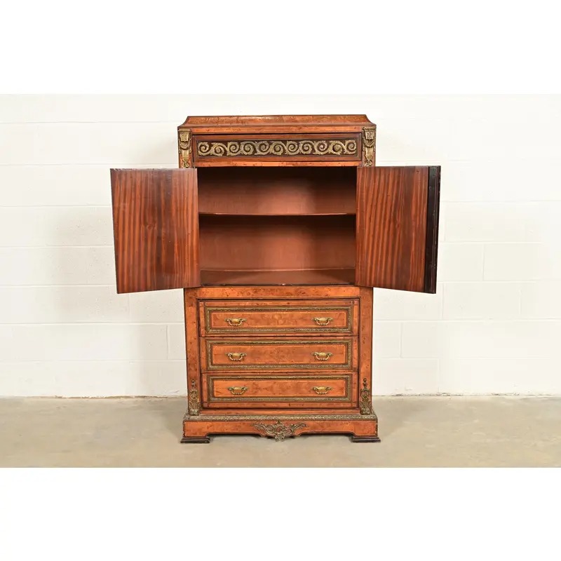 Maison Forest Style Antique French Empire Burl Wood Armoire Dresser or Gentleman’s Chest With Mounted Ormolu, Circa 1880s
