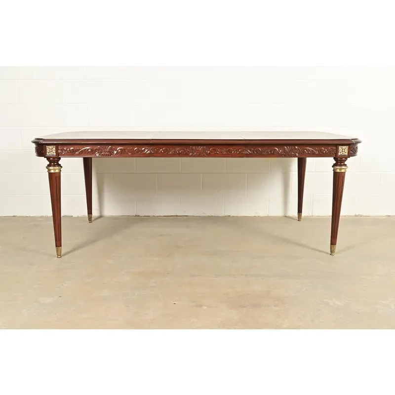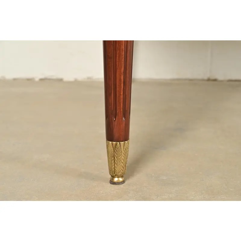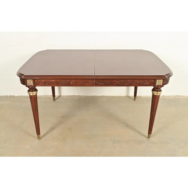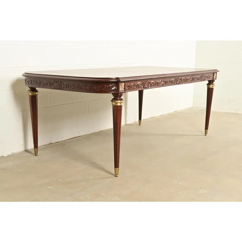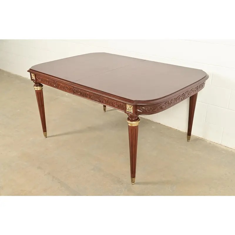 Gorgeous book-matched mahogany top, with carved mahogany apron and legs, and mounted gilt bronze ormolu.
