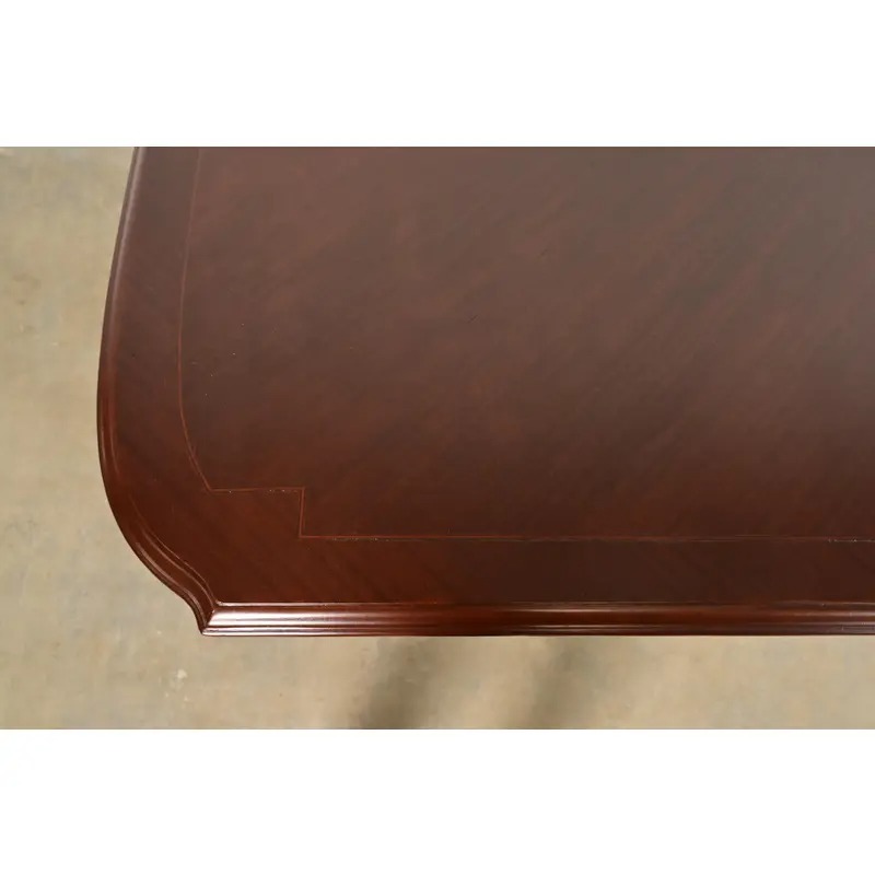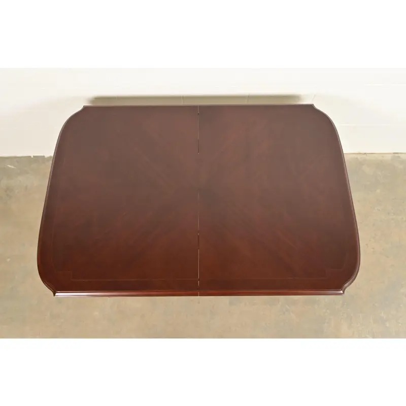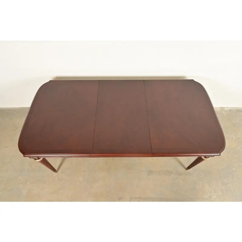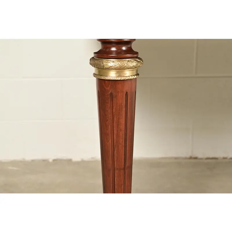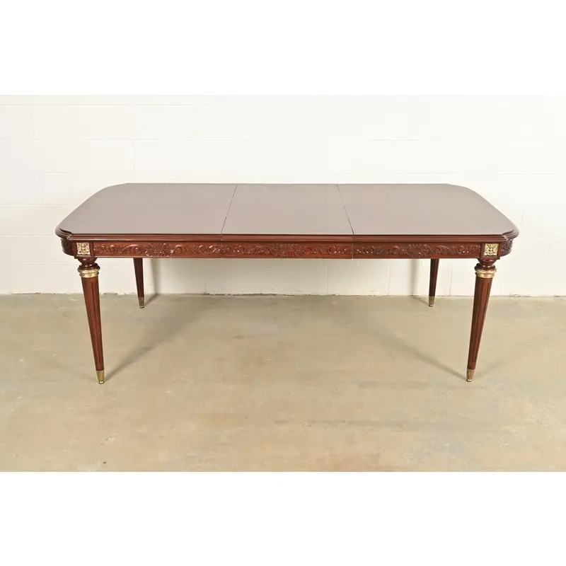 Gorgeous book-matched mahogany top, with carved mahogany apron and legs, and mounted gilt bronze ormolu.