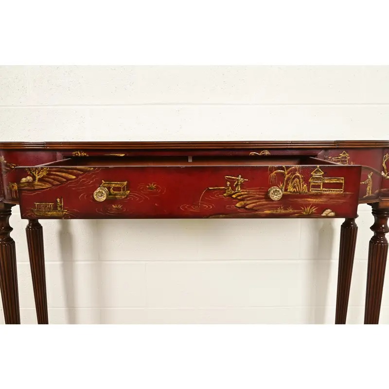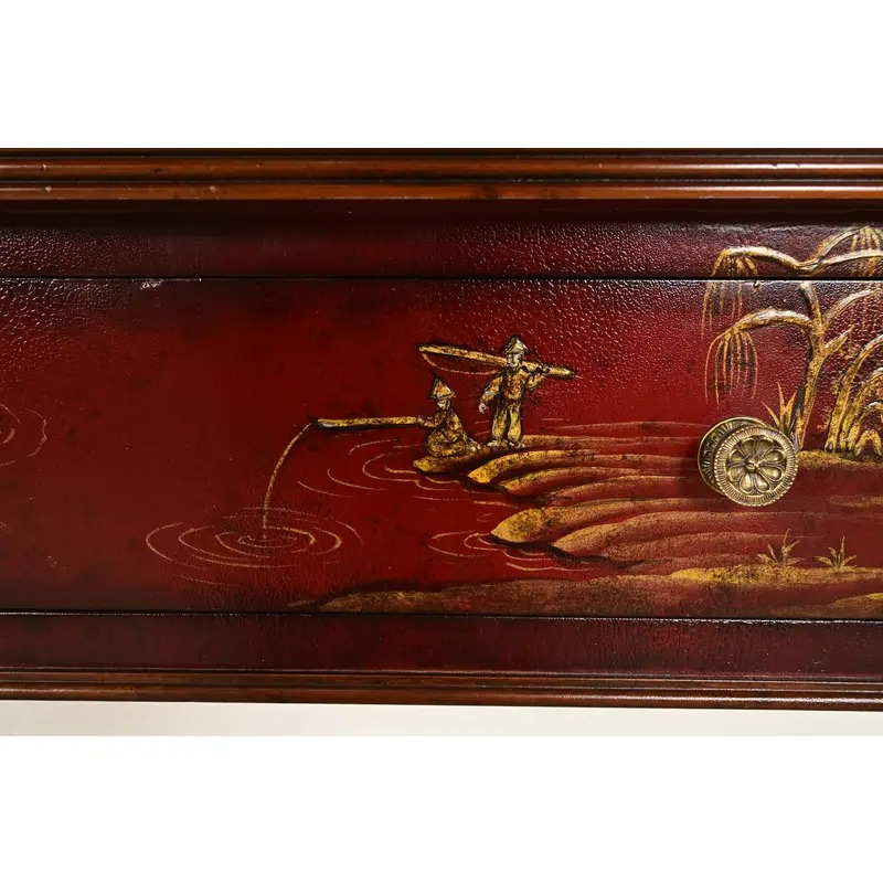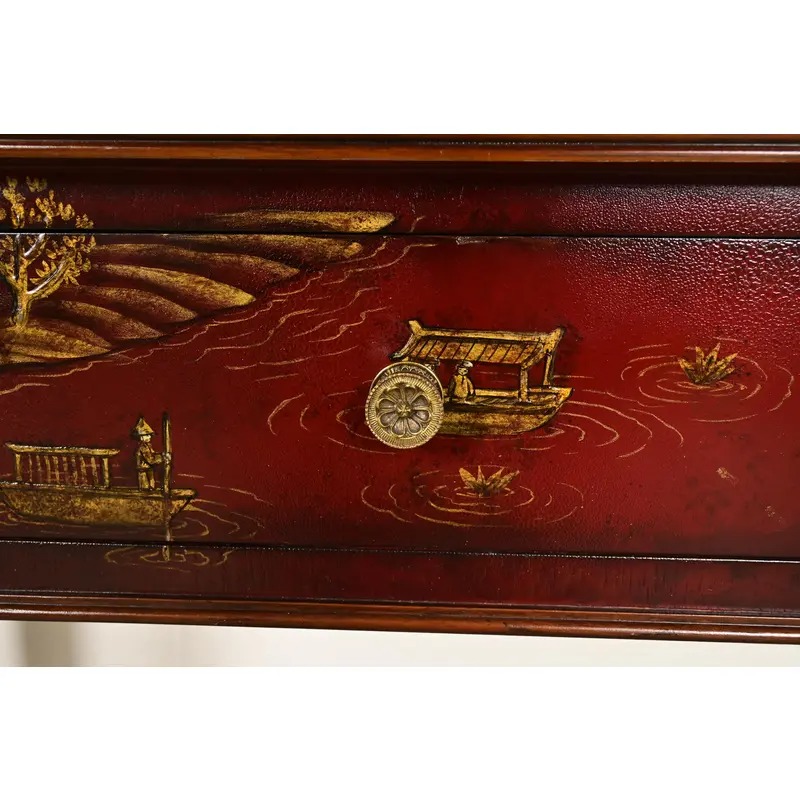 Red lacquered finish, with hand-painted Chinese scenes, banded flame mahogany top, carved mahogany legs, and original brass hardware.