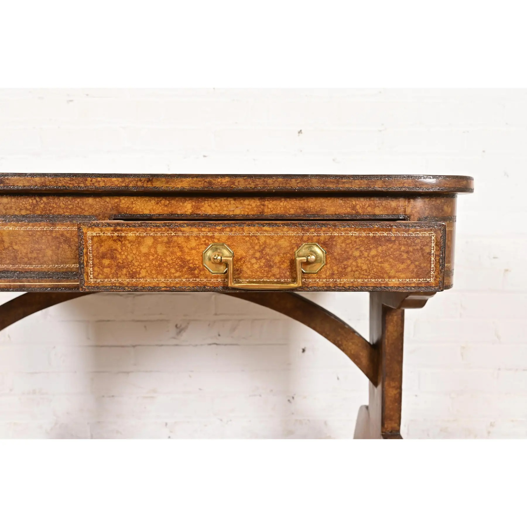 Embossed leather, with original brass hardware and brass paw feet on casters.