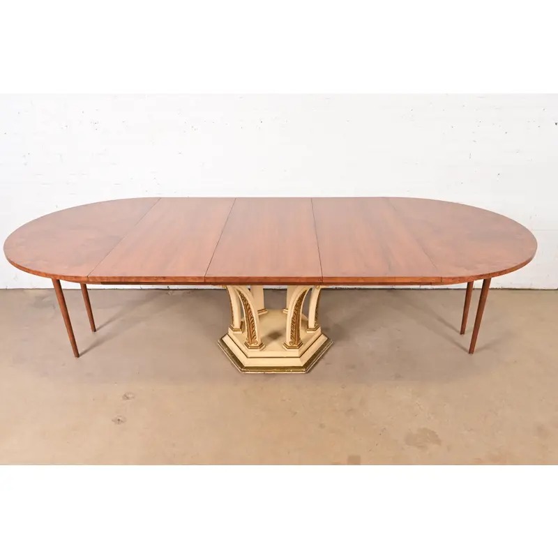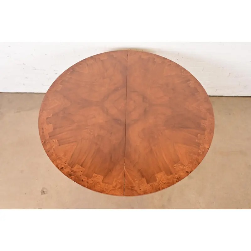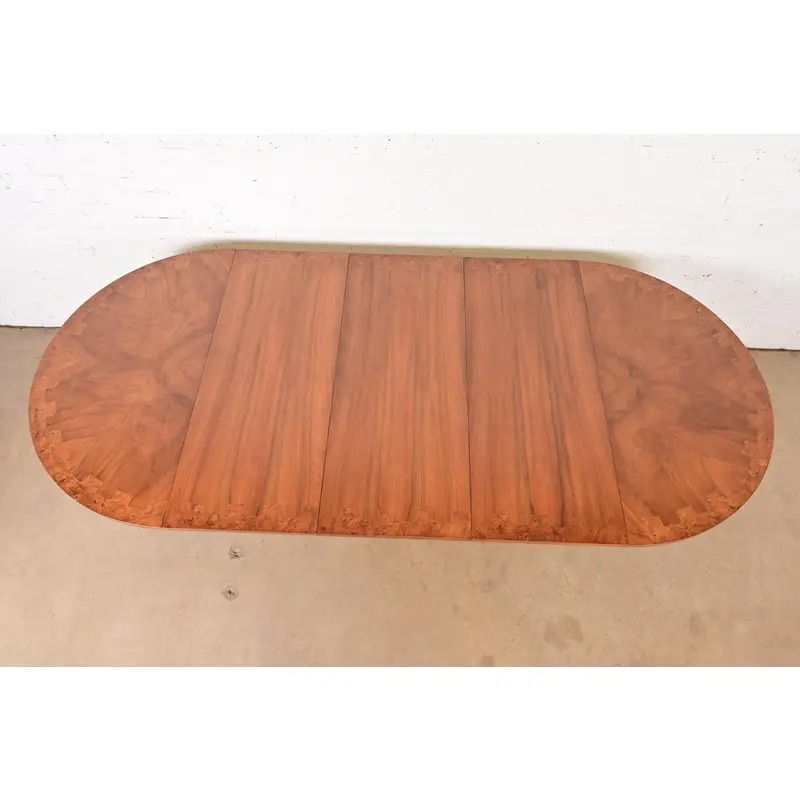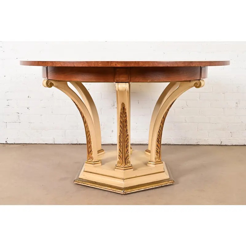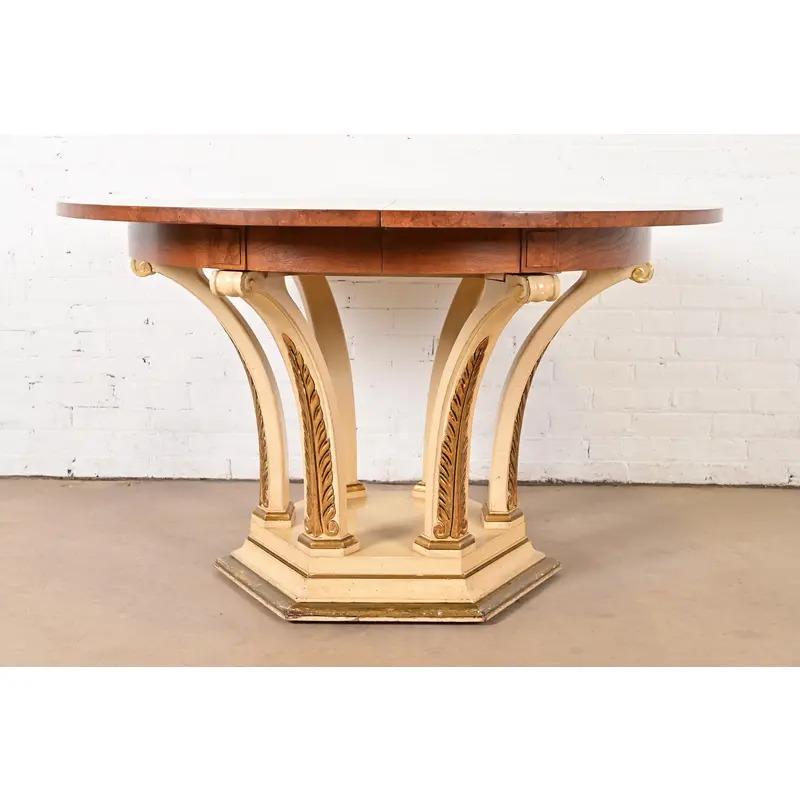 Mastercraft Italian Neoclassical Walnut and Burl Wood Parcel Gilt Pedestal Extension Dining Table
