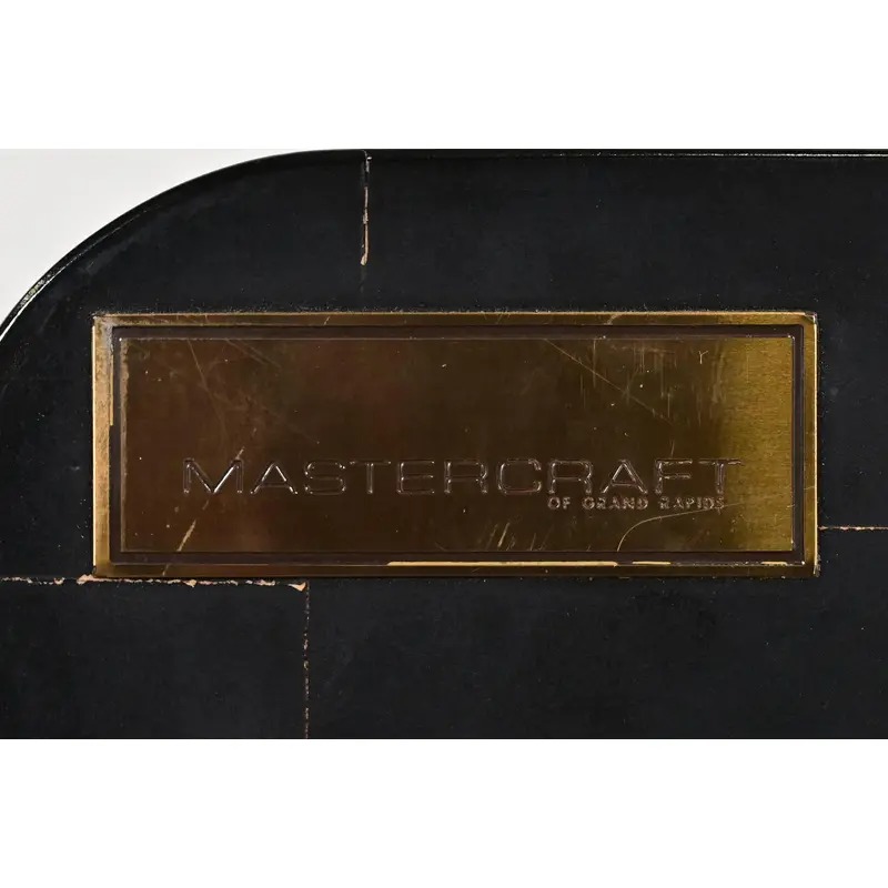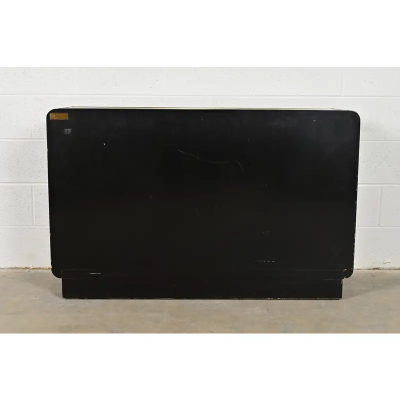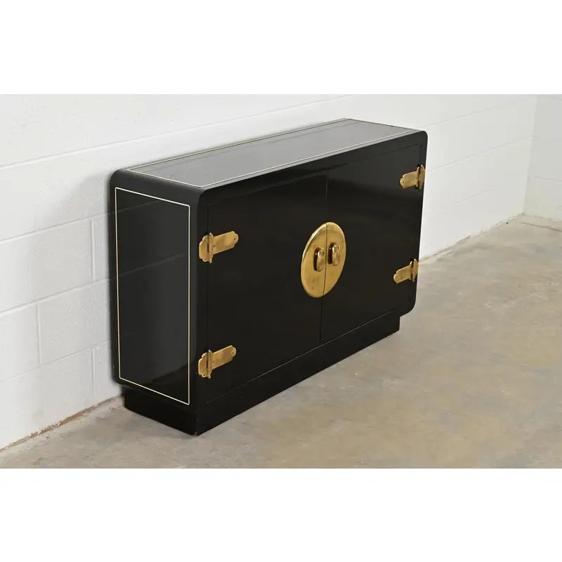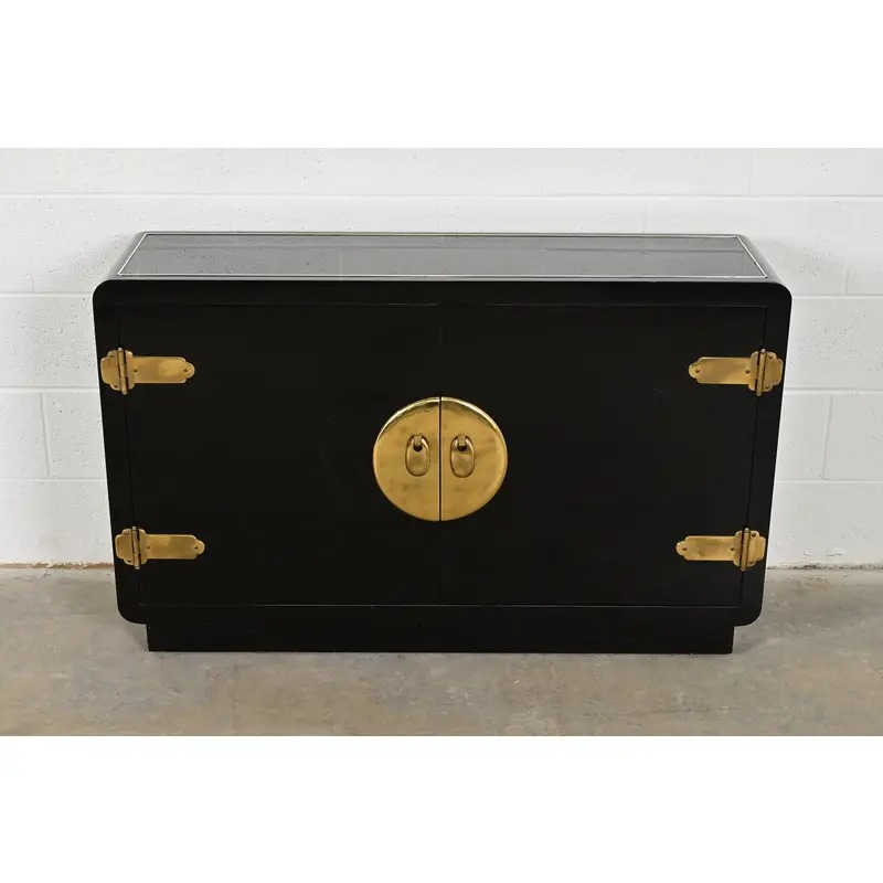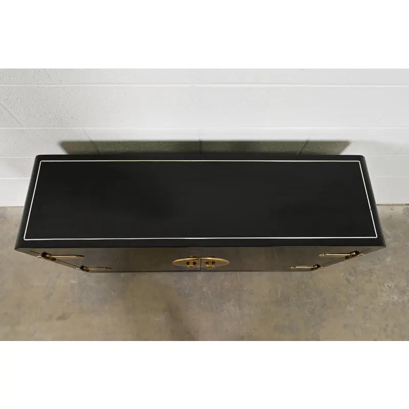 Black lacquered walnut case, with brass trim and Asian-inspired brass hardware.