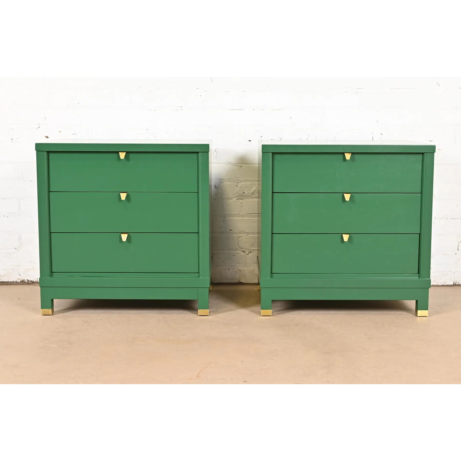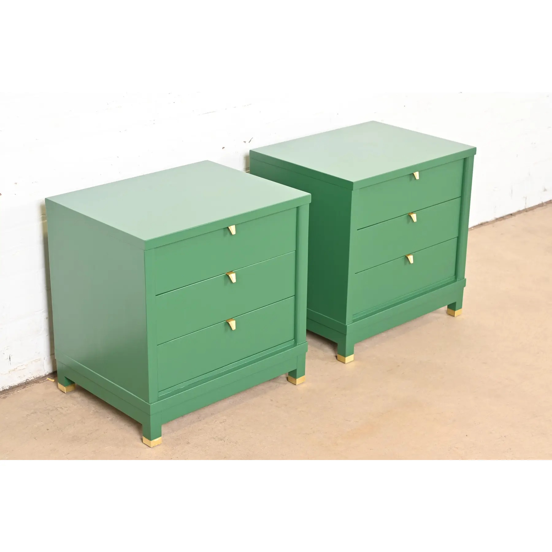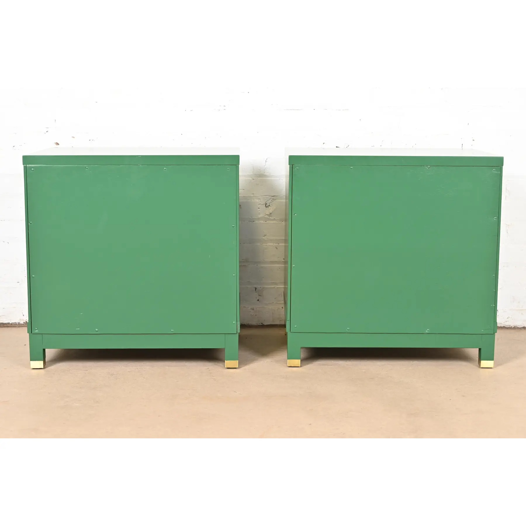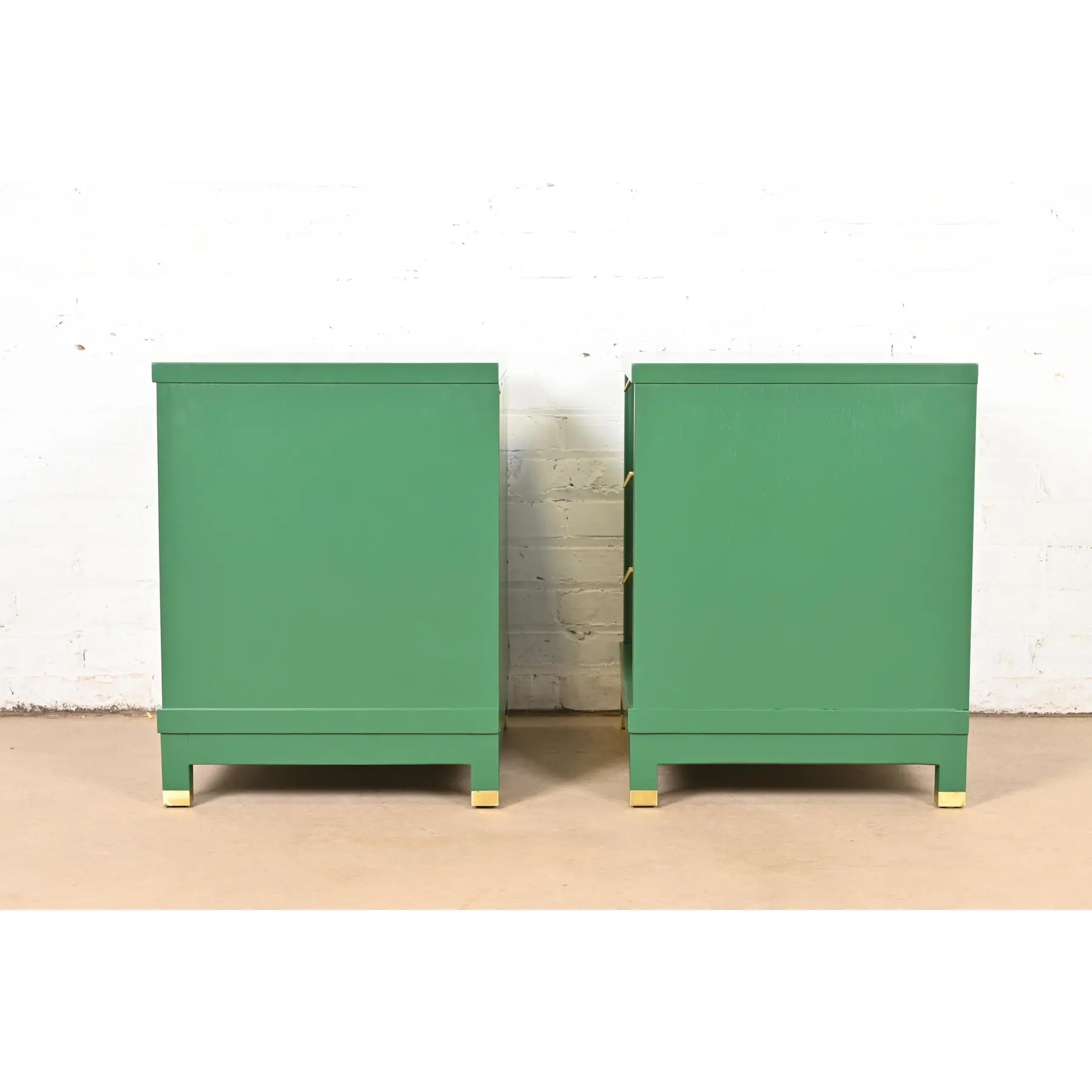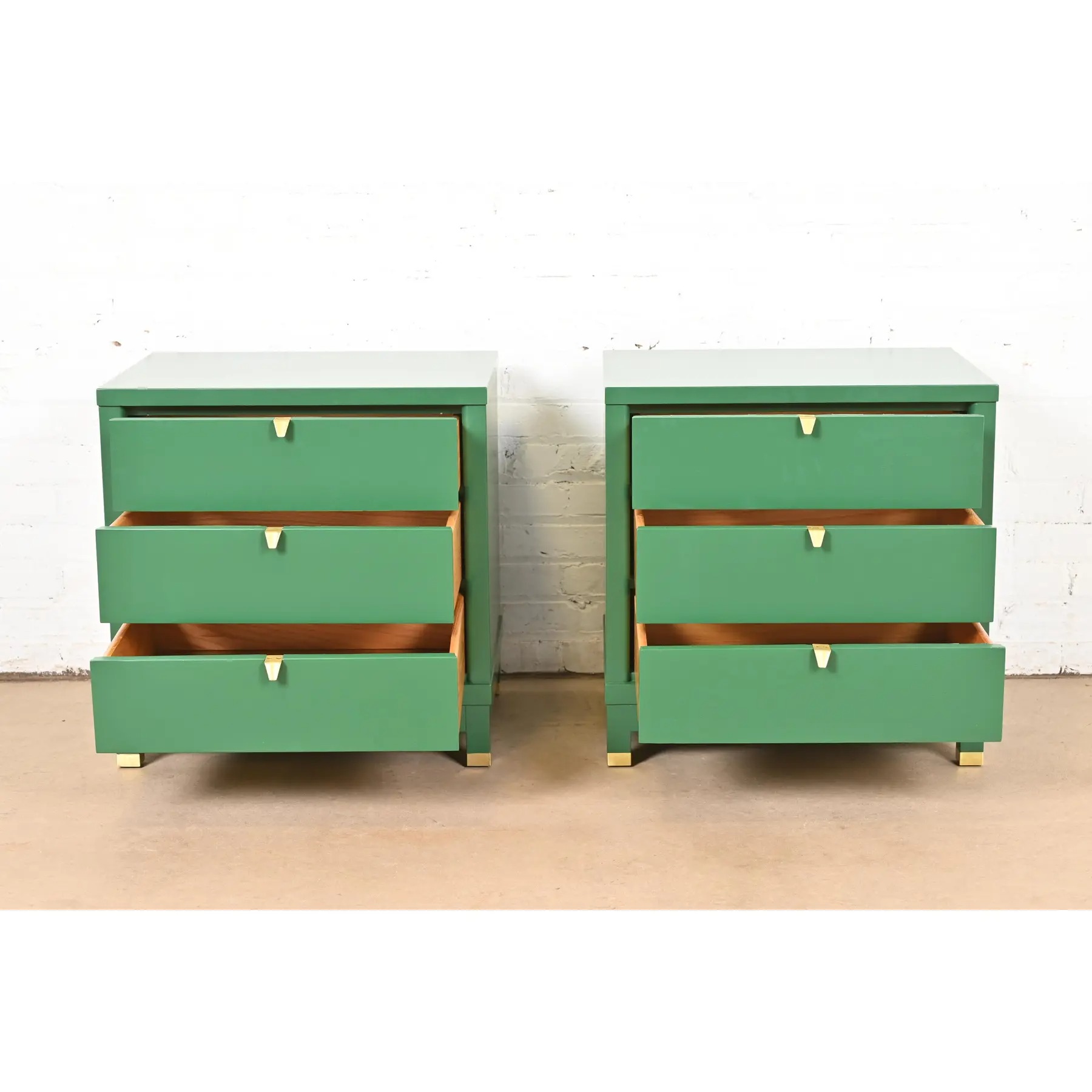 A gorgeous pair of mid-century modern Hollywood Regency Campaign style three-drawer nightstands, bedside chests, or end tables