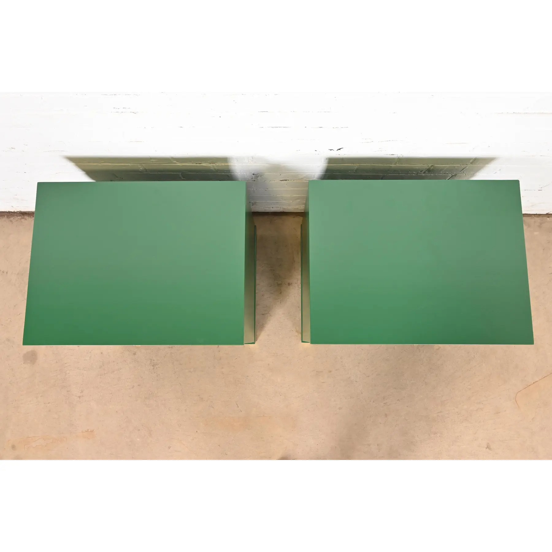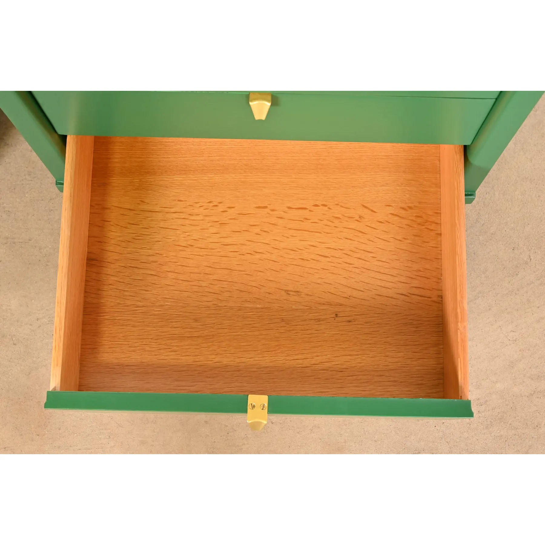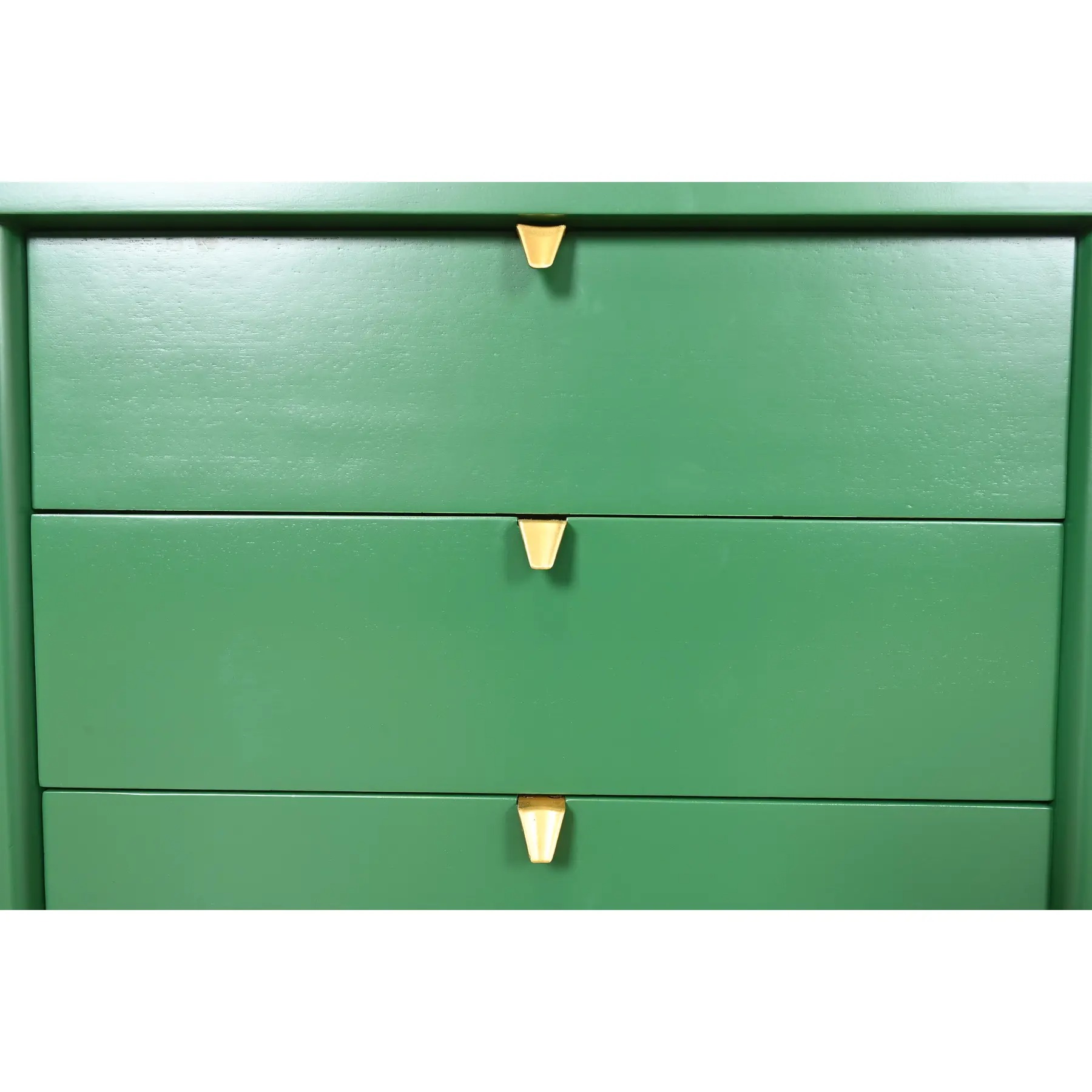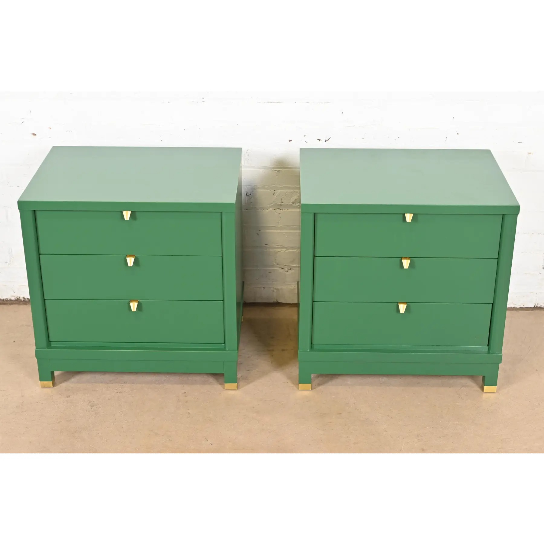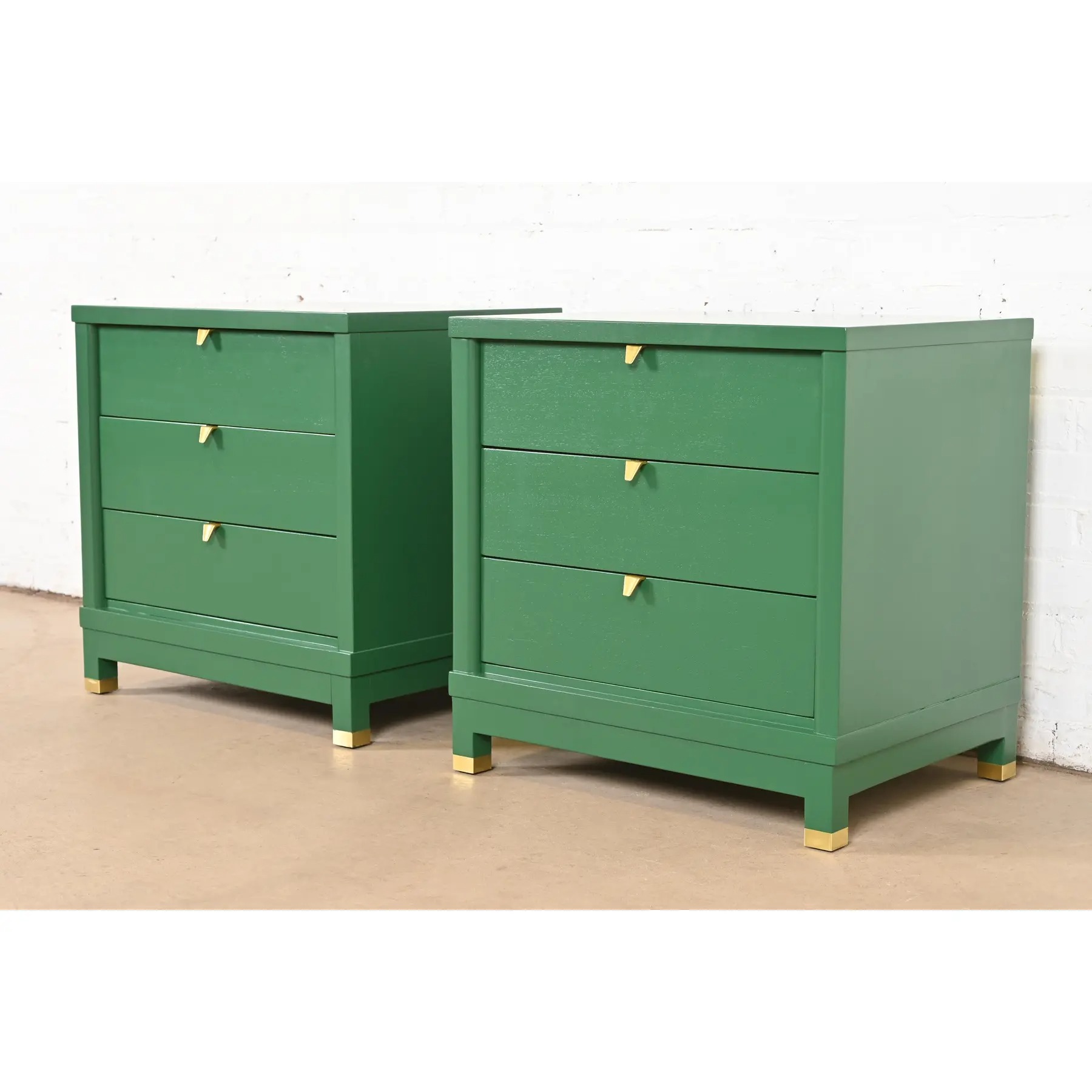 A gorgeous pair of mid-century modern Hollywood Regency Campaign style three-drawer nightstands, bedside chests, or end tables