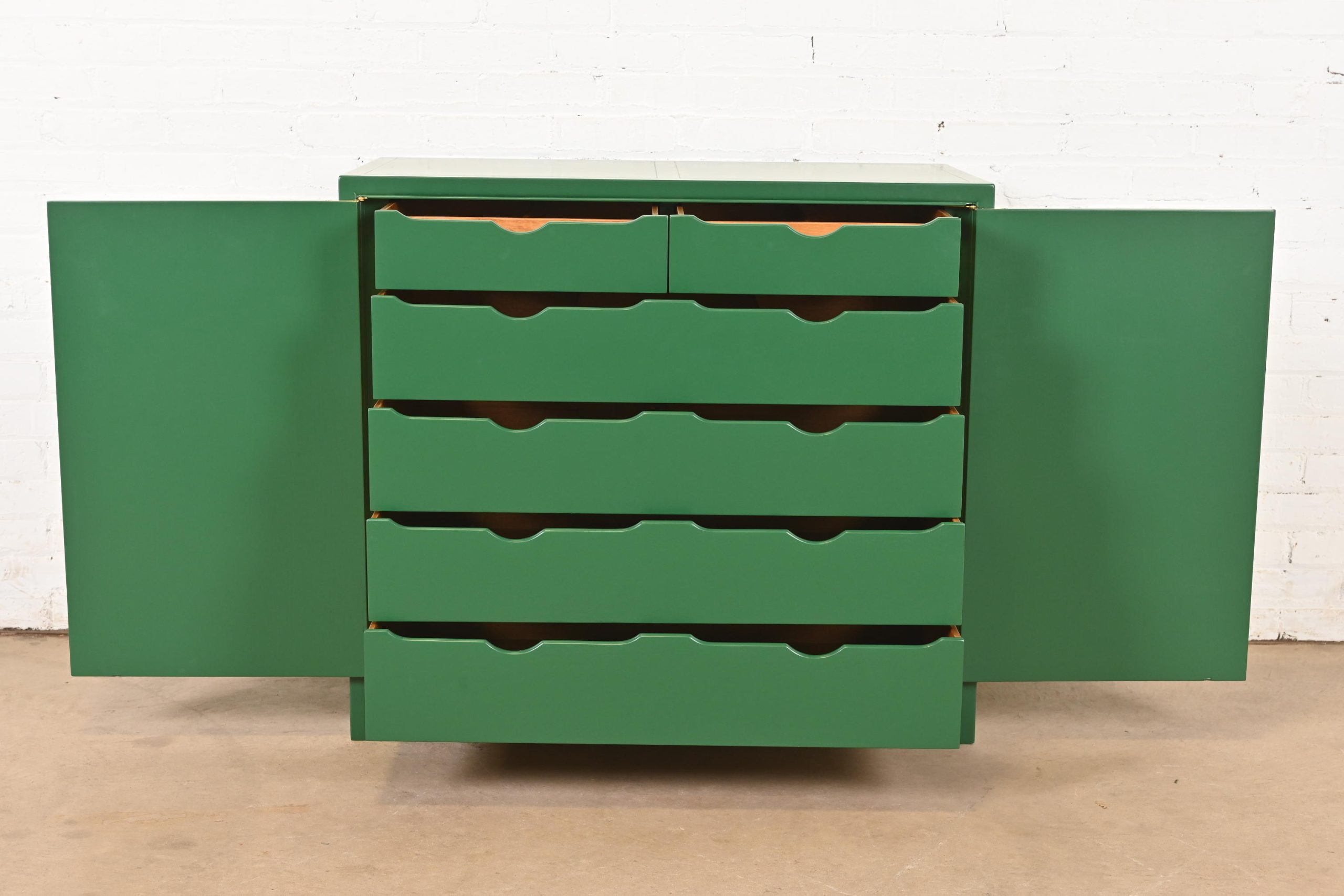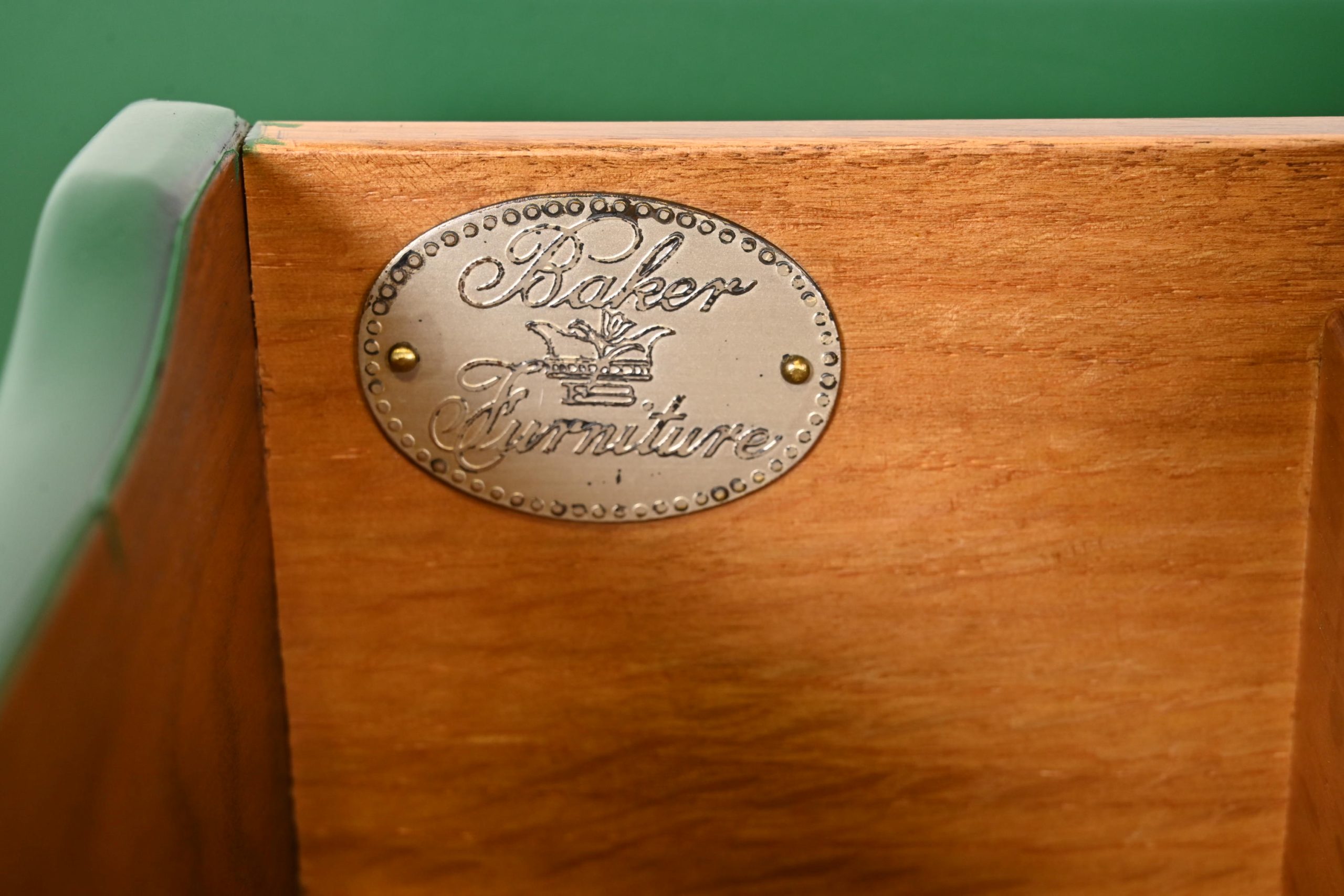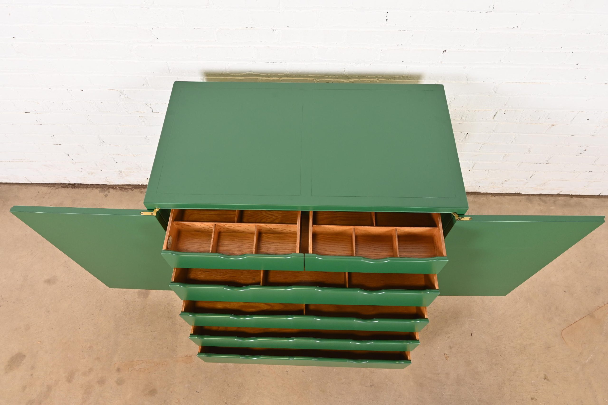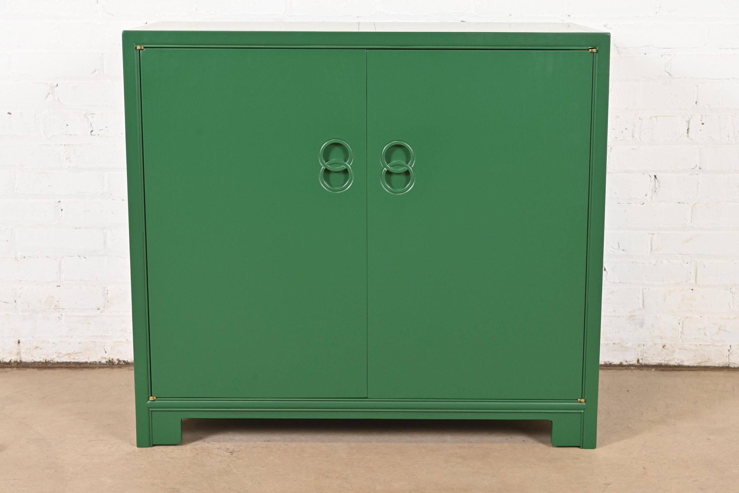 Green lacquered walnut, with carved Asian-inspired drawer pulls.