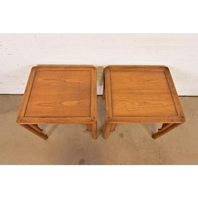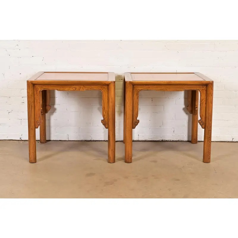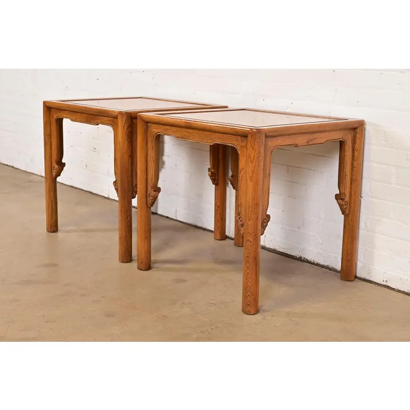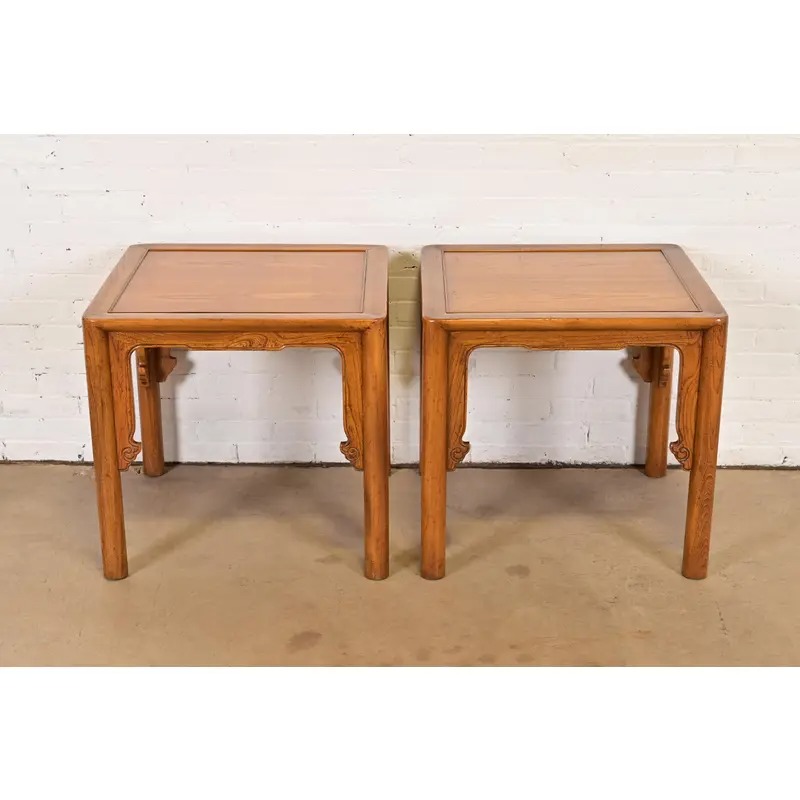 Michael Taylor for Baker Furniture Mid-Century Hollywood Regency Chinoiserie Carved Elm Side Tables, Pair