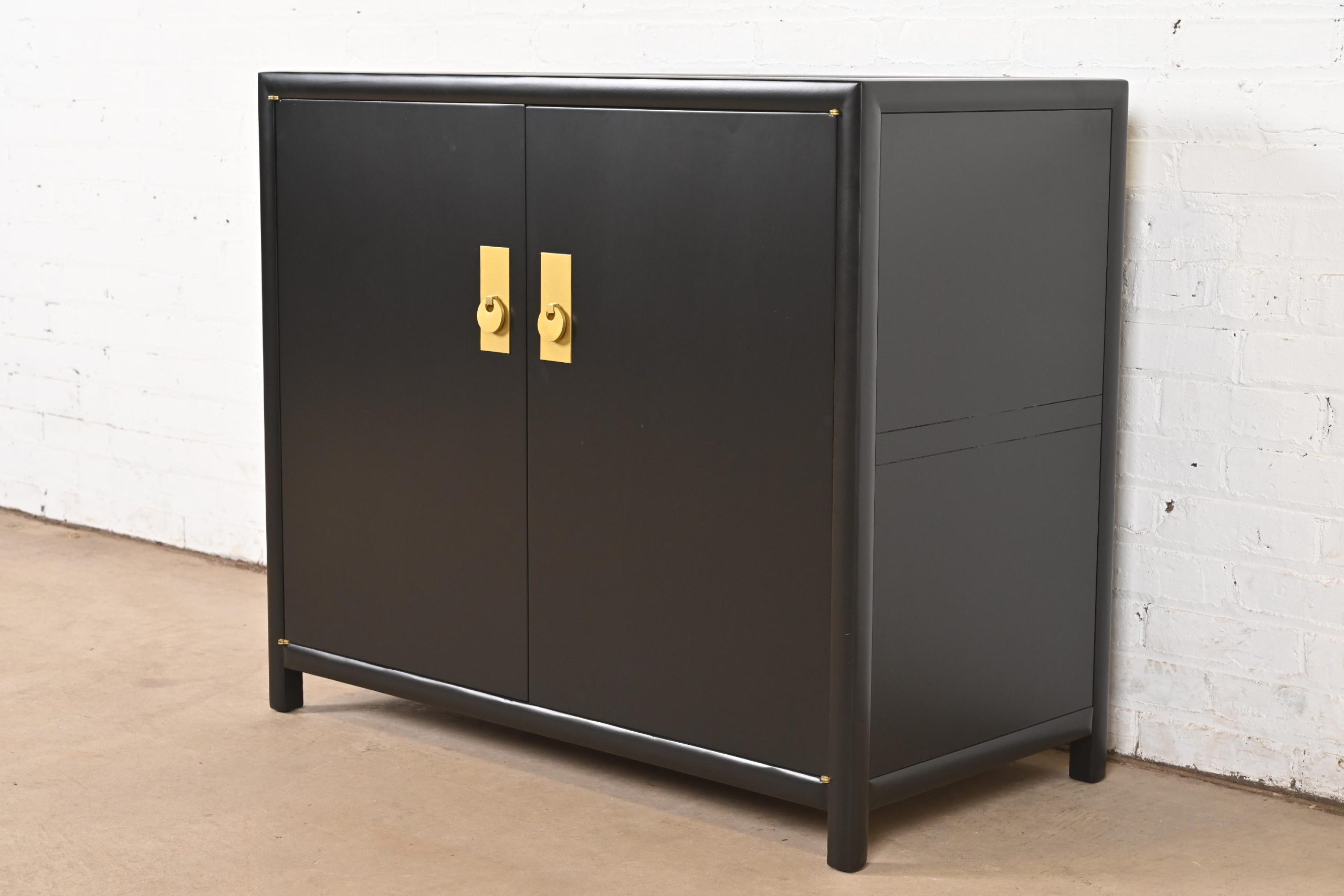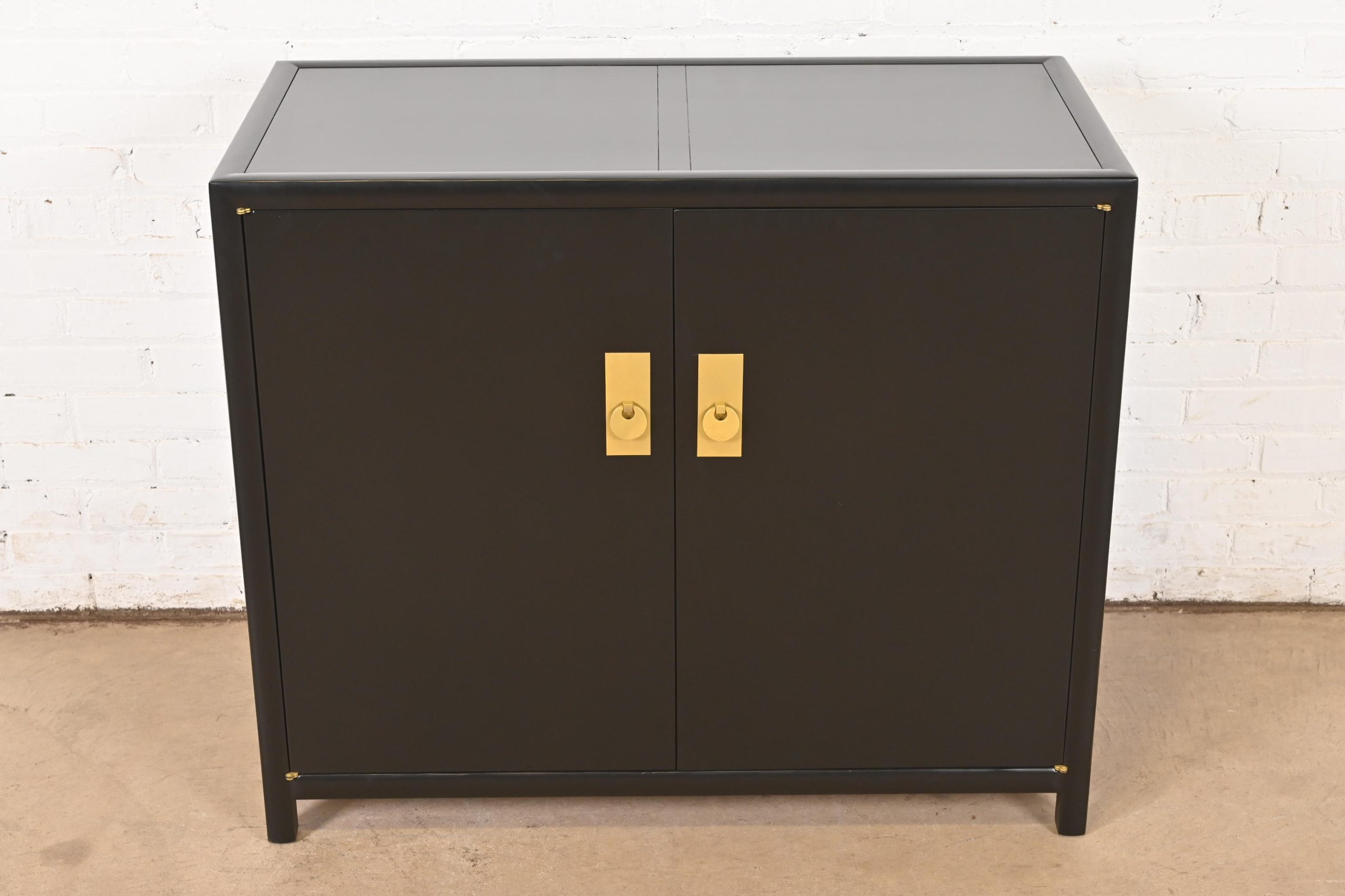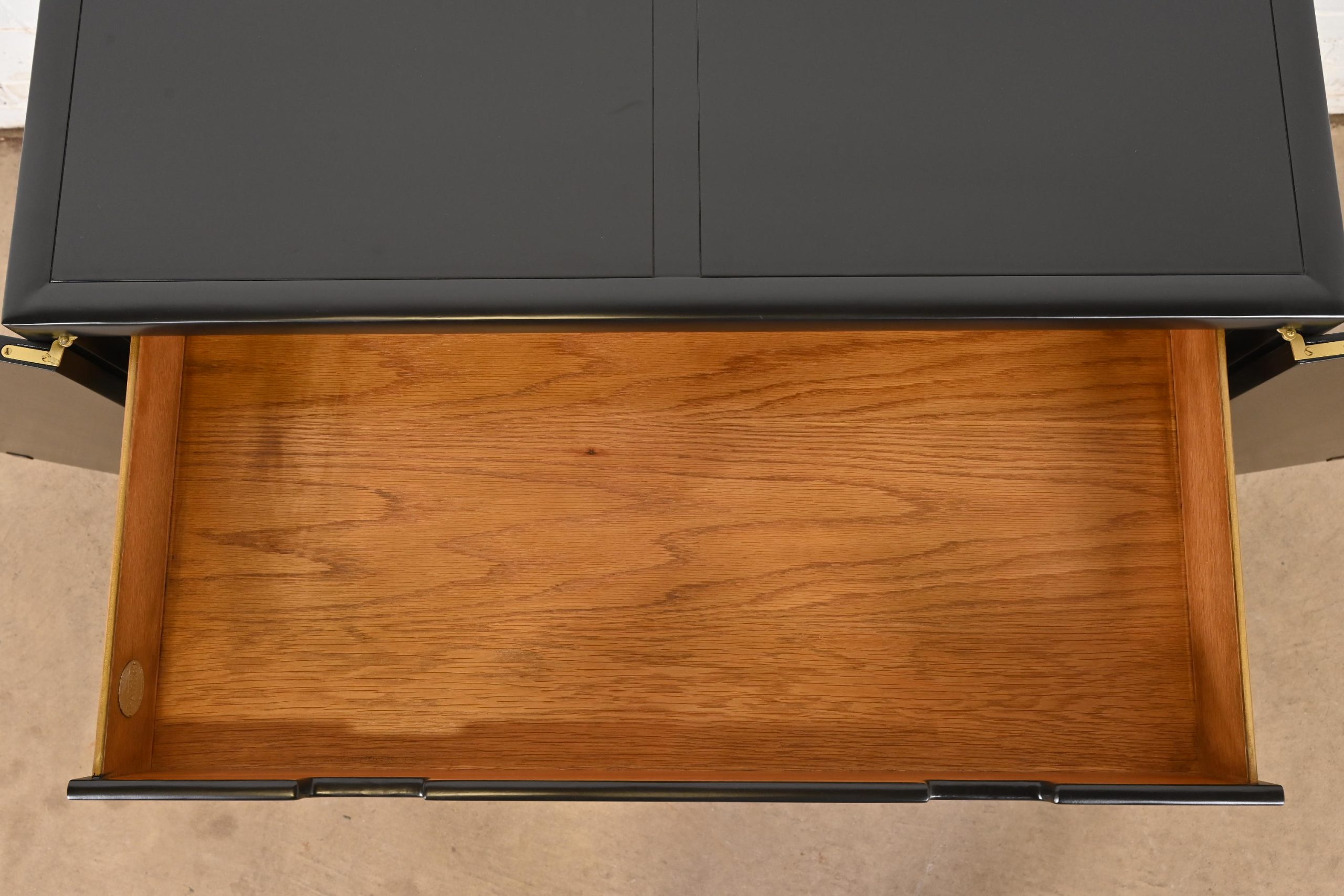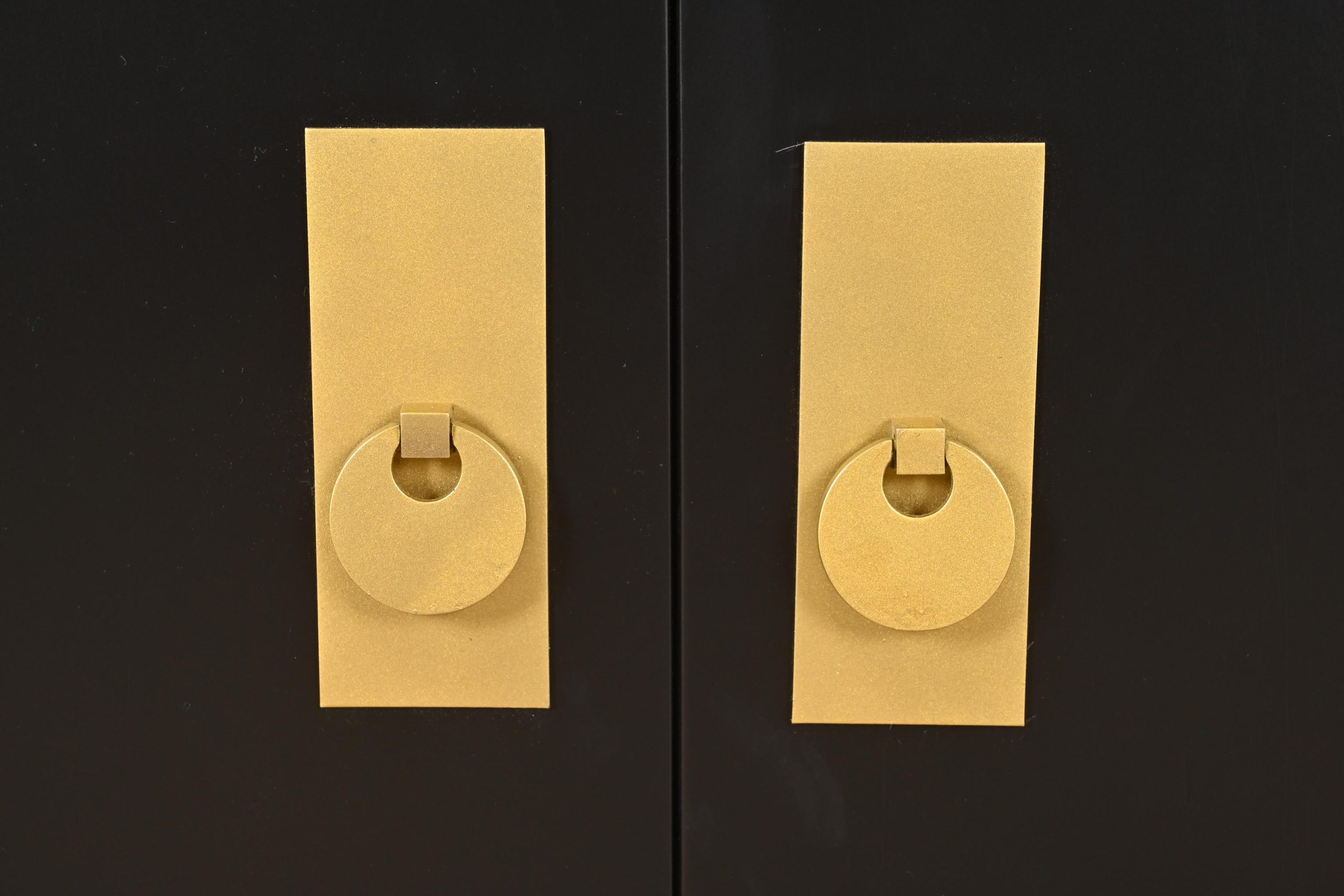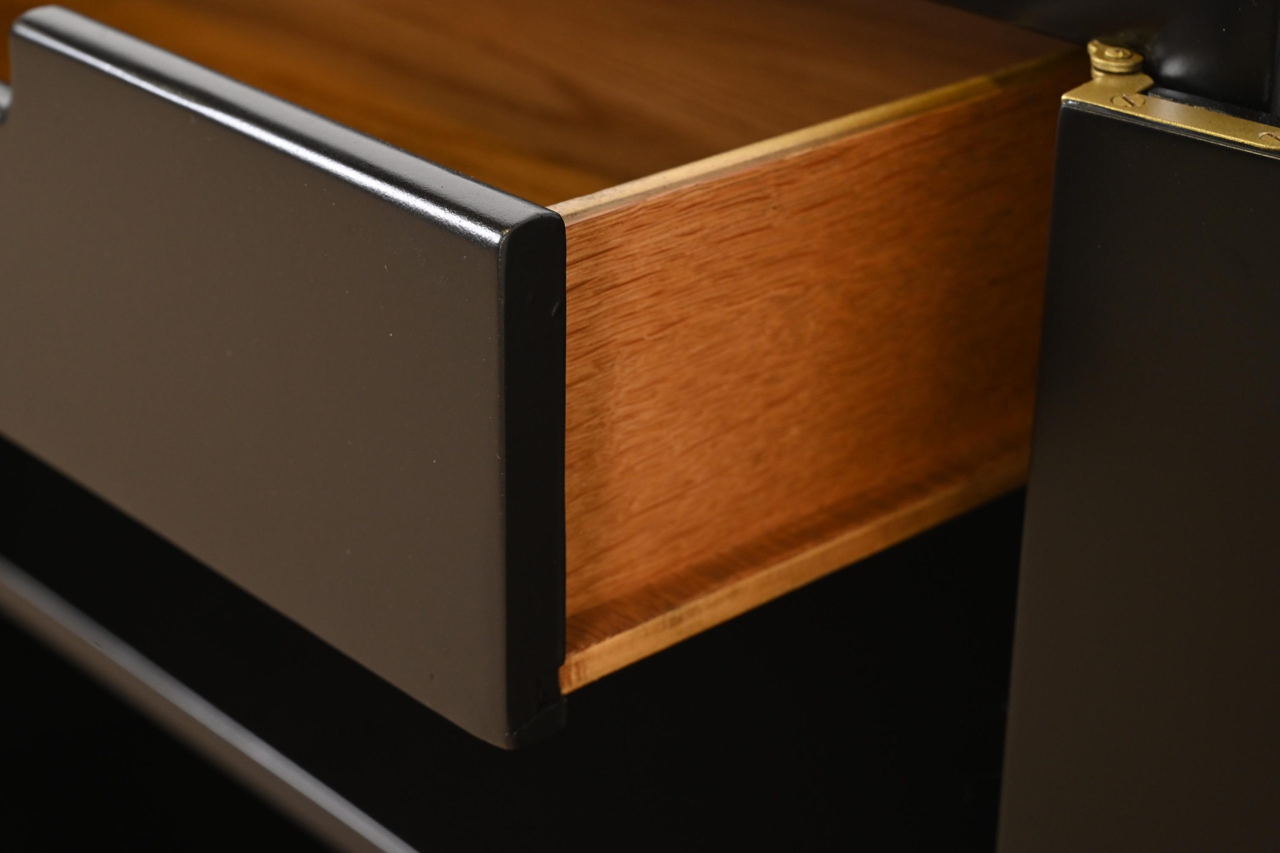 Black lacquered cherry wood, with original Asian-inspired brass hardware.