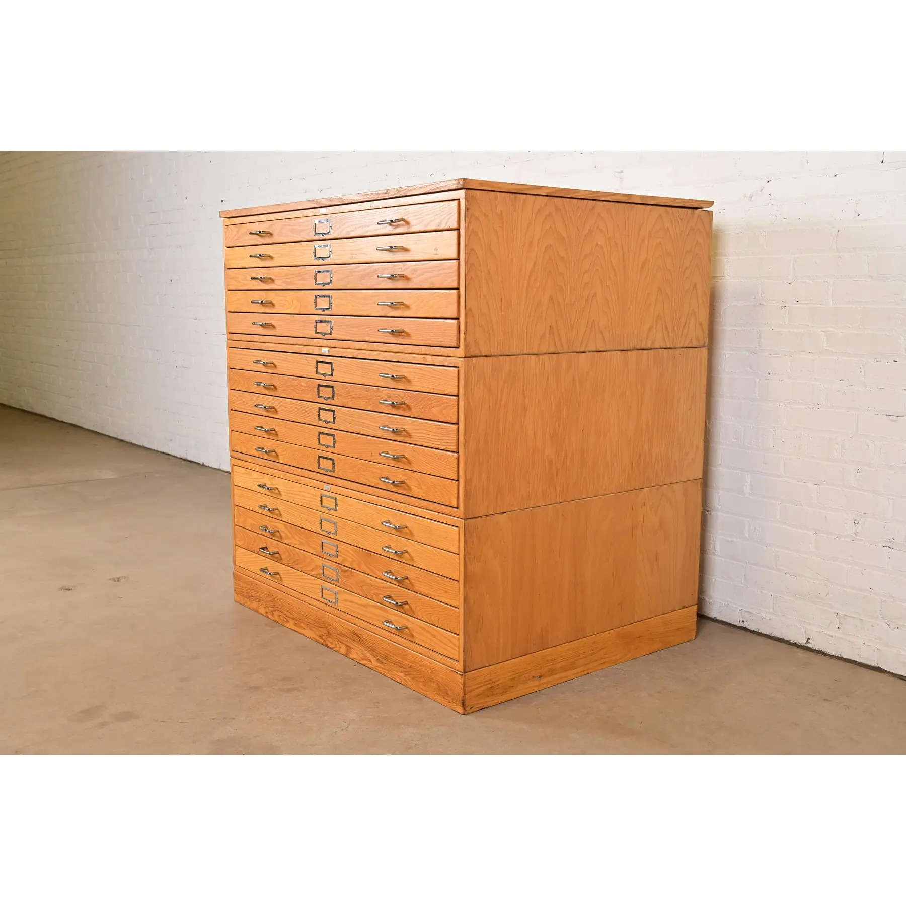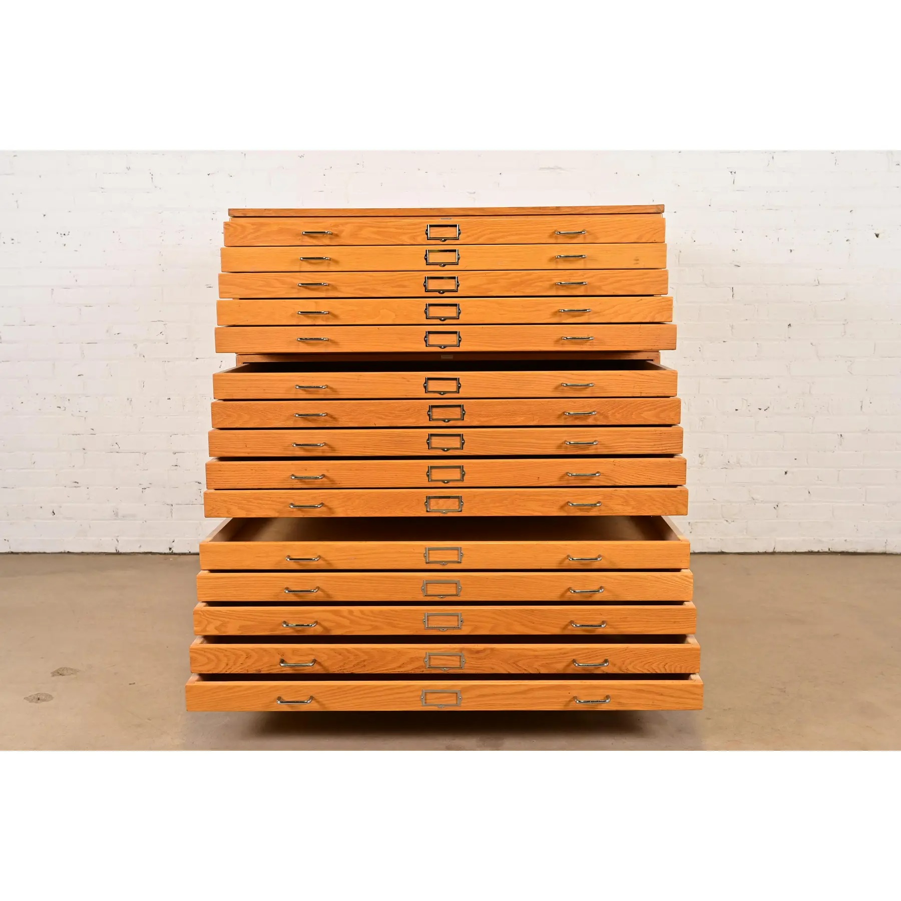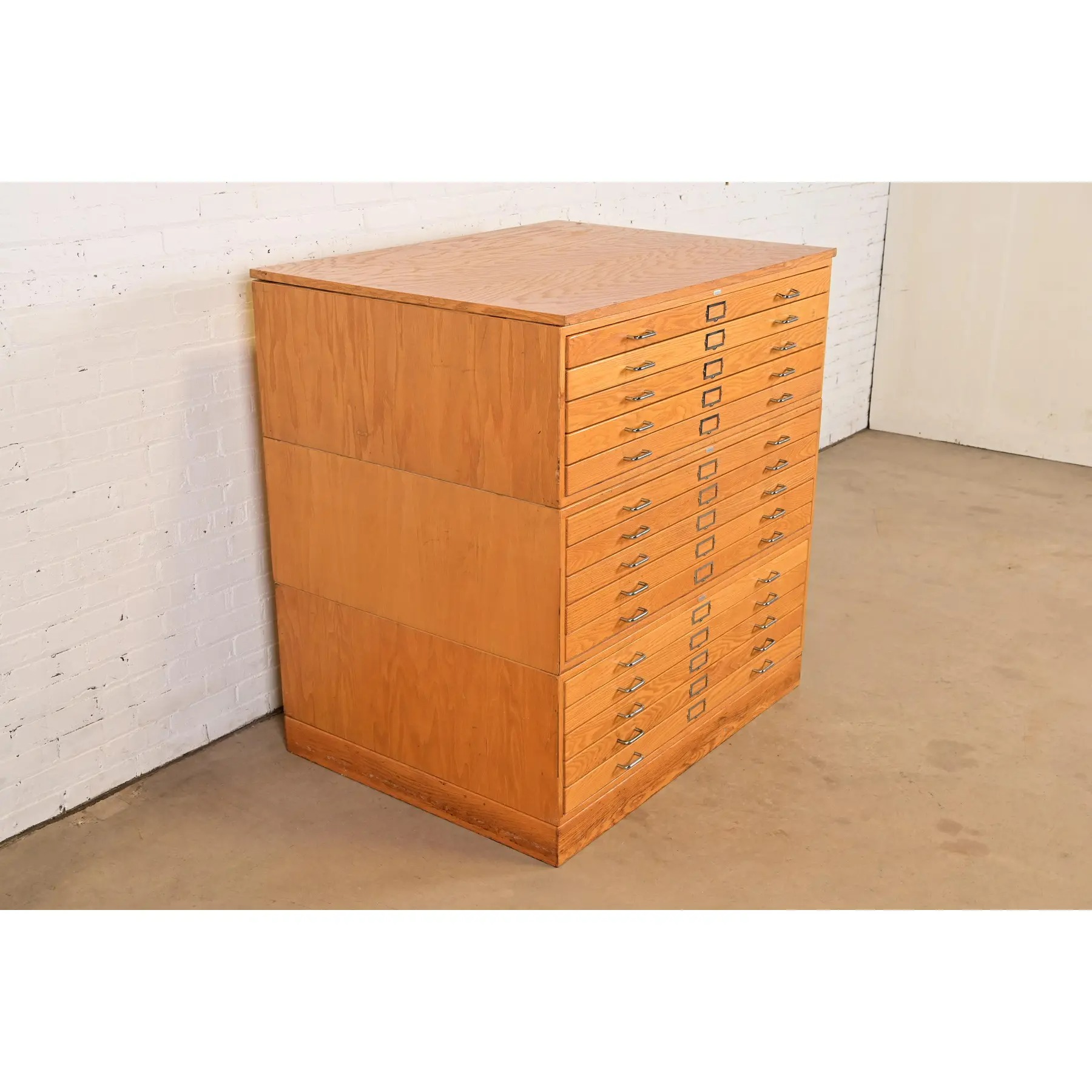 An exceptional vintage Mid-Century Modern or Arts & Crafts style oak 15-drawer architect’s blueprint flat file cabinet, map file, or art cabinet