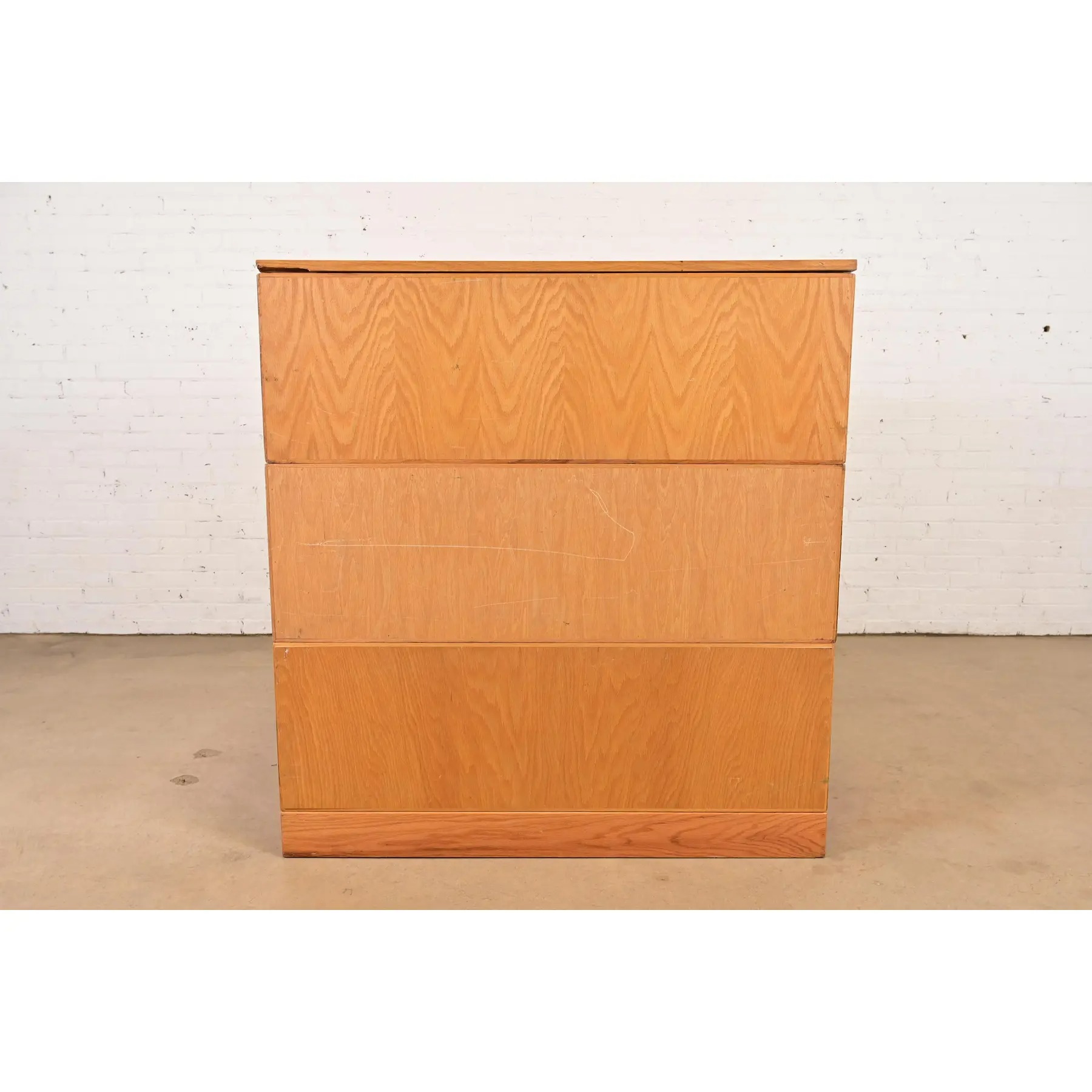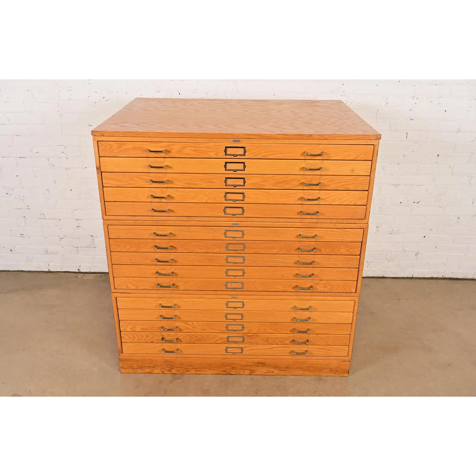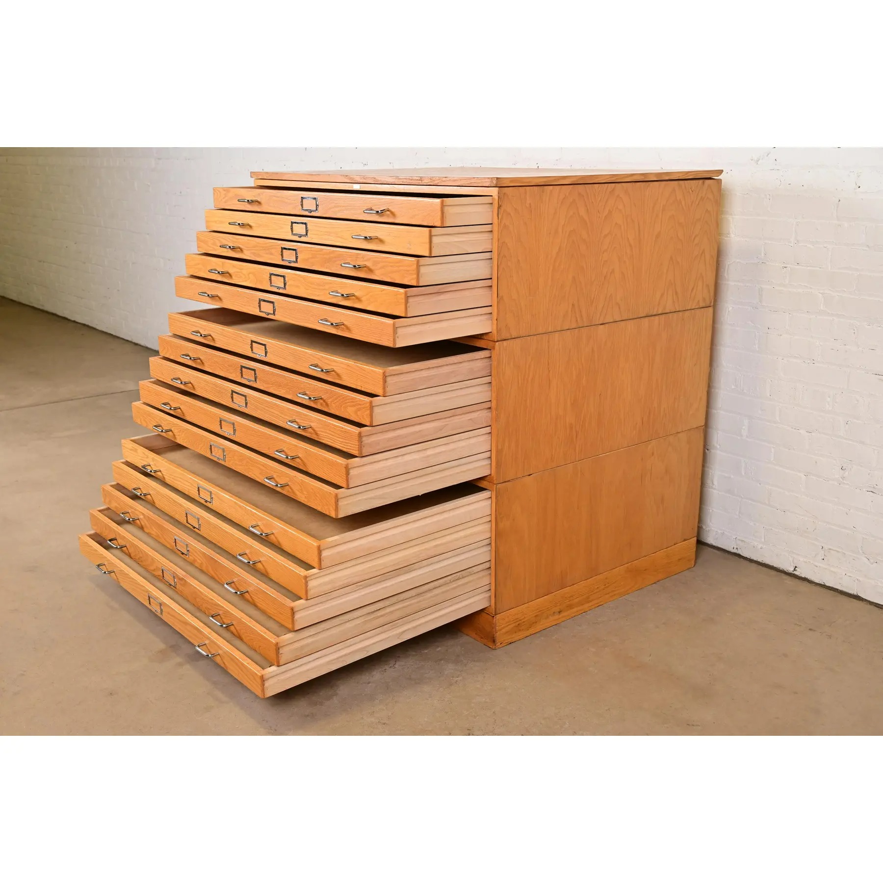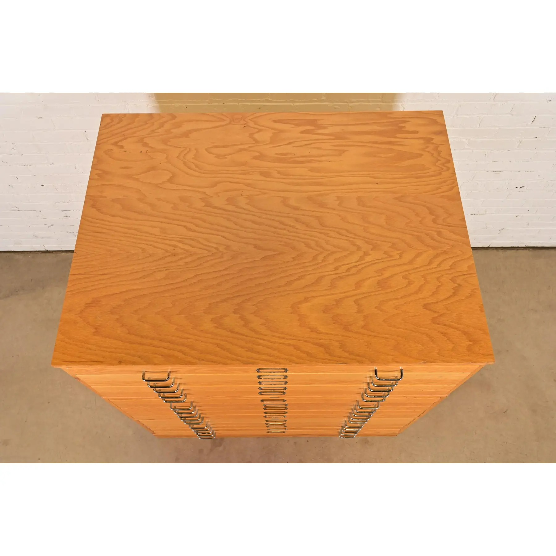 An exceptional vintage Mid-Century Modern or Arts & Crafts style oak 15-drawer architect’s blueprint flat file cabinet, map file, or art cabinet