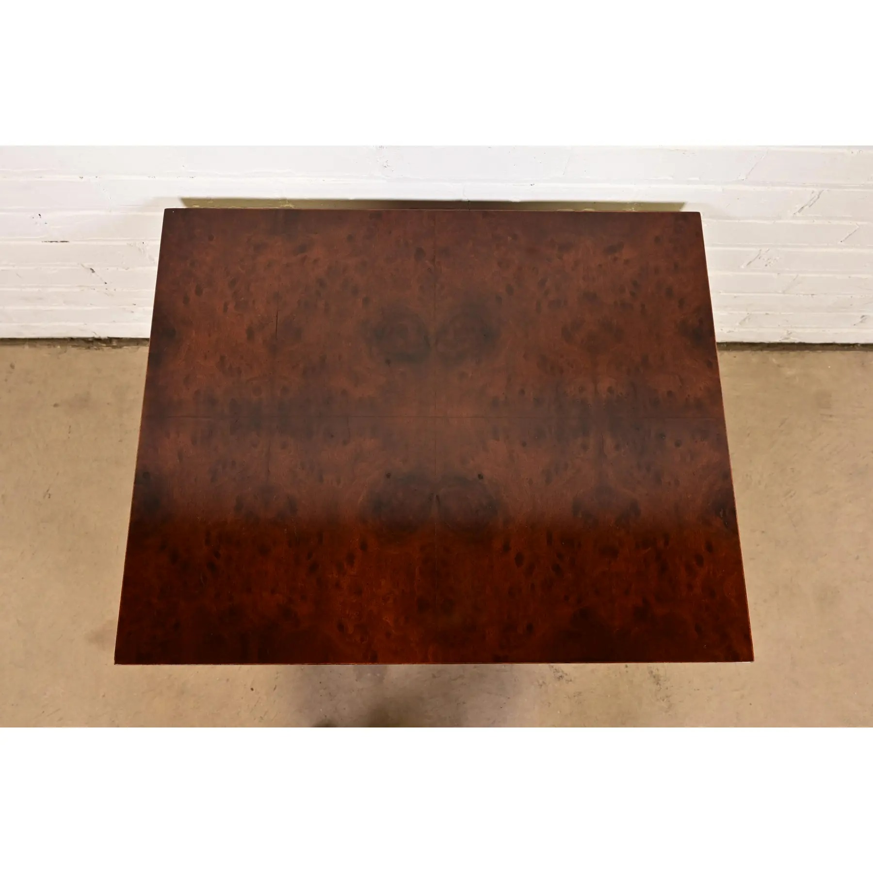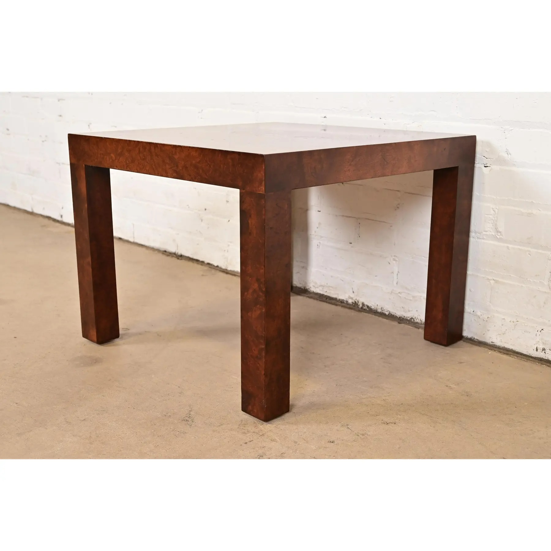 A sleek and stylish Mid-Century Modern Parsons side table in gorgeous book-matched burl wood