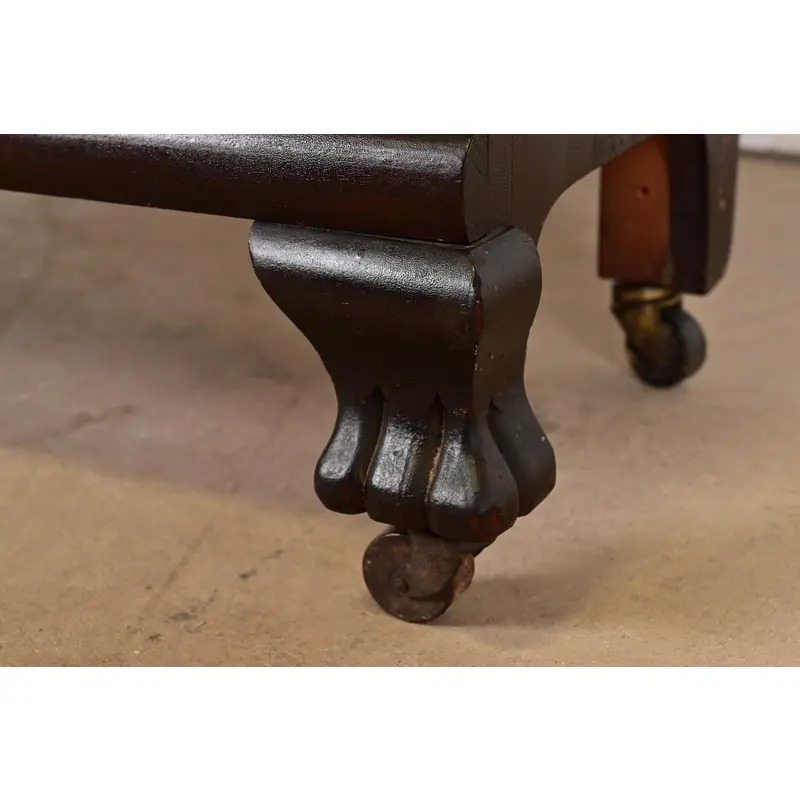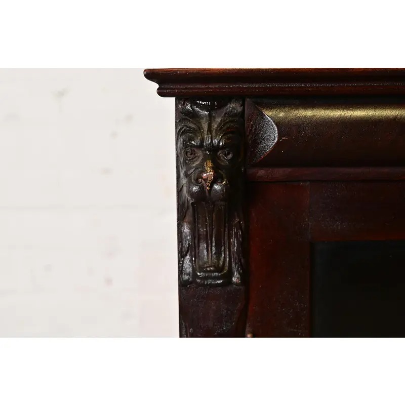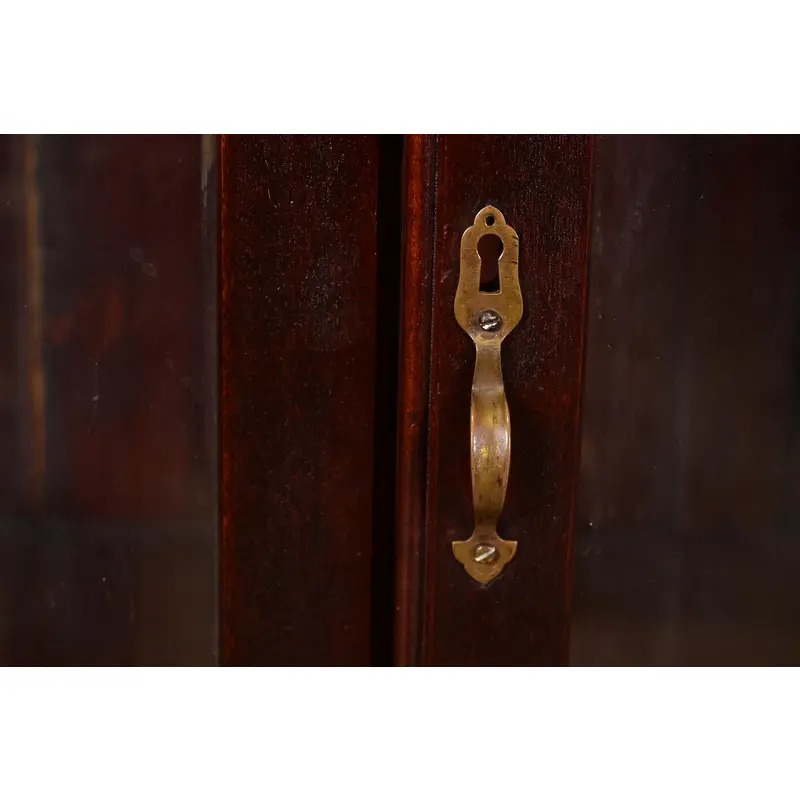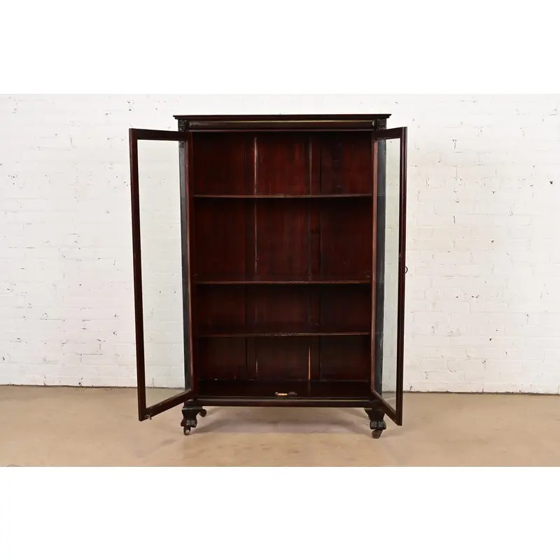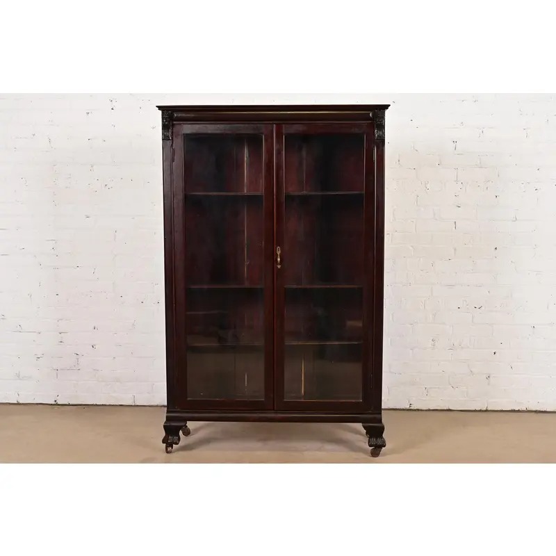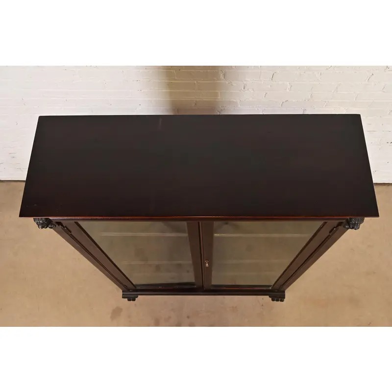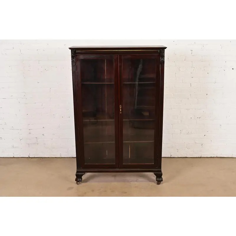 Mahogany, with carved lion heads, and glass front doors. Interior shelves are adjustable.
