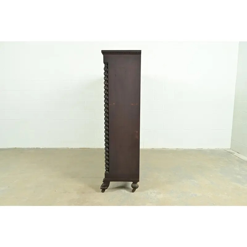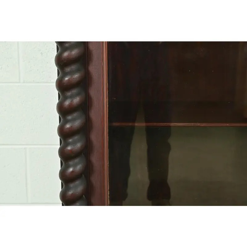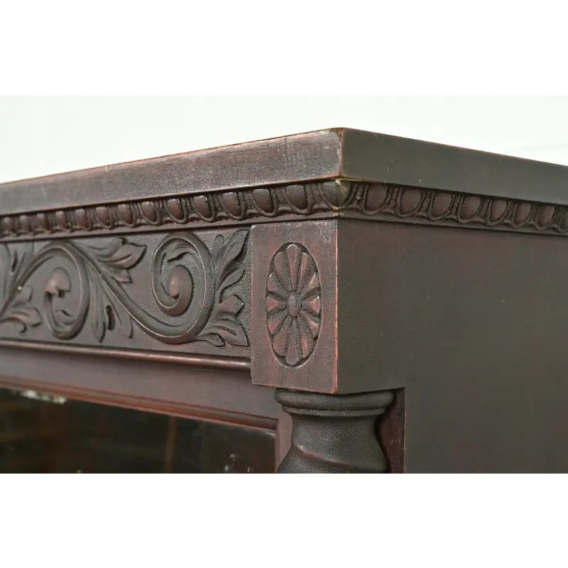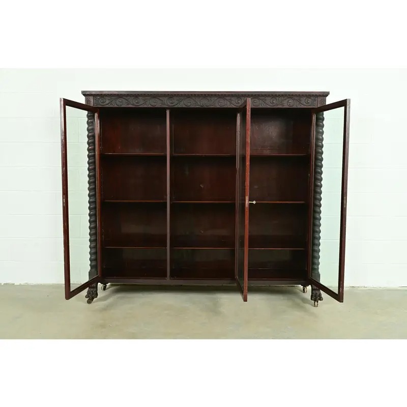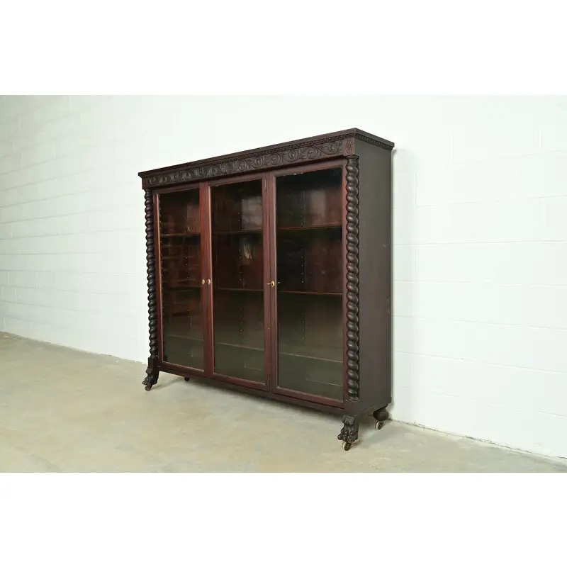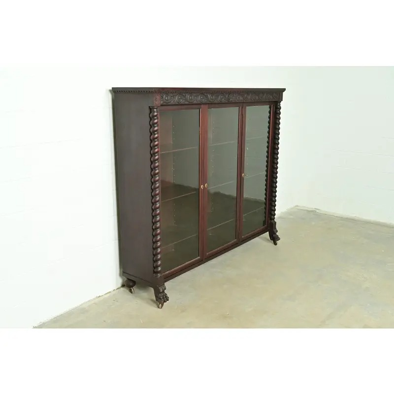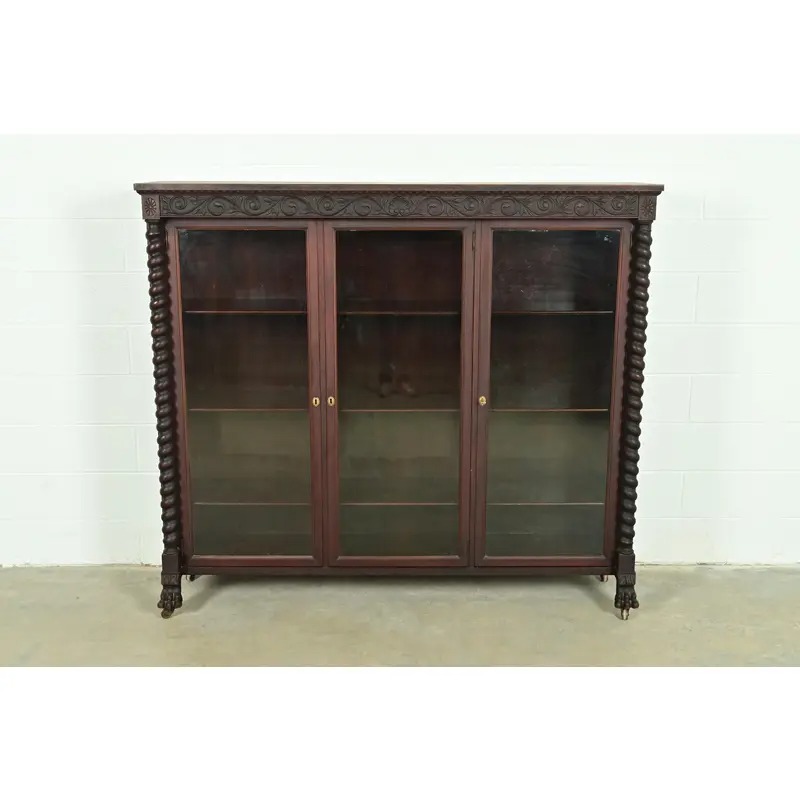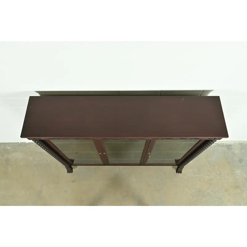 Mahogany, with carved columns and lion paw feet, and glass front doors.
