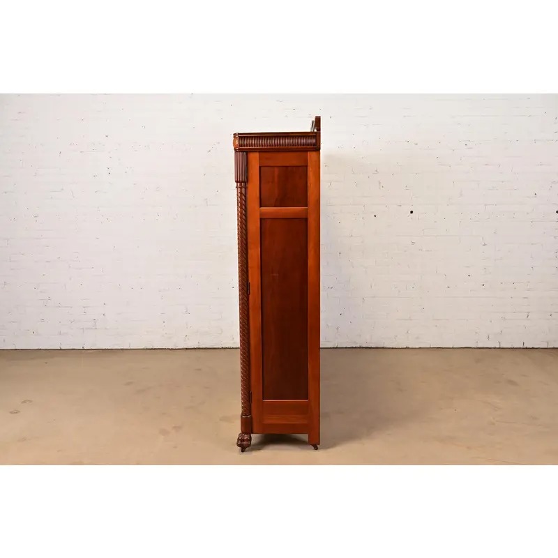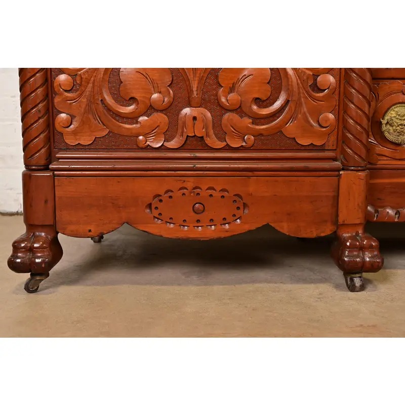 Carved cherry wood, with mirrored back interior, brass hardware, and paw feet.