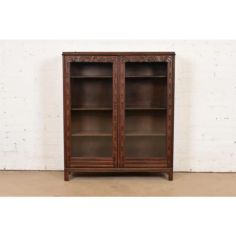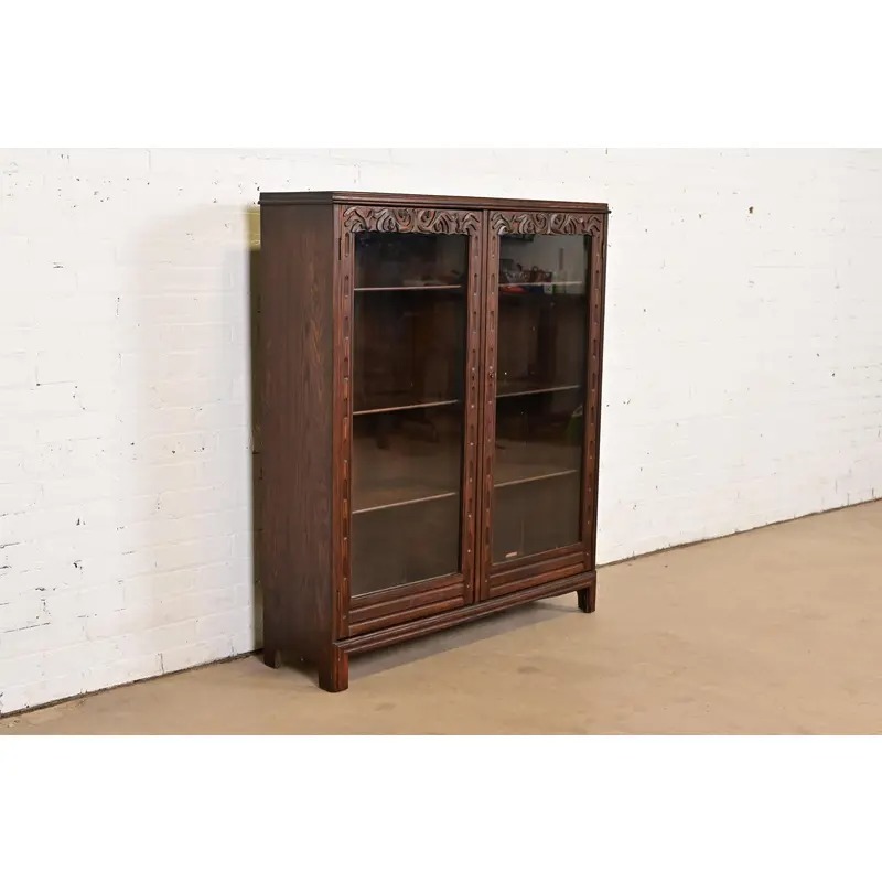 Carved oak, with glass front doors. Interior shelves are adjustable. Cabinet locks, and key is included.