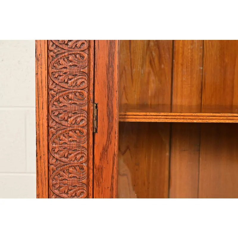 Carved oak, with glass front doors, and original brass hardware.