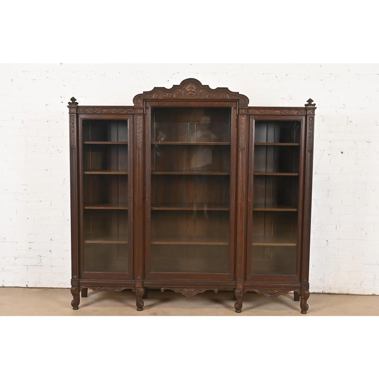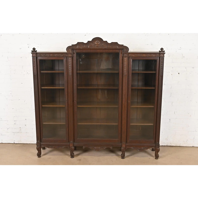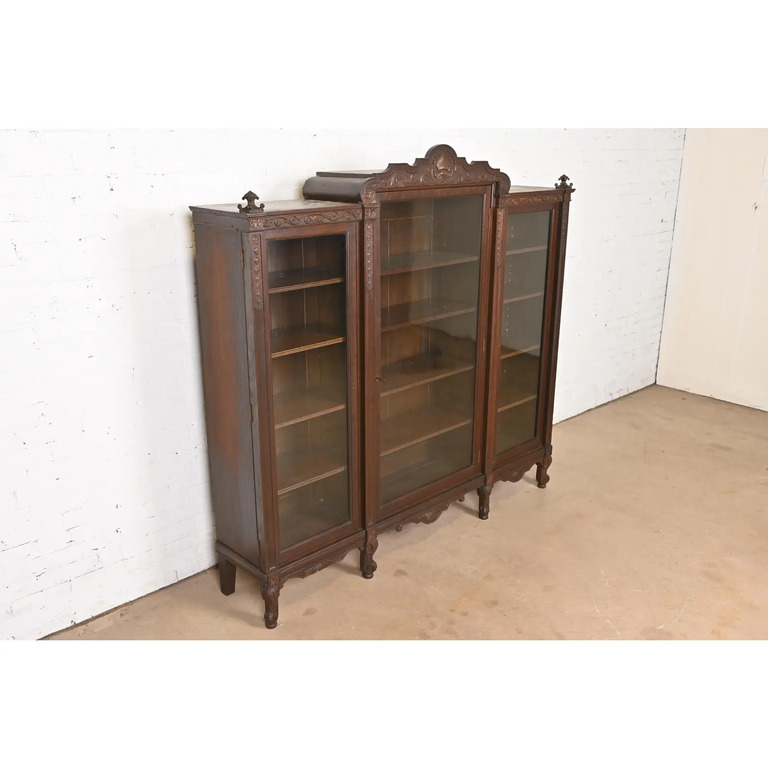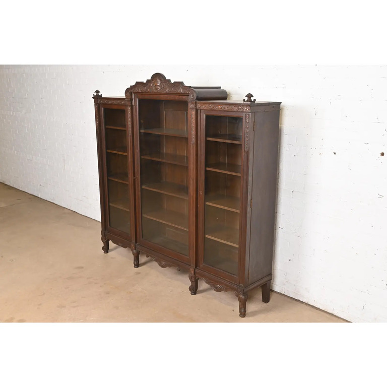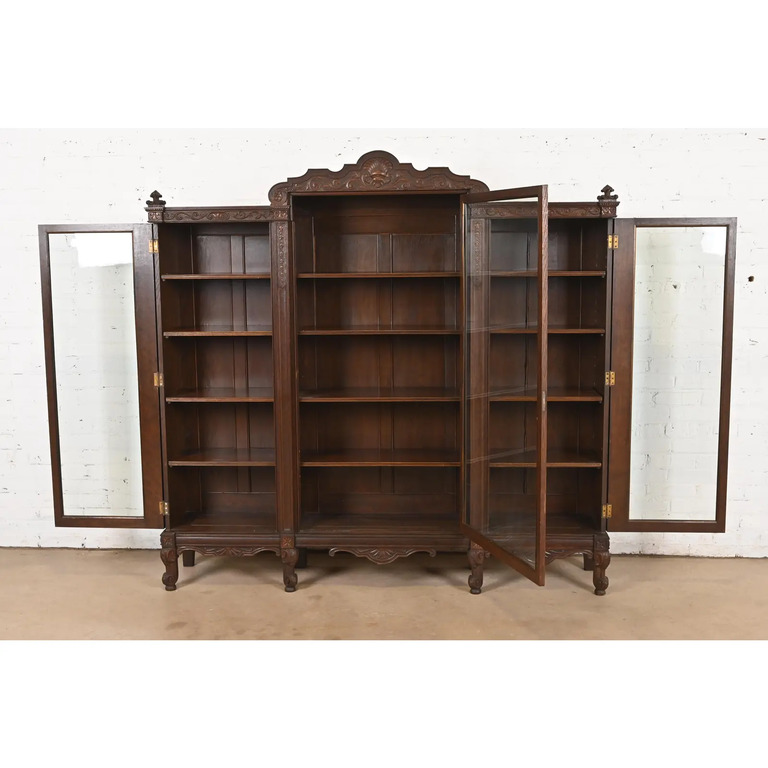 An exceptional antique Victorian or Renaissance Revival triple bookcase cabinet